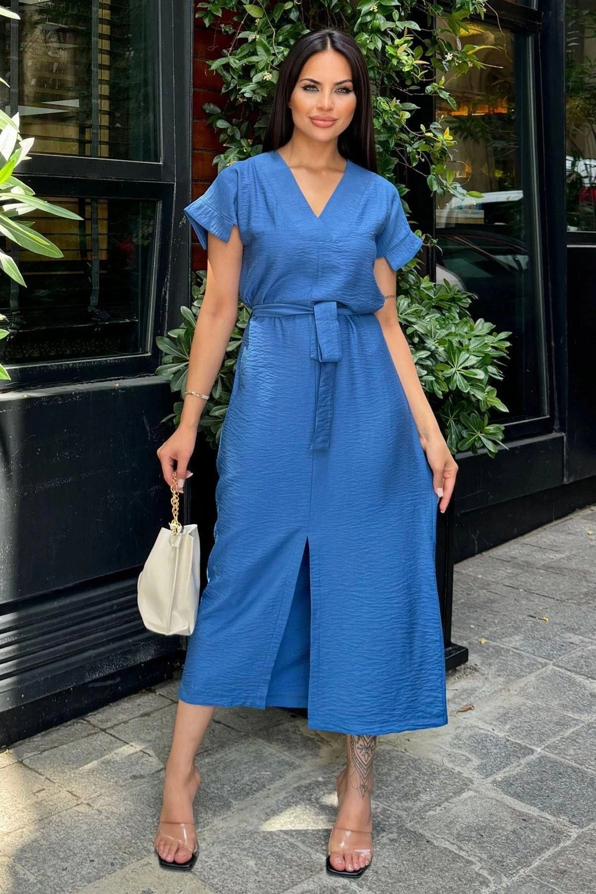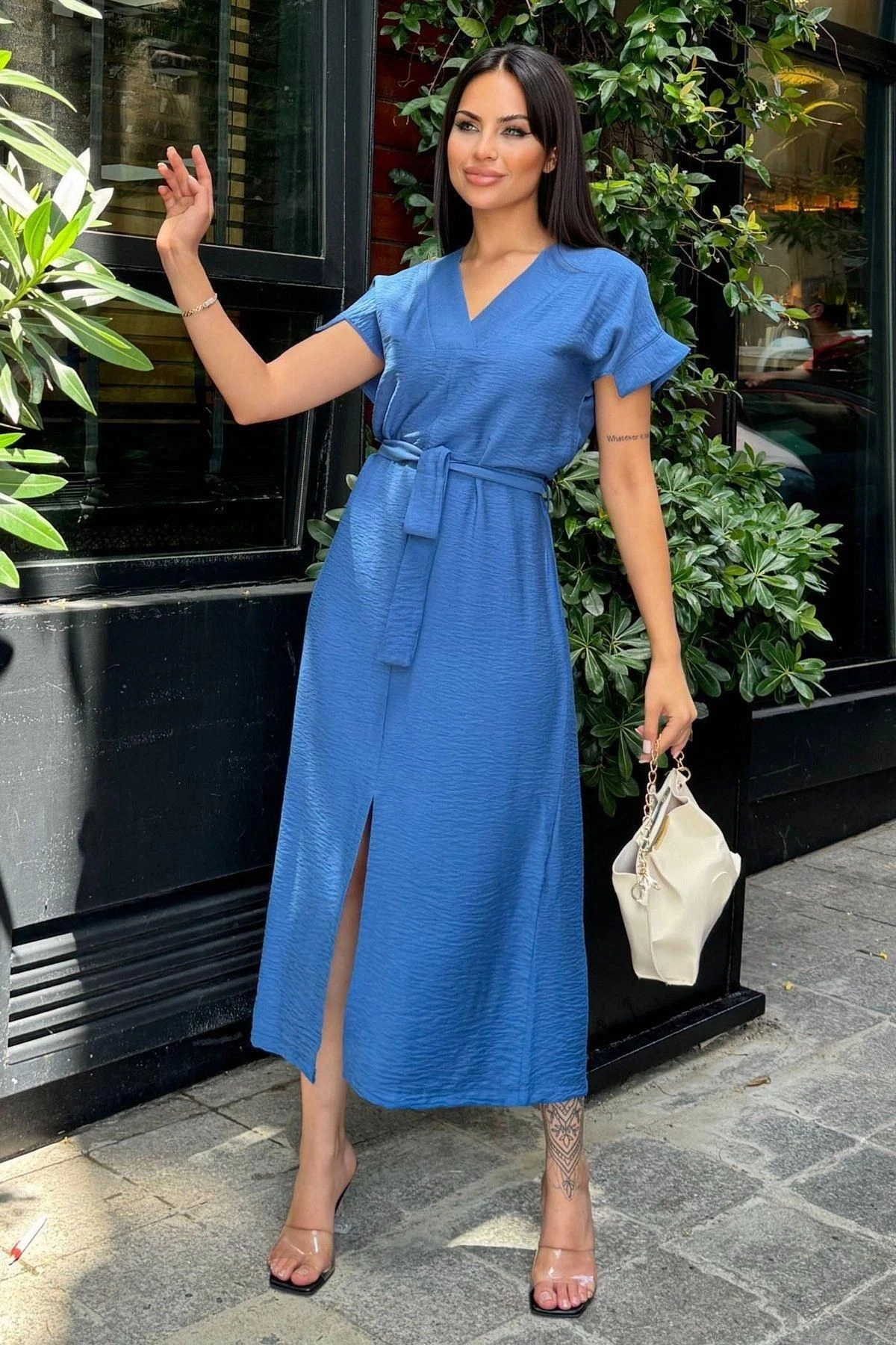 İndigo V Yaka, Kısa Kol, Airobin Kumaş, Omuz Detaylı, Kemerli/Kuşaklı, Önden Yırtmaçlı Maxi Elbise