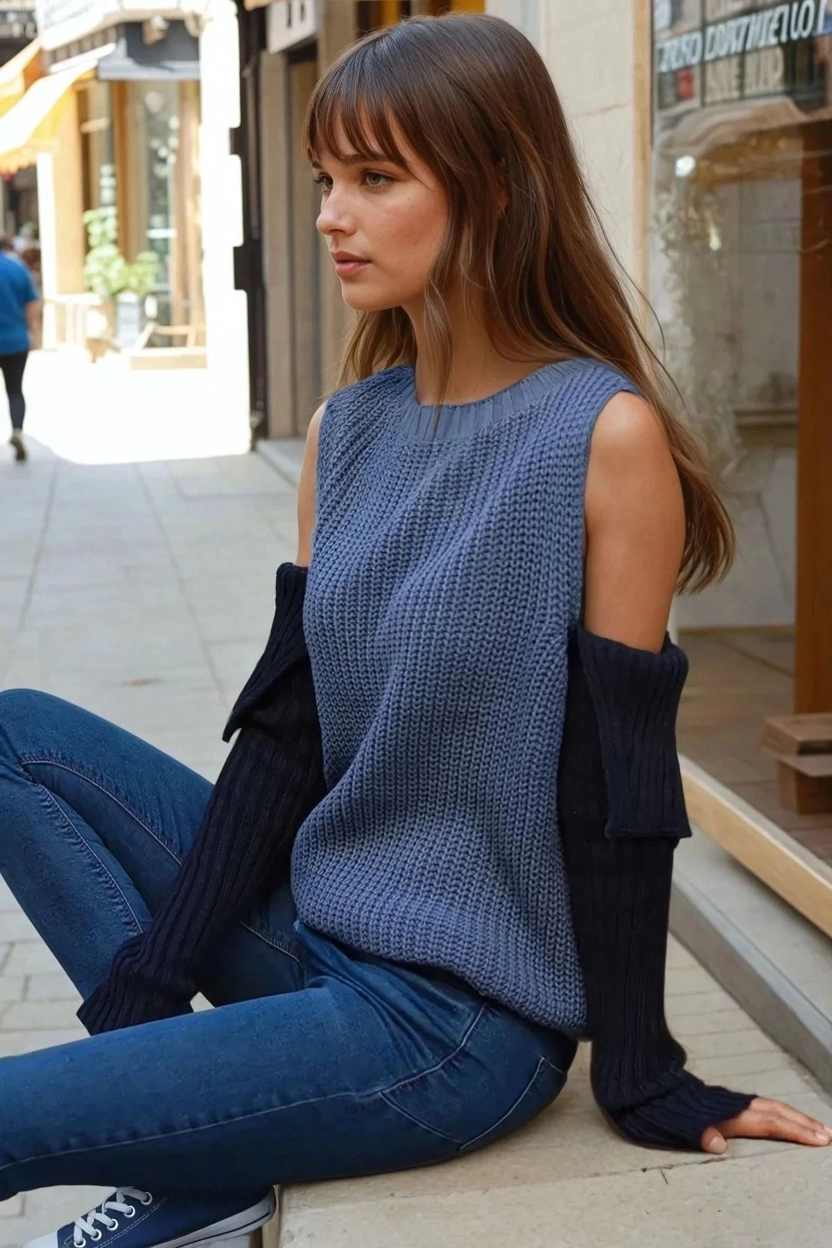 İndigo Ve Lacivert Renk Bloklu, Omuz Dekolteli Şık Triko Kazak
