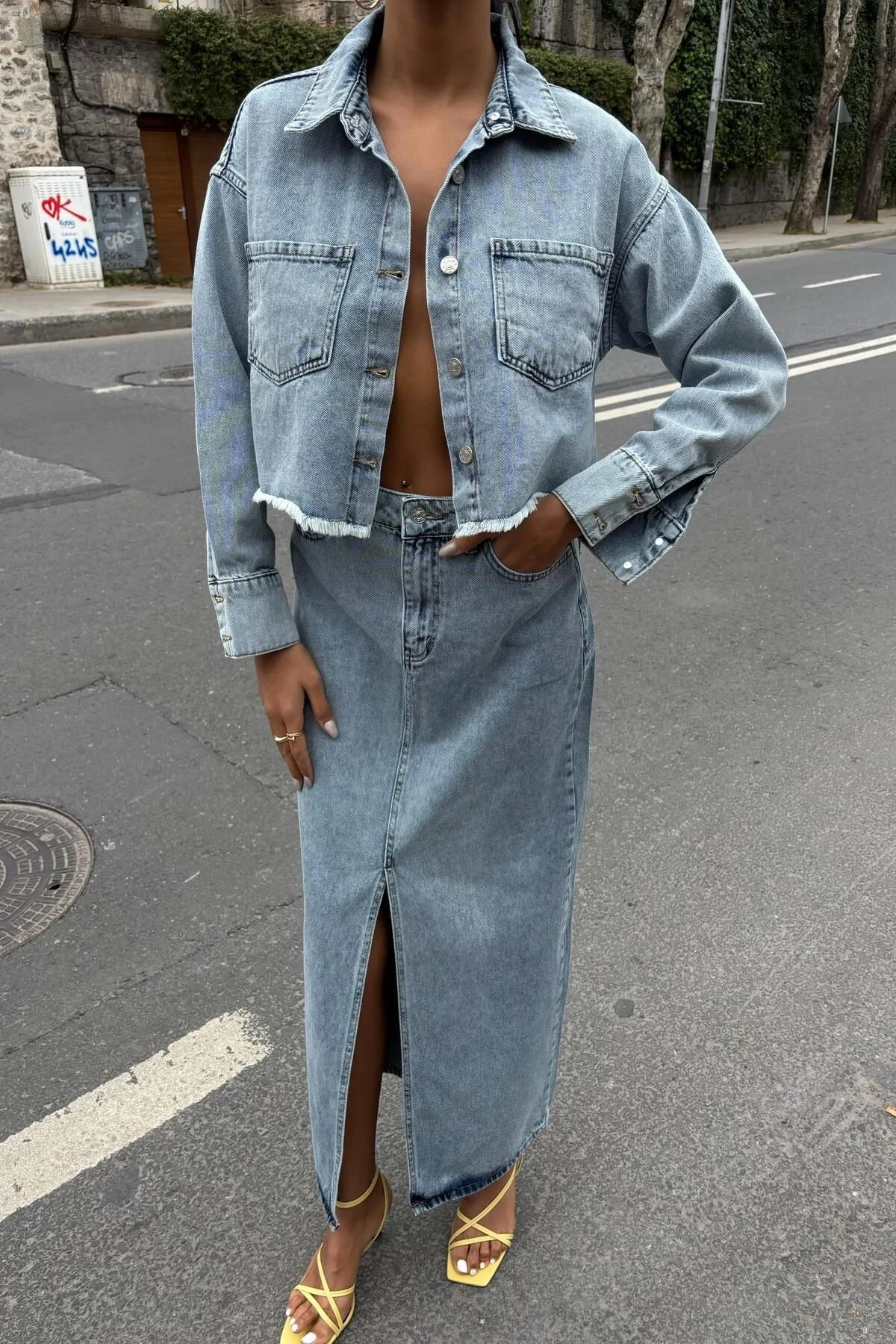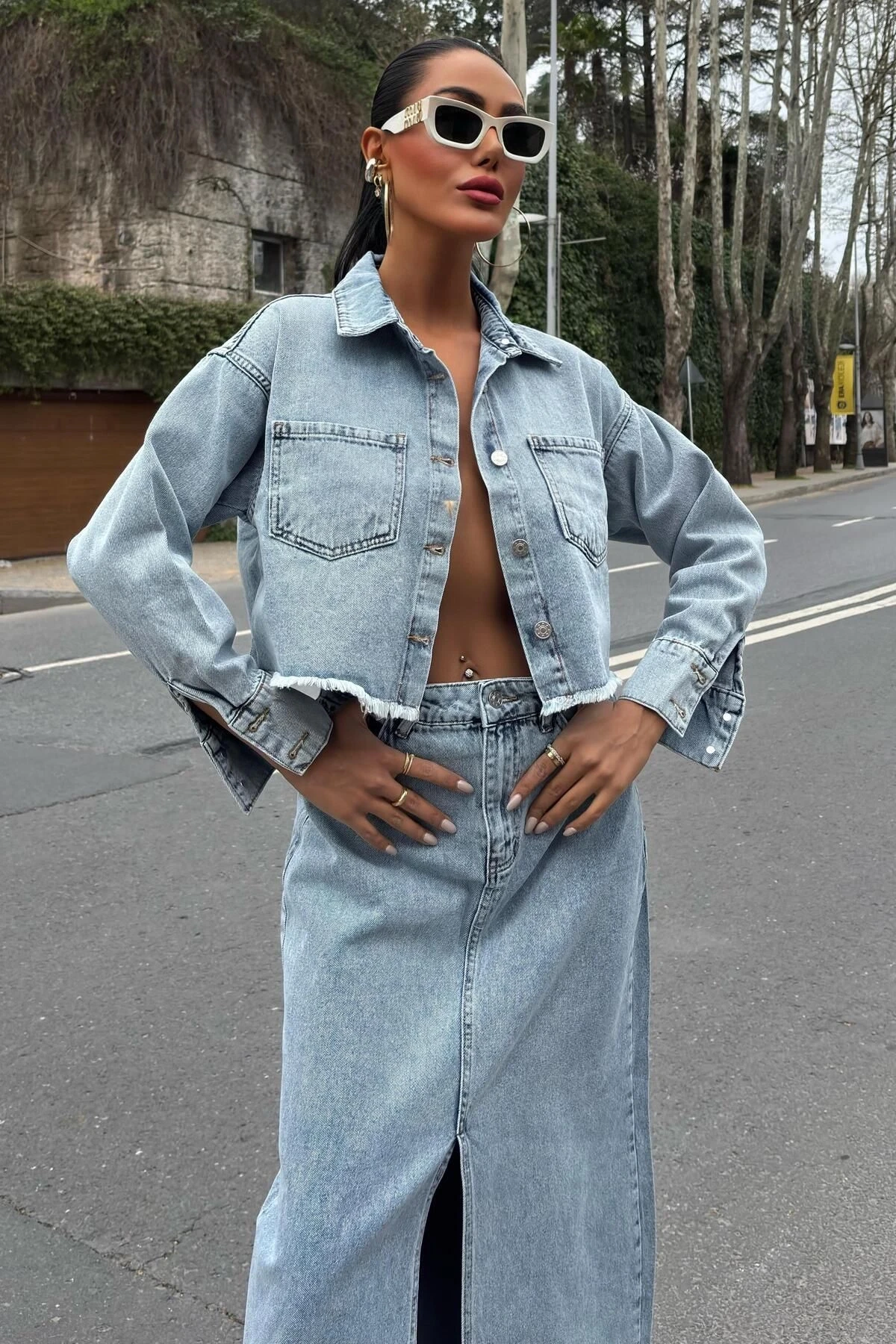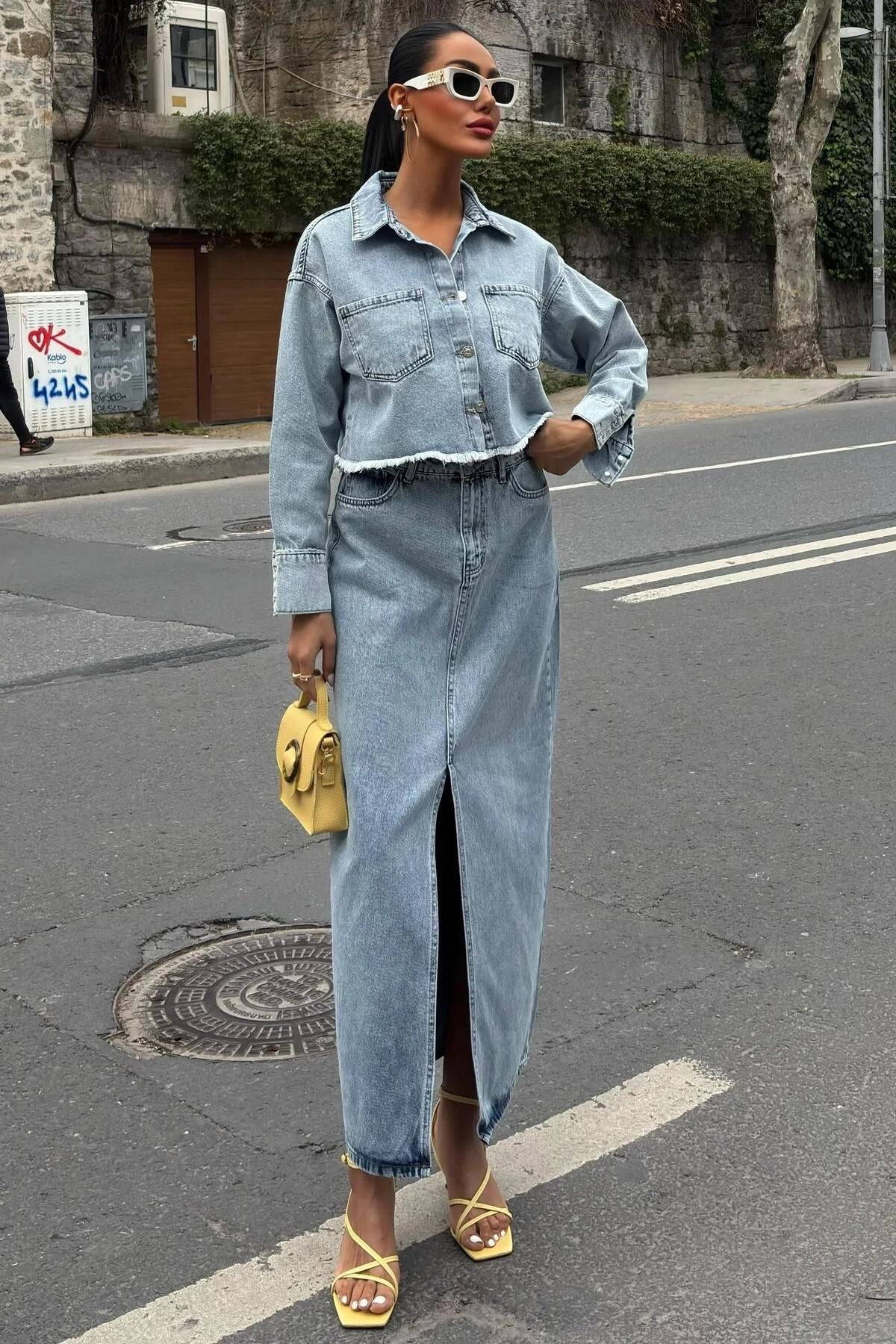 Kadın Açık Mavi Cotton Crop Polo Yaka Denim Takım