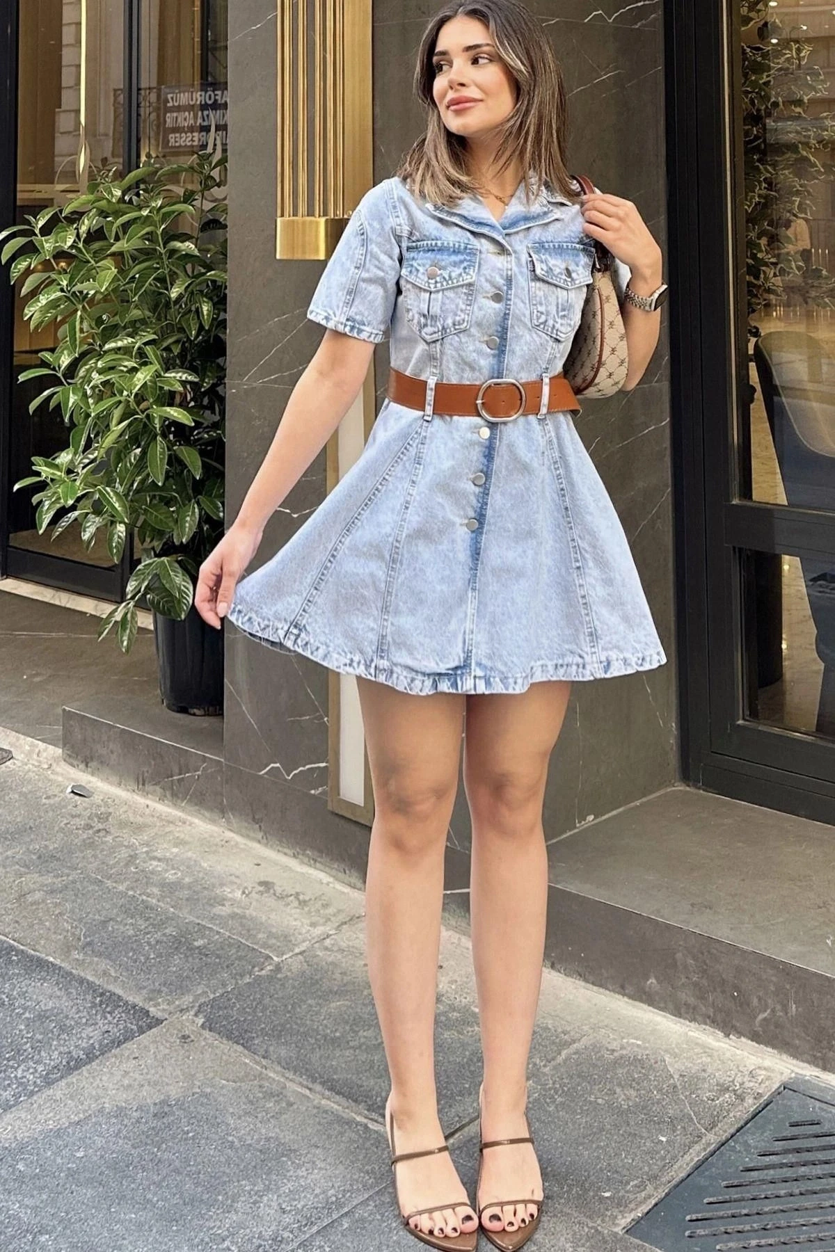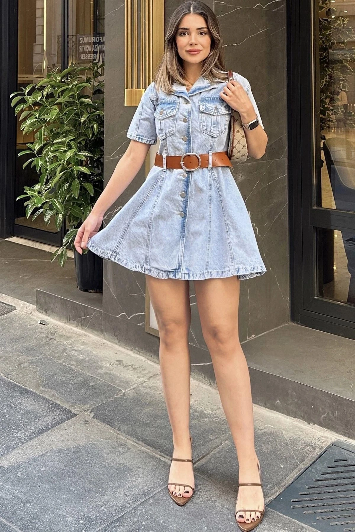 Kadın Açık Mavi Kısa Kollu, A Kesim, Rahat Kalıp, Kısa Kot Elbise - Kemer Hediyeli