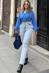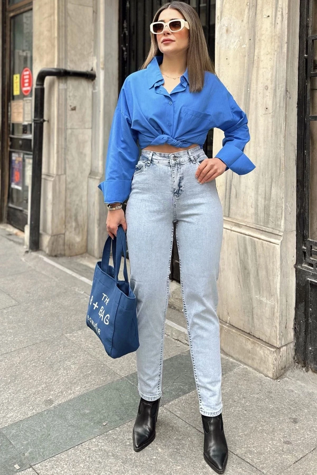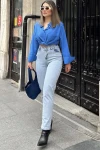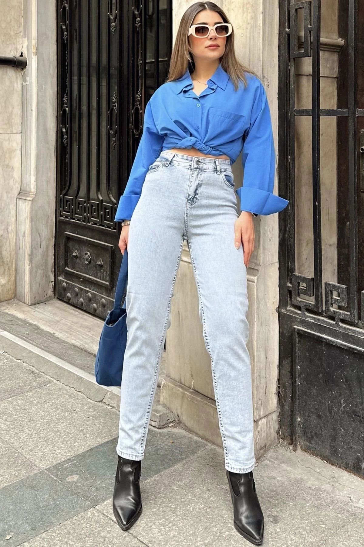 Kadın Açık Mavi Yüksek Bel, Rahat Kesim, Boru Paça, Skinny Kot Pantolon - Jeans