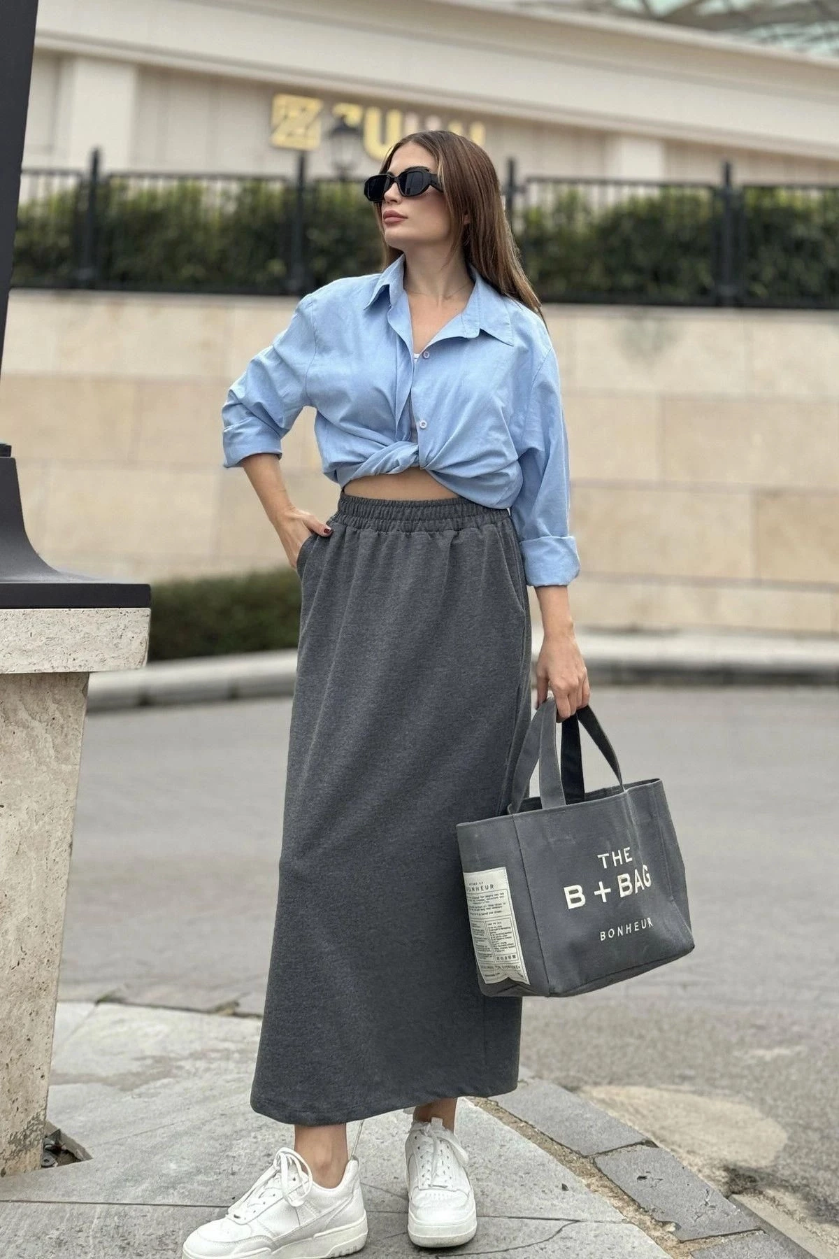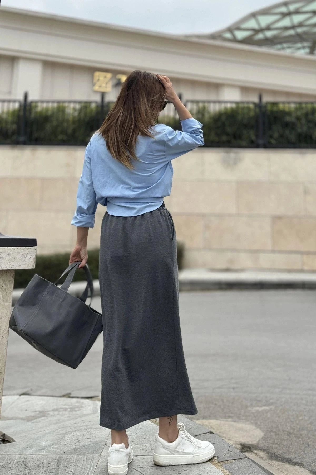 Kadın Antrasit Beli Lastikli, Rahat Kalıp, Cepli Uzun Etek
