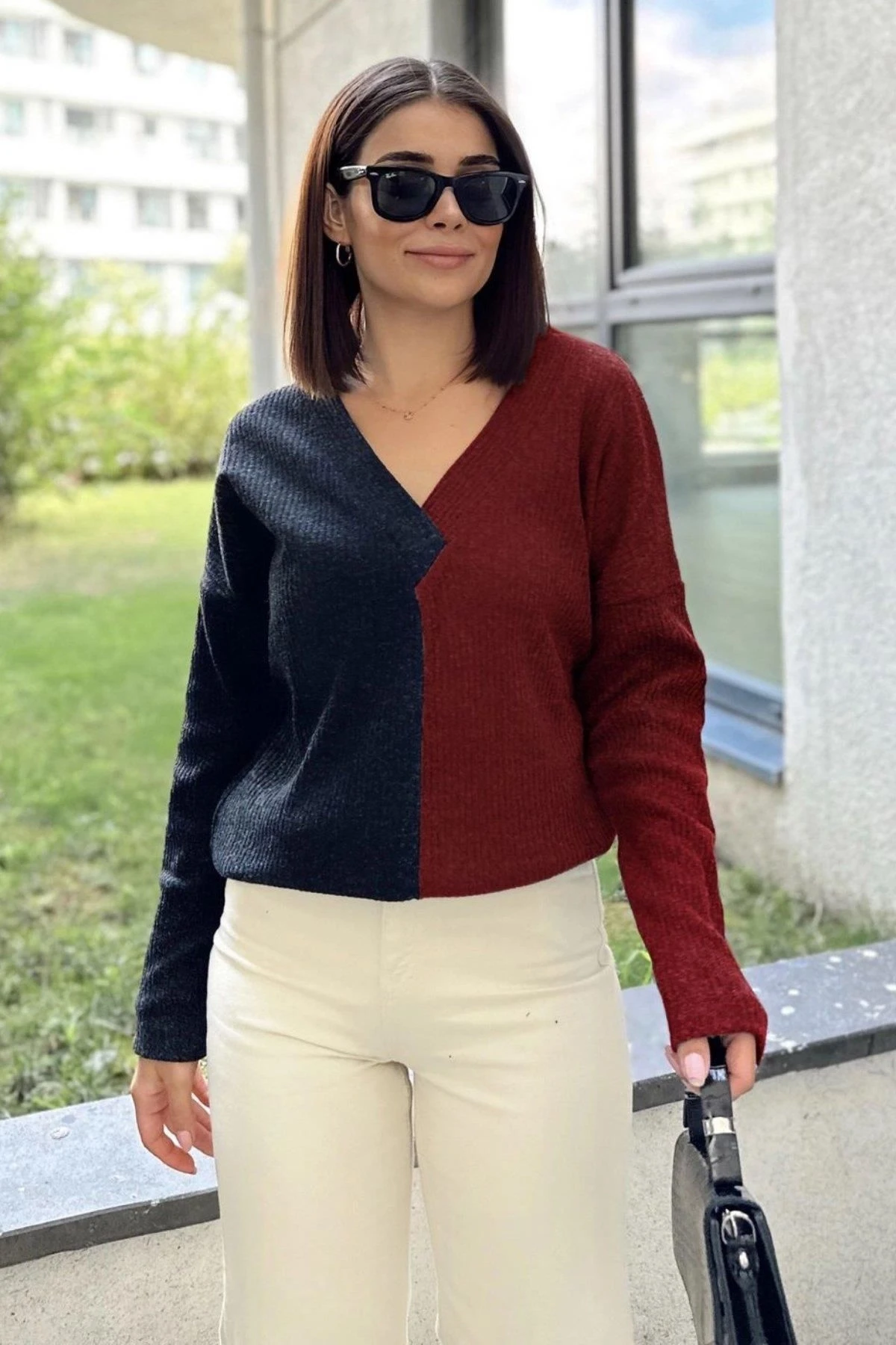 Kadın Antrasit & Bordo Günlük Stil V Yaka Color Block, Uzun Kol Kazak Bluz, Pamuklu Sweatshirt