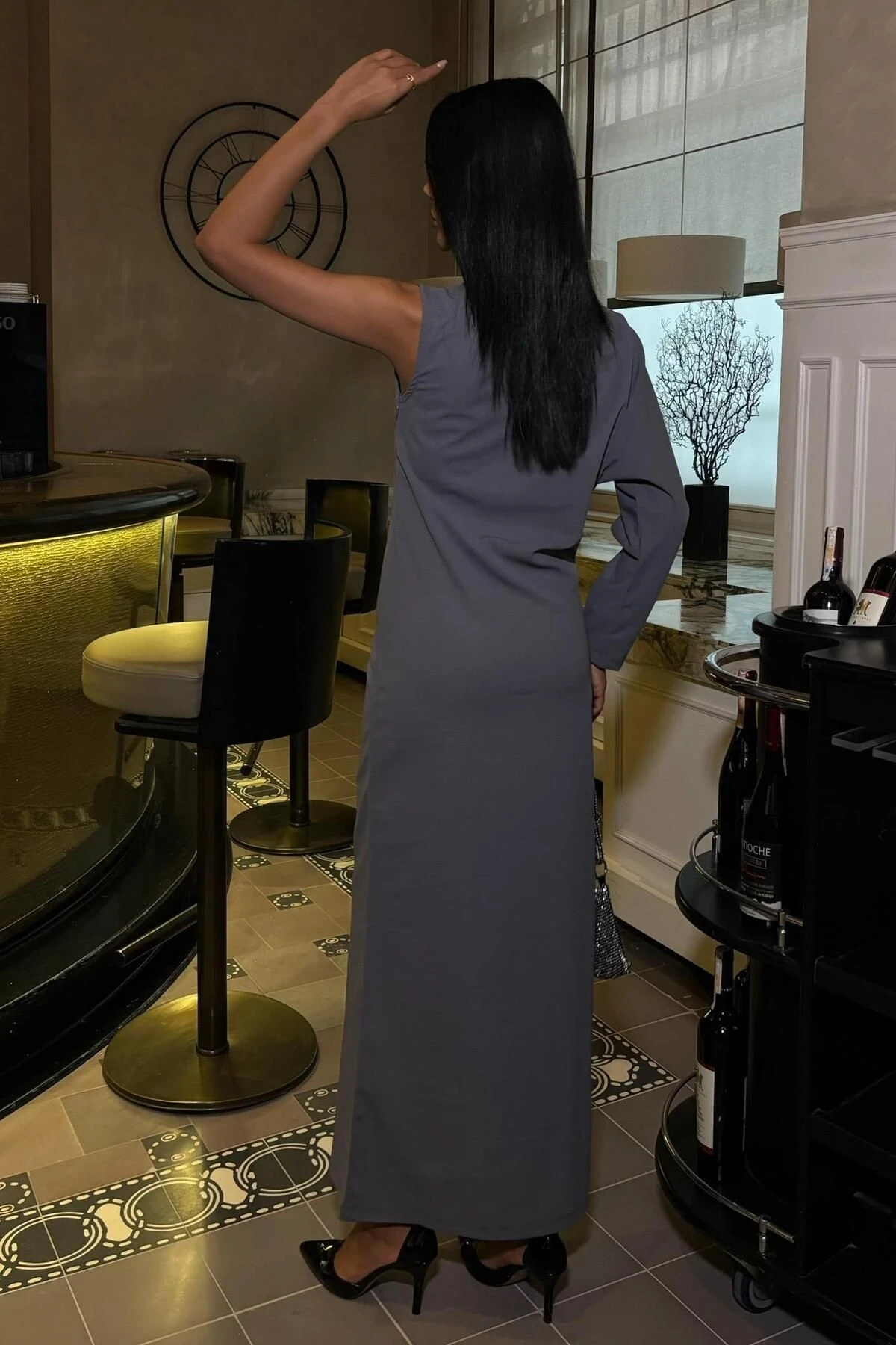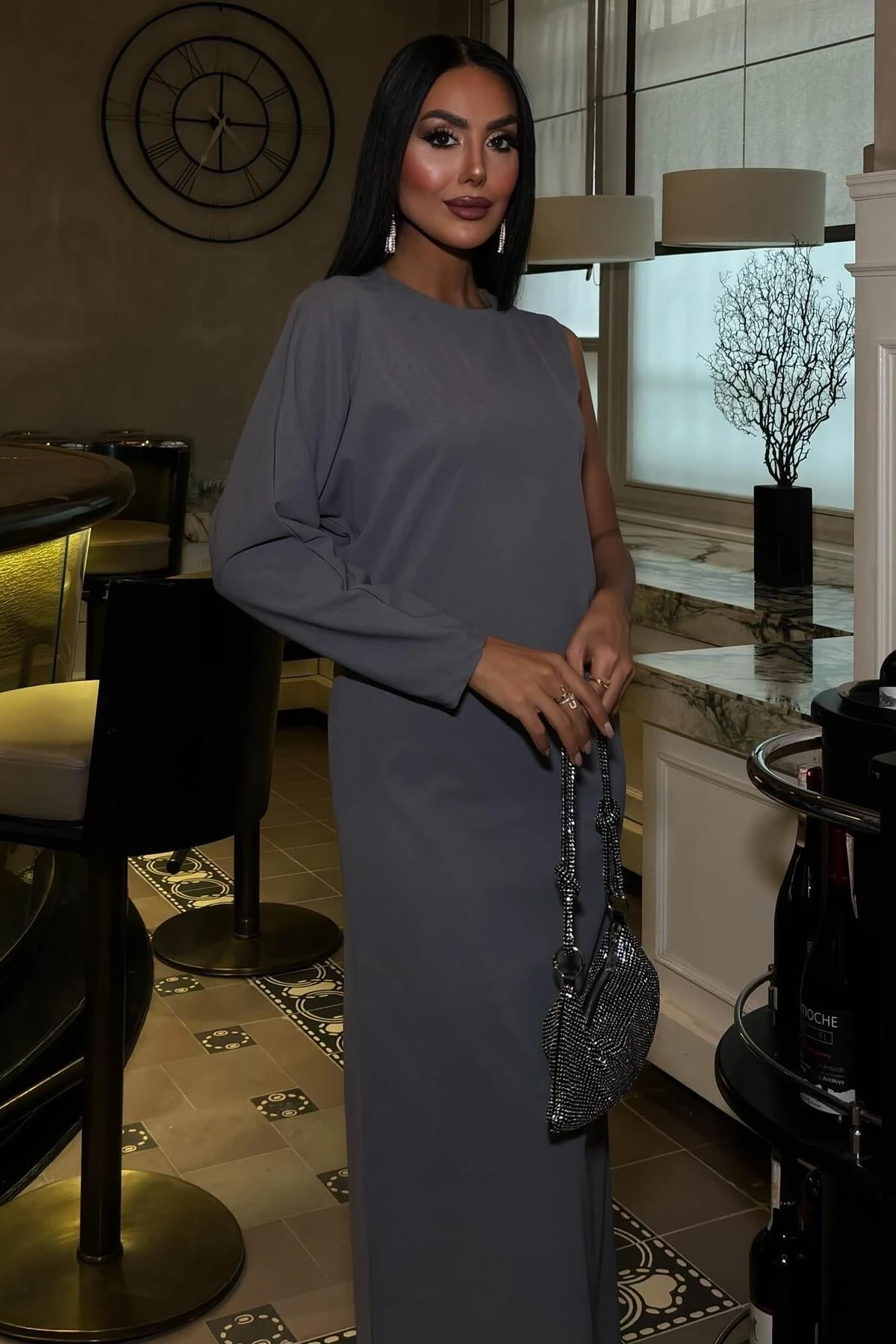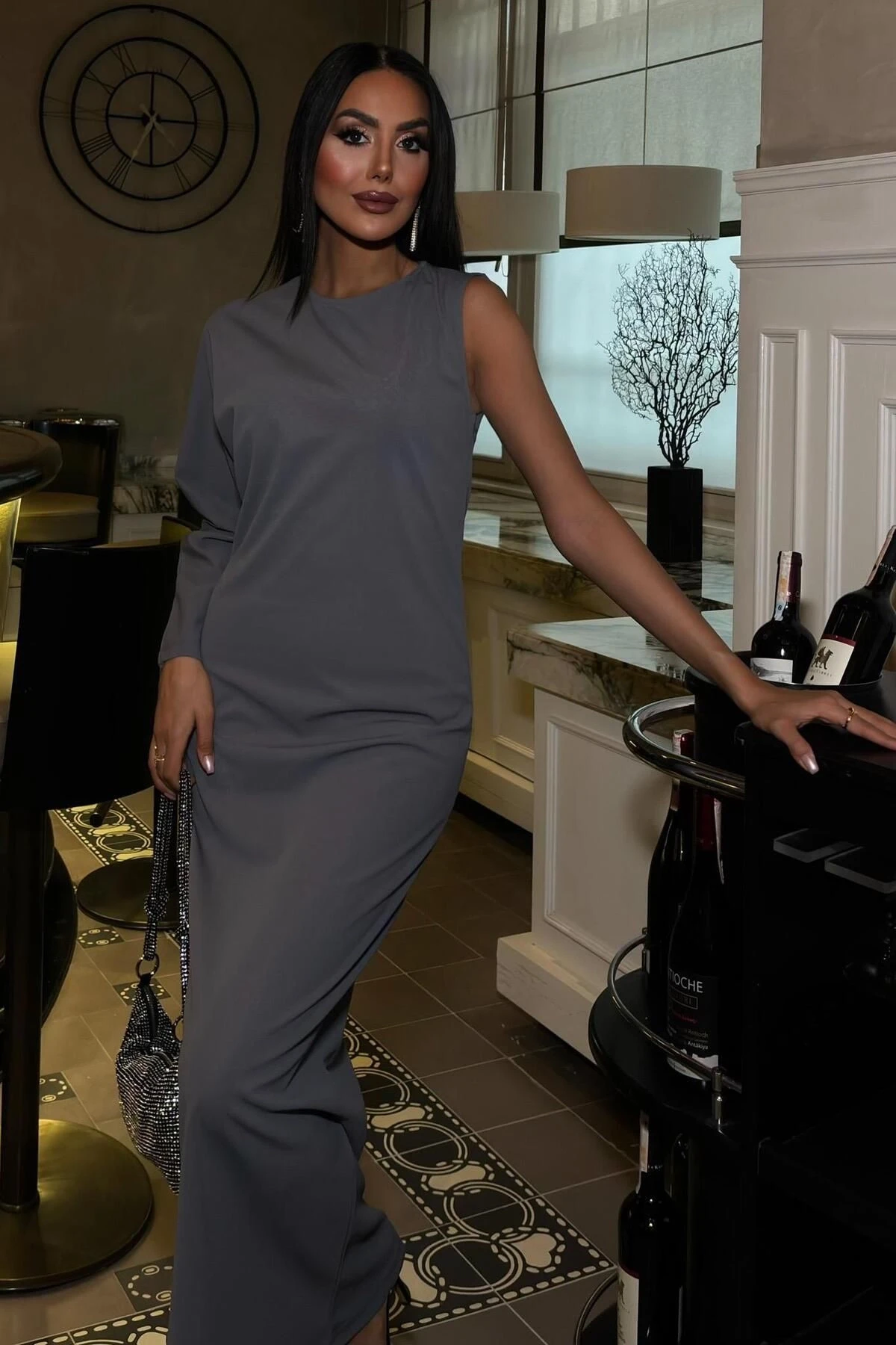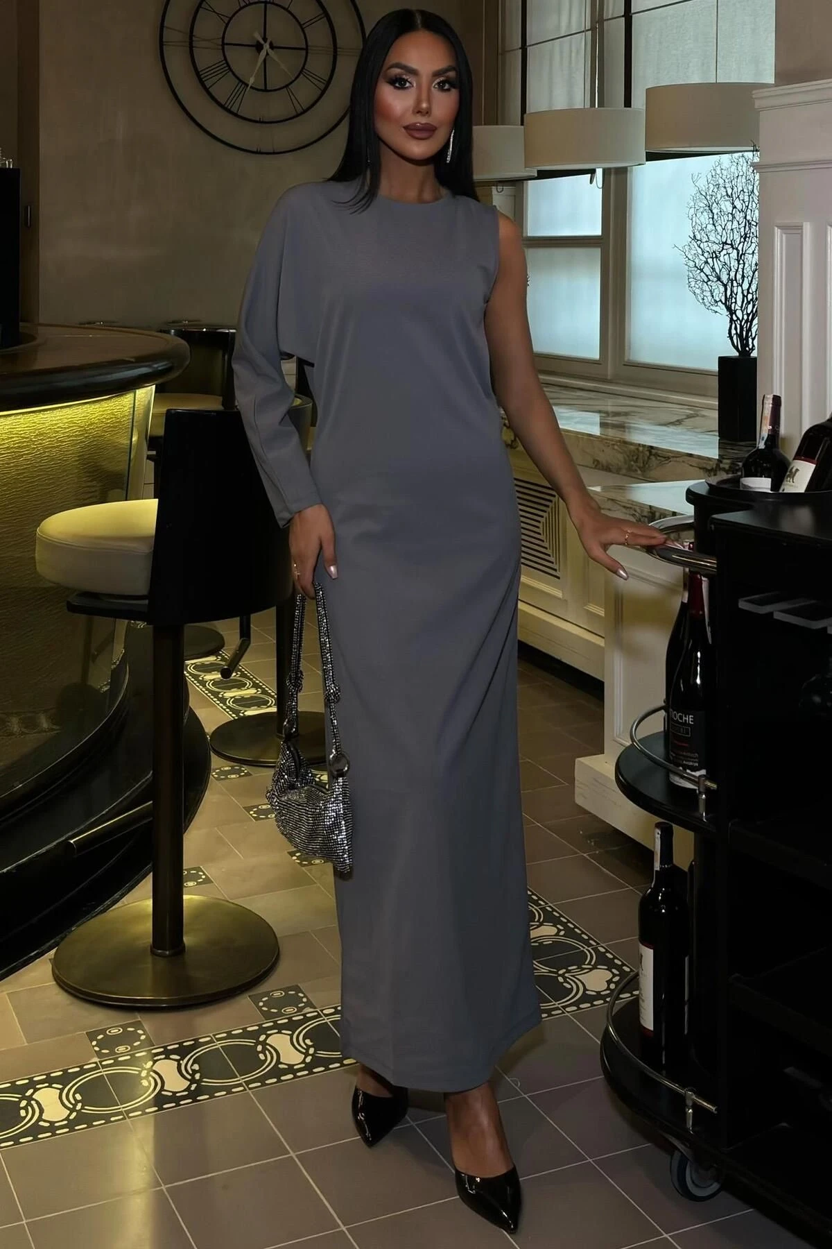 Kadın Antrasit Dokuma Tek Kol Uzun Elbise