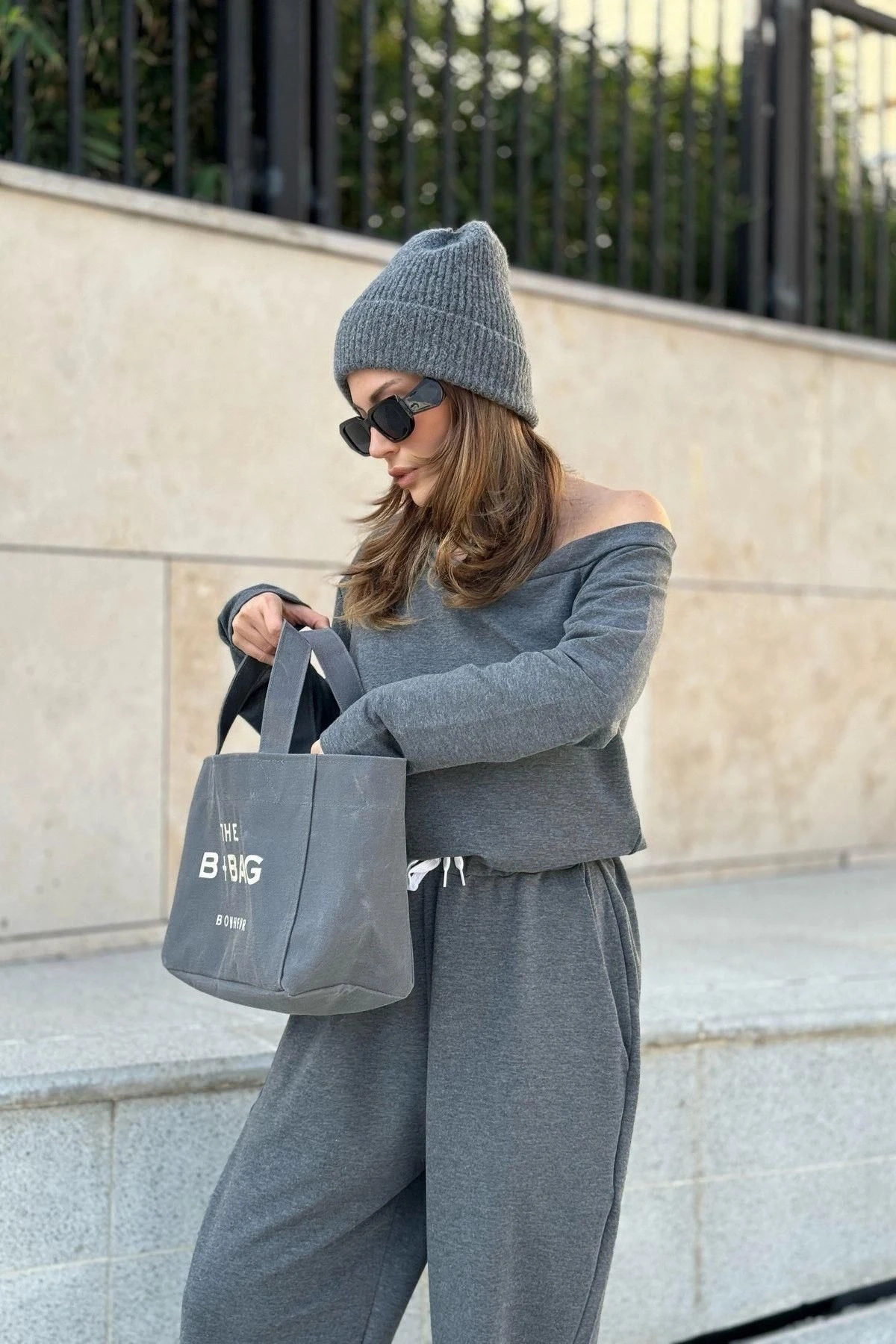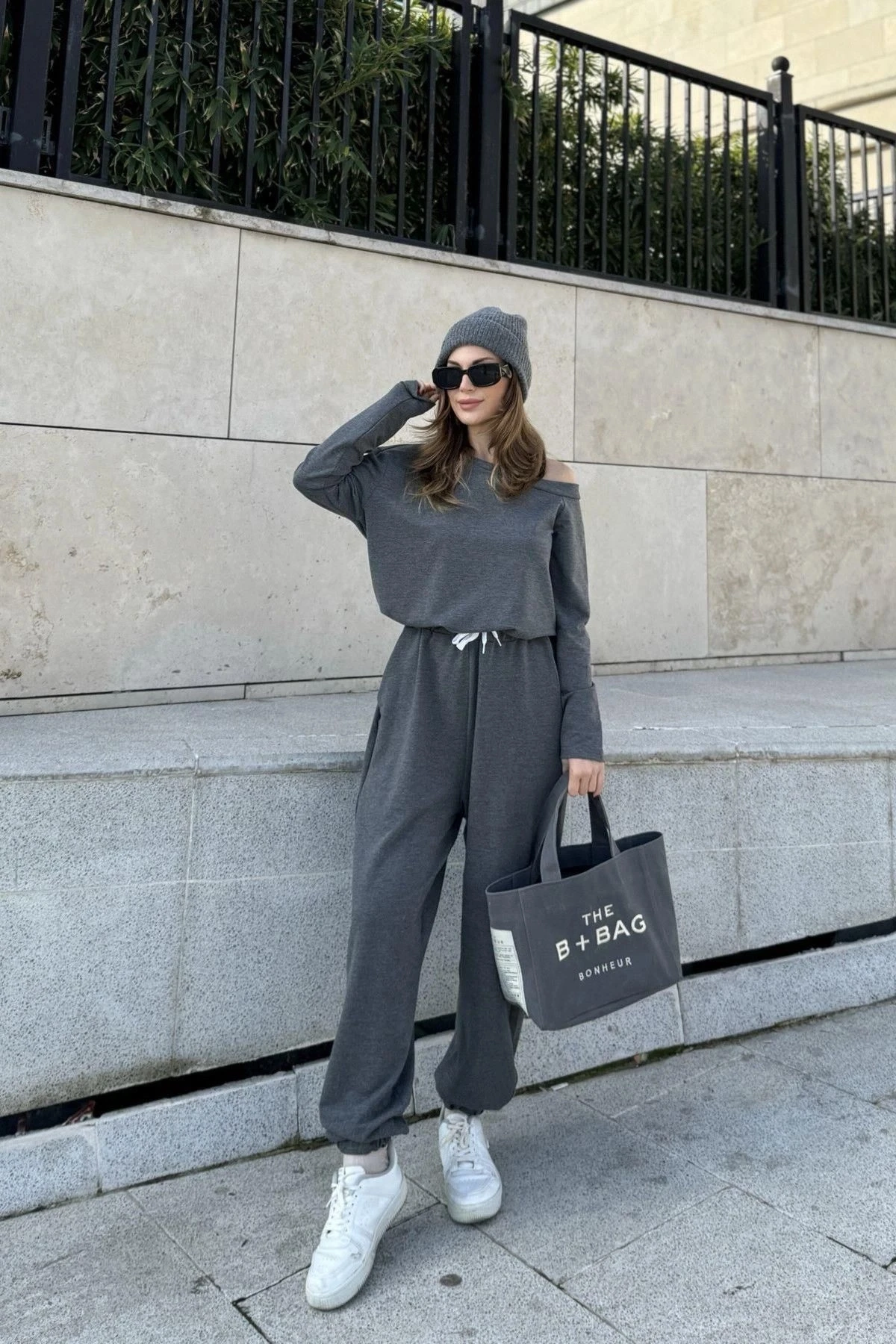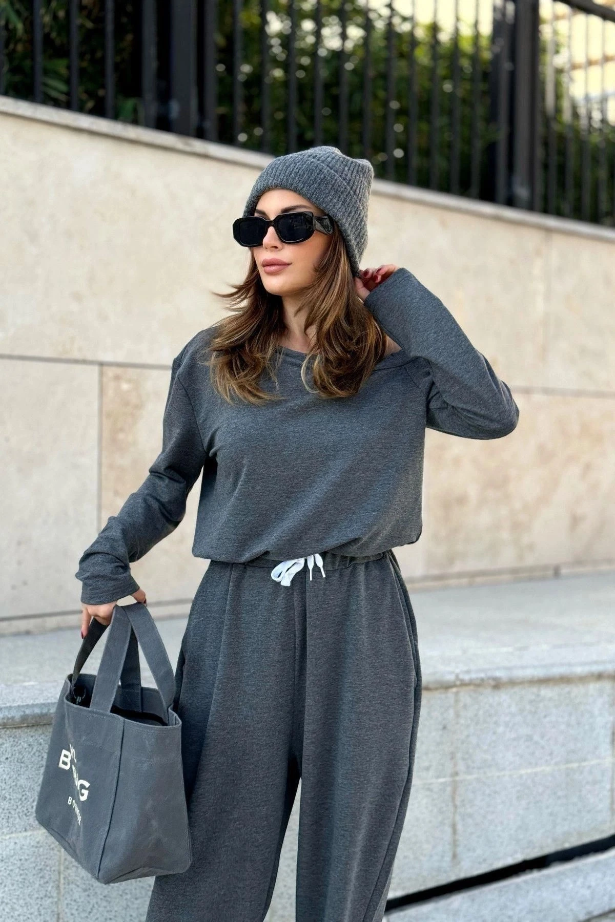 Kadın Antrasit Geniş Yaka, Beli Bağcıklı, Paçaları Lastikli Uzun Kol Salaş Tulum