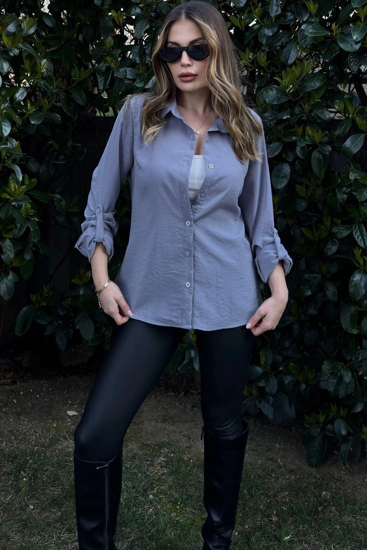 Kadın Antrasit Gümüş Klasik Yaka Uzun Kol Regular Kesim Standart Boy Gömlek (Özel Kumaş)