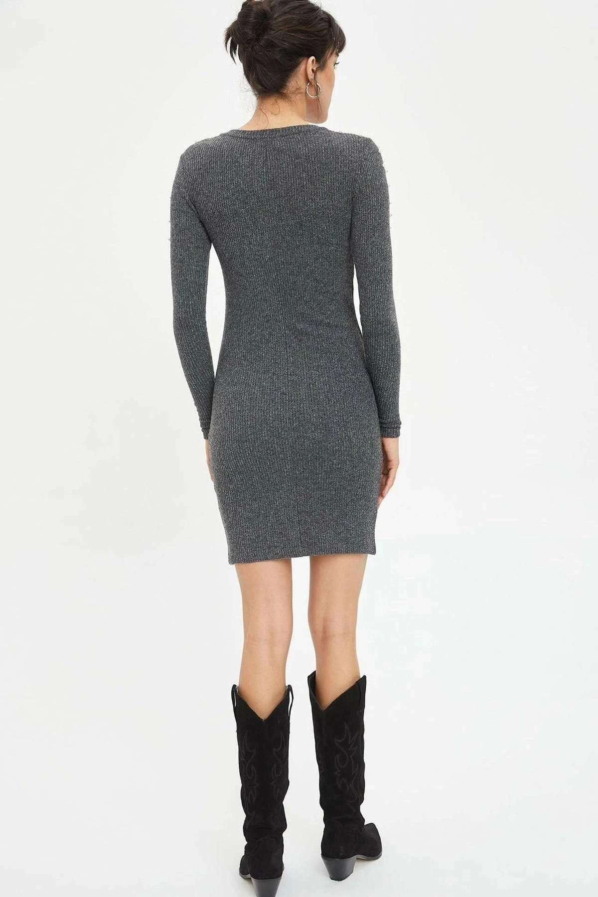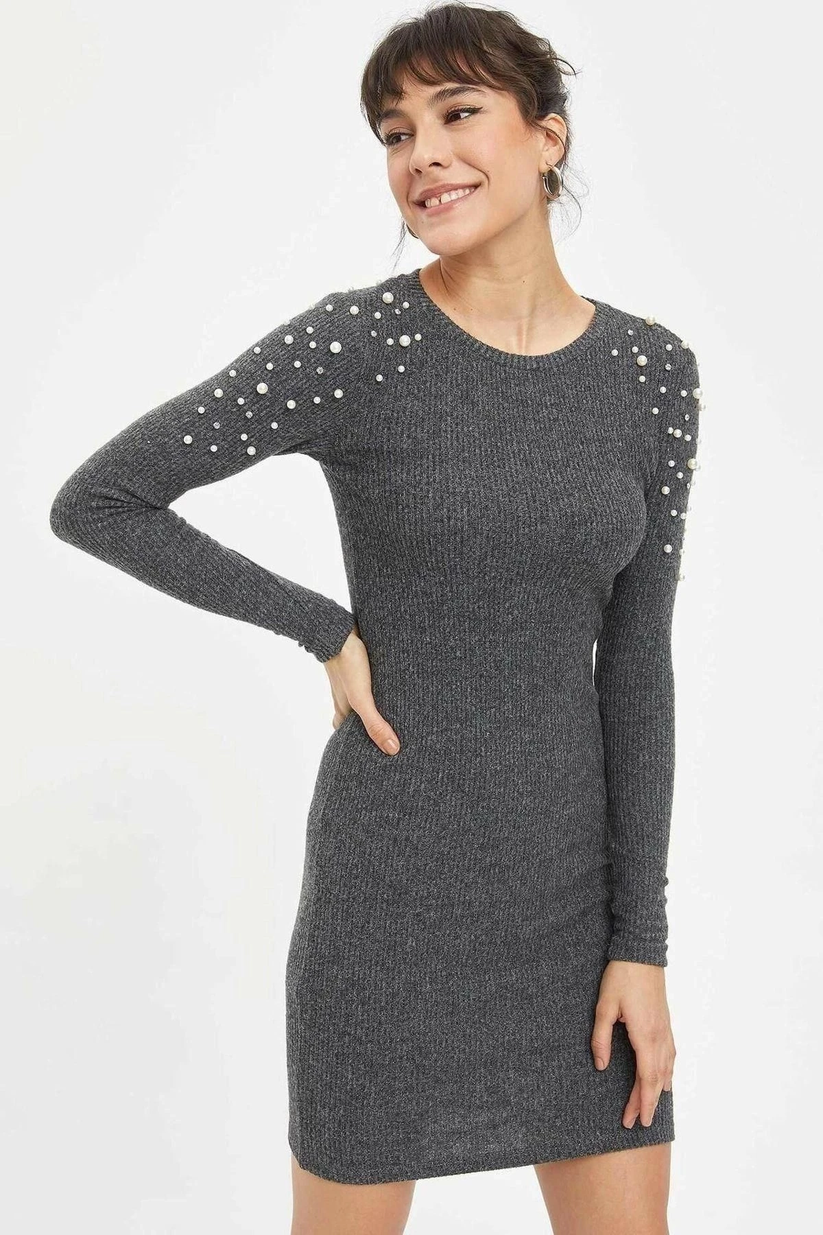 Kadın Antrasit İnci Detaylı Yuvarlak Yaka Uzun Kol Yumuşak Dokulu Midi Boy Diz üstü Elbise