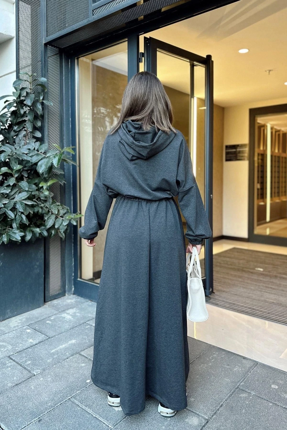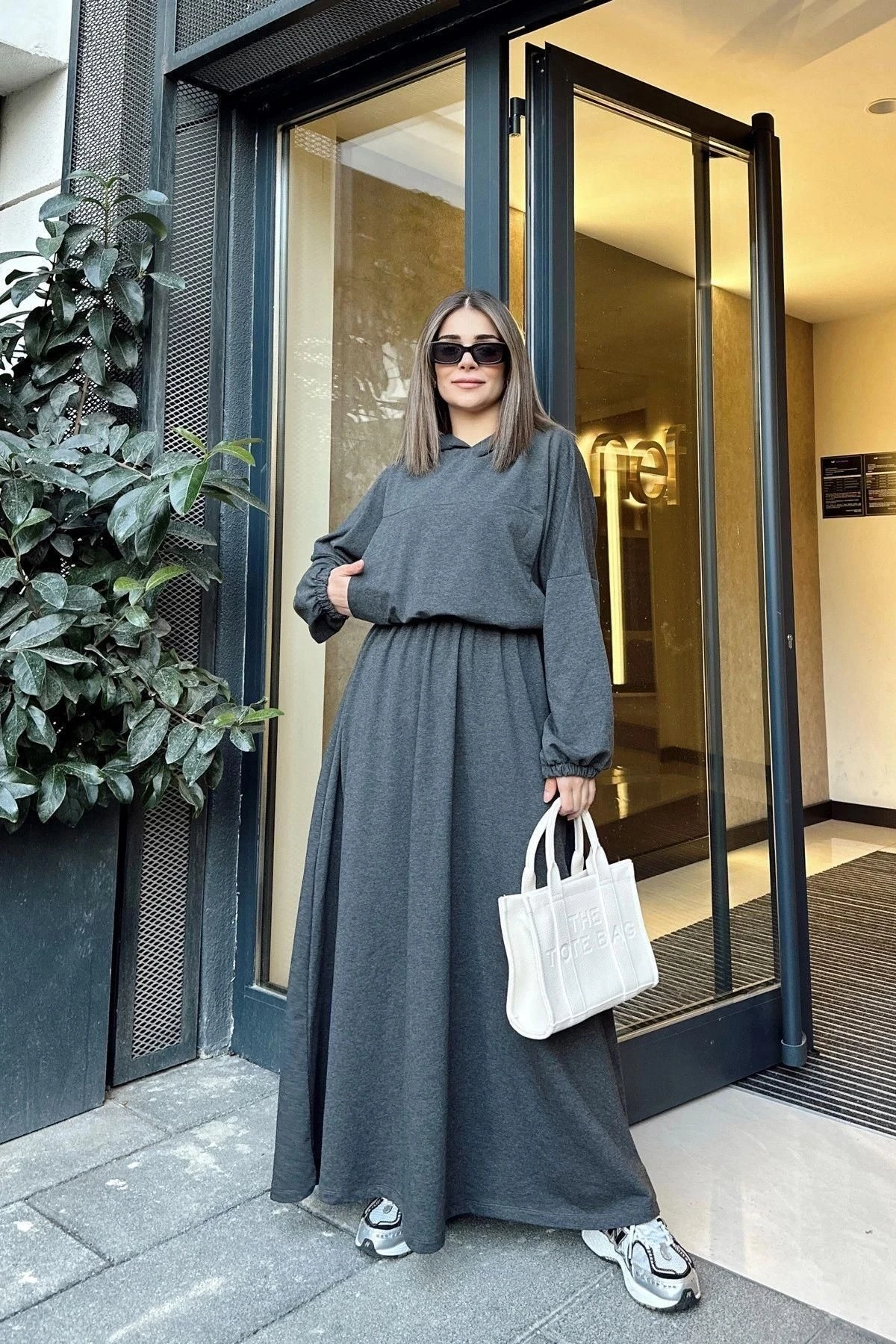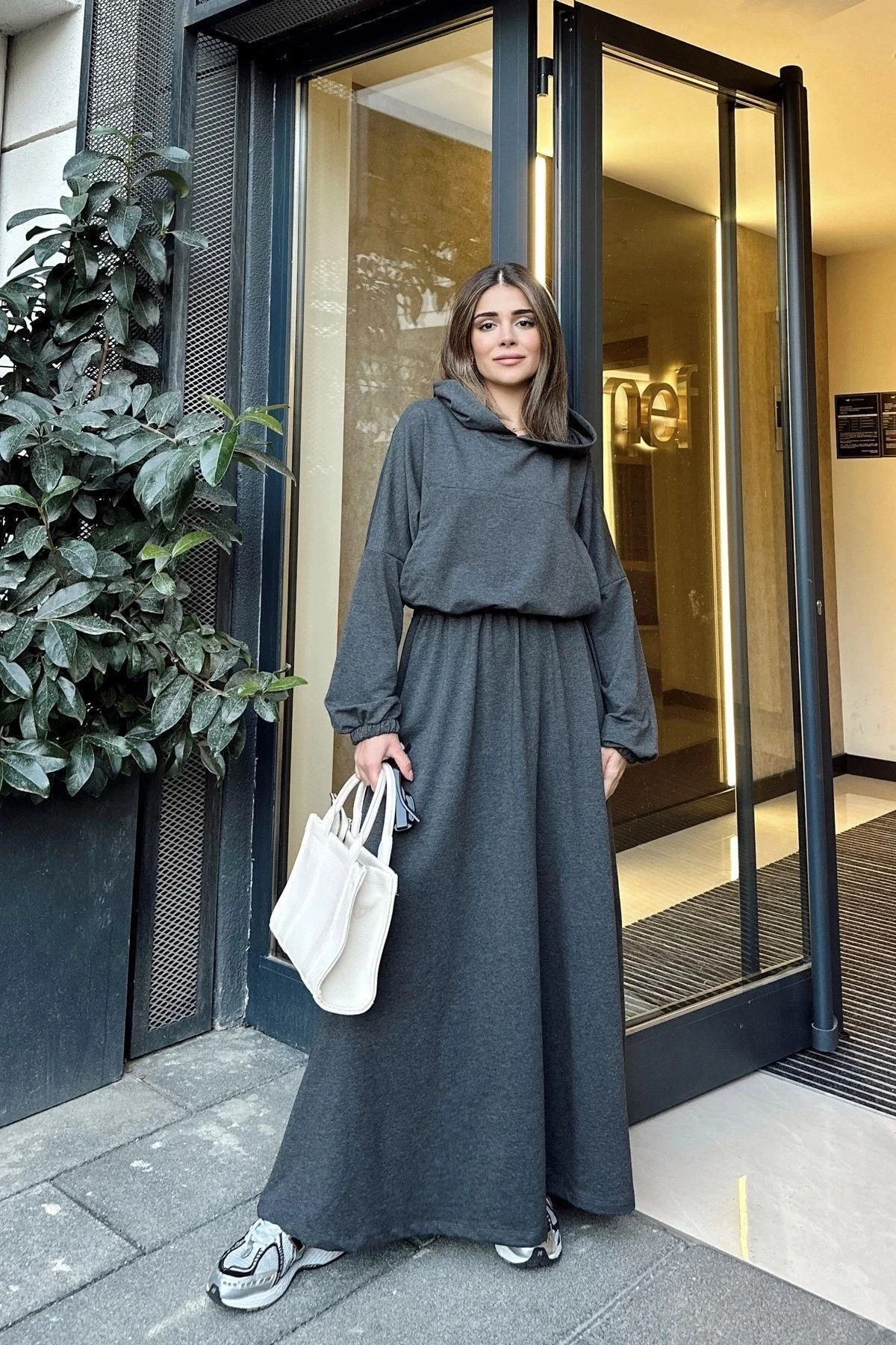 Kadın Antrasit Kapüşonlu, Kanguru Cep Detaylı, Beli Lastikli, Salaş Uzun Elbise
