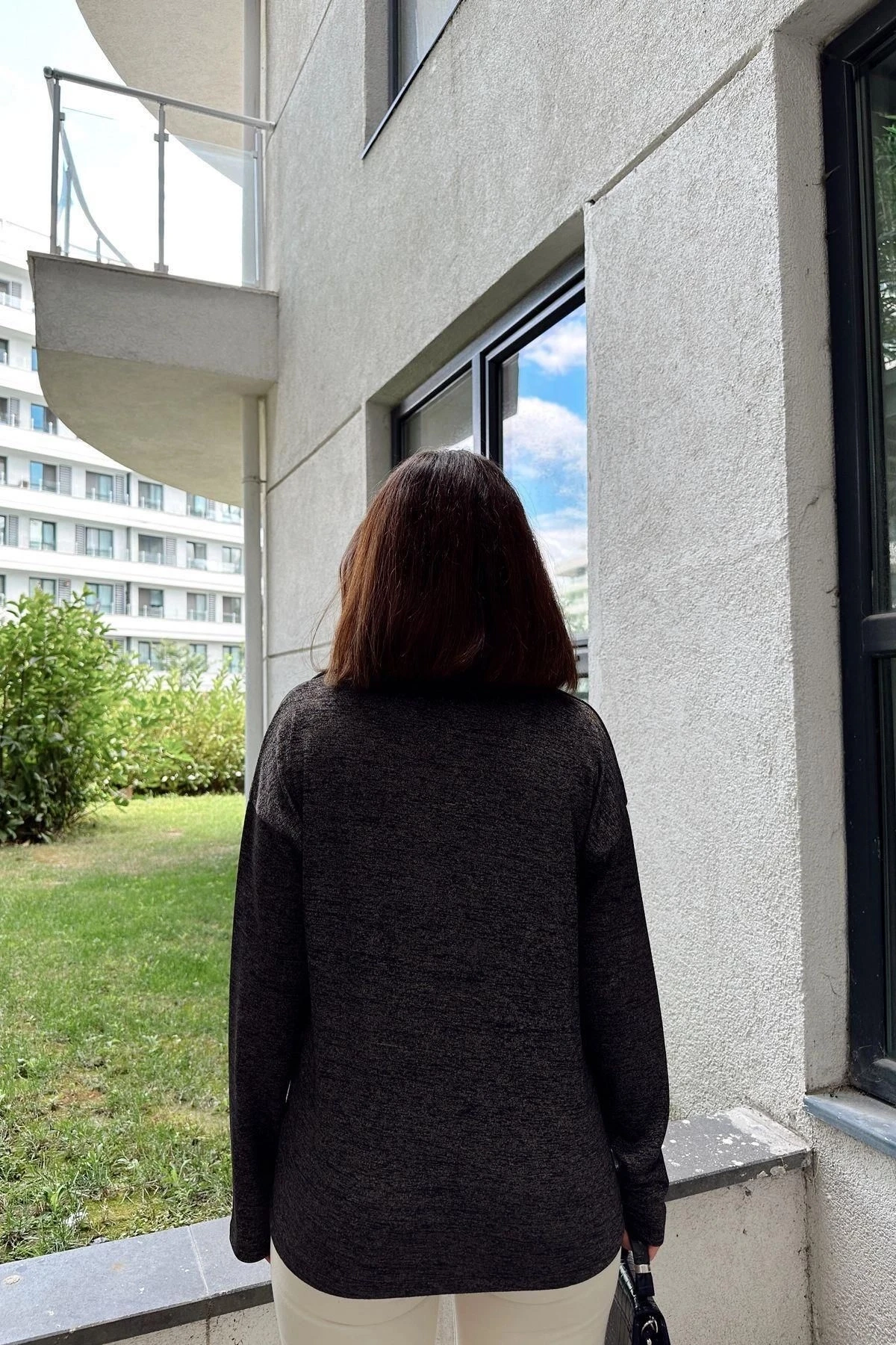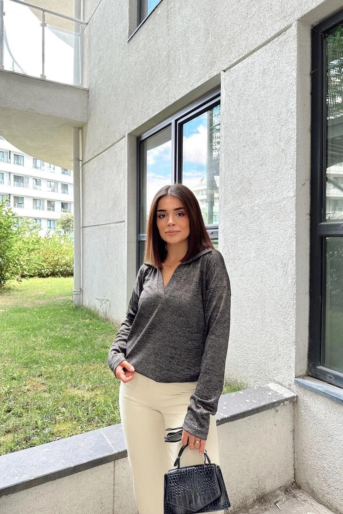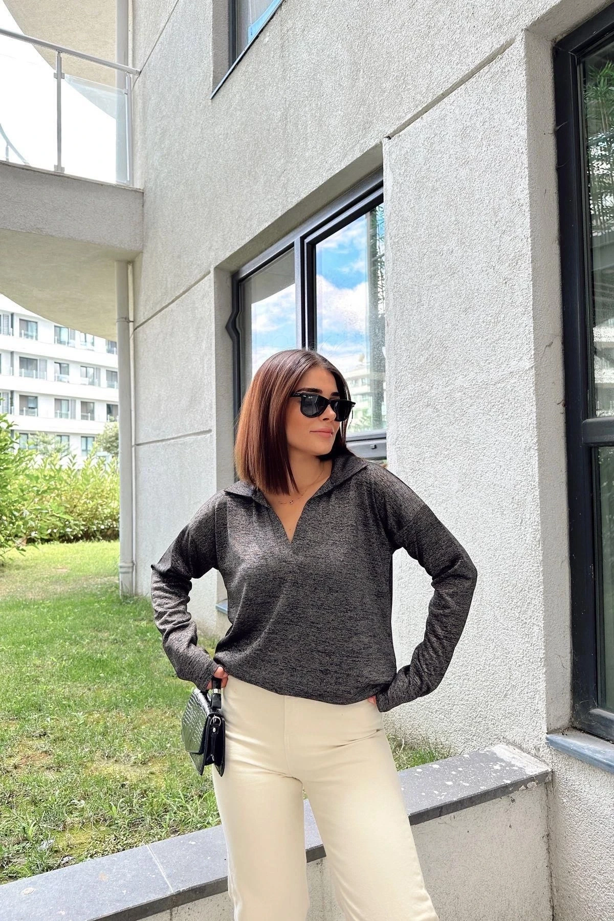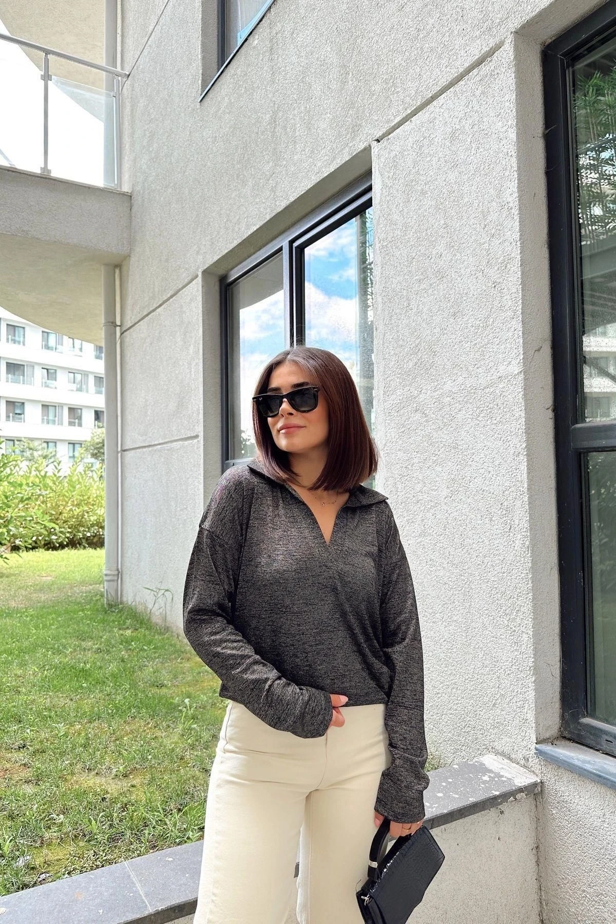 Kadın Antrasit Polo Yaka Basic Bluz, Uzun Kol, Regular Kesim, Günlük Ve Spor Sweatshirt