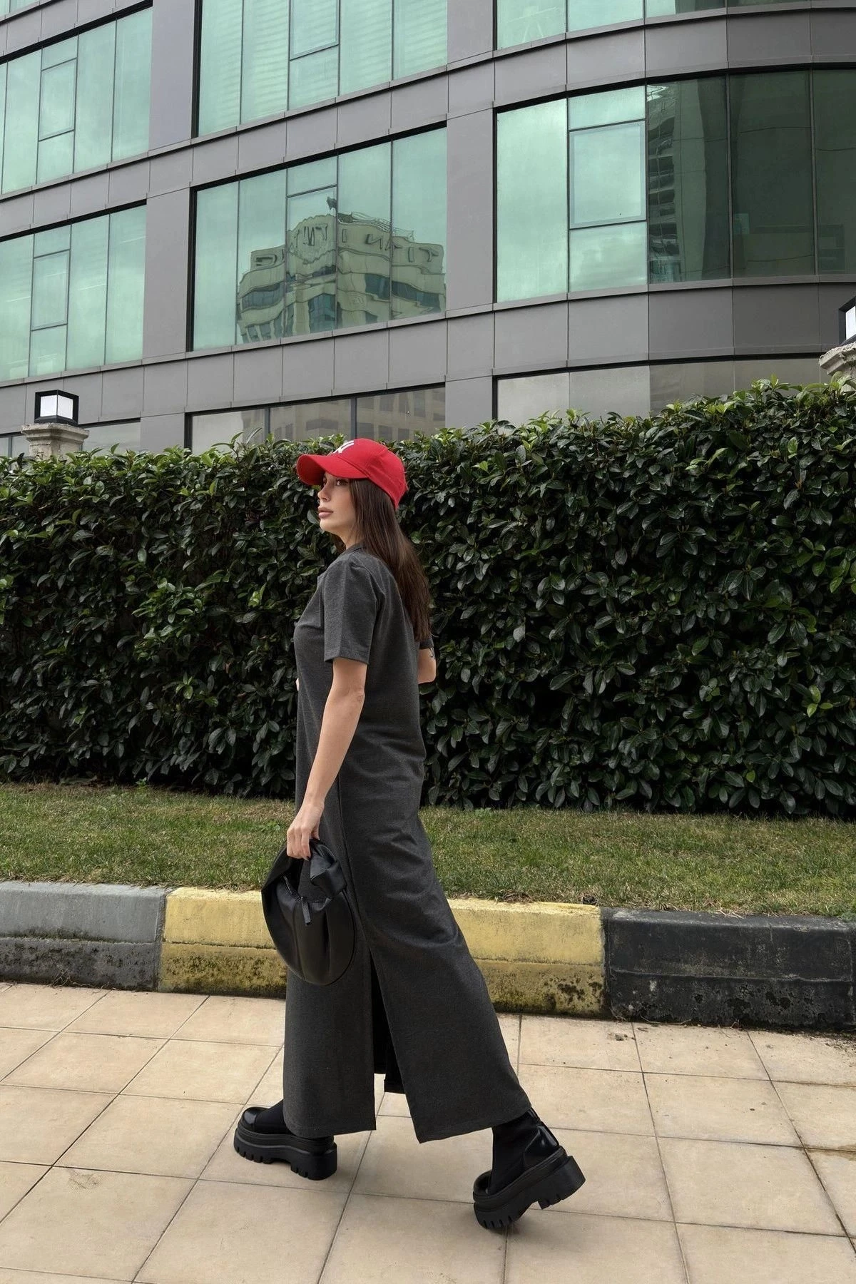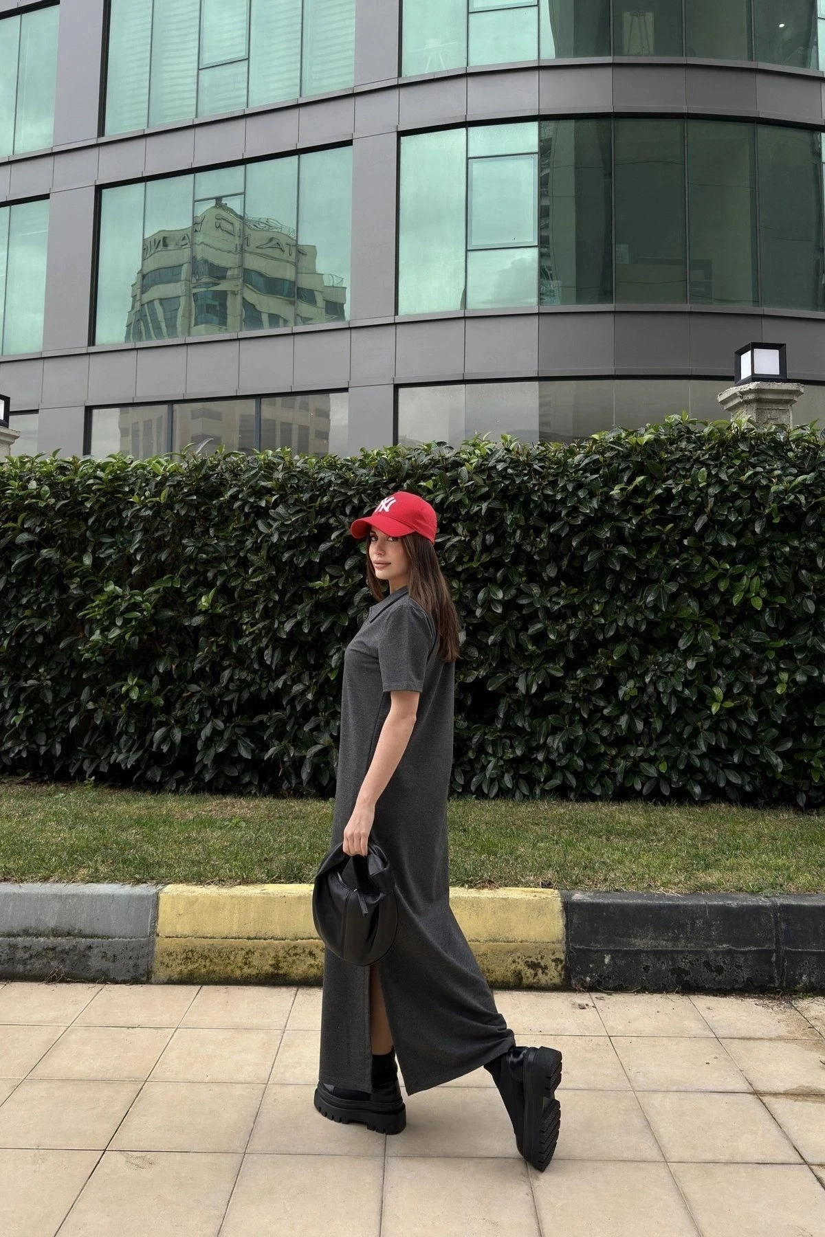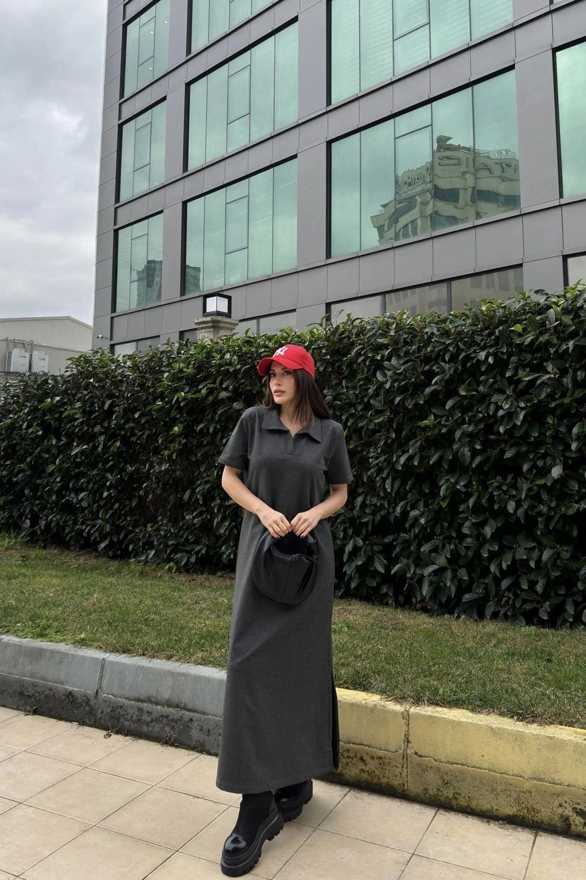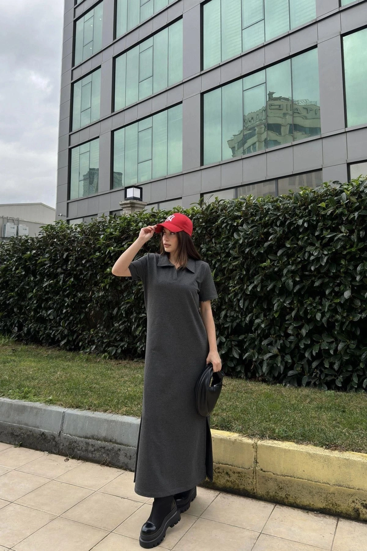 Kadın Antrasit Polo Yaka, Kısa Kol, Yırtmaçlı, Basic Model, Uzun Salaş Elbise