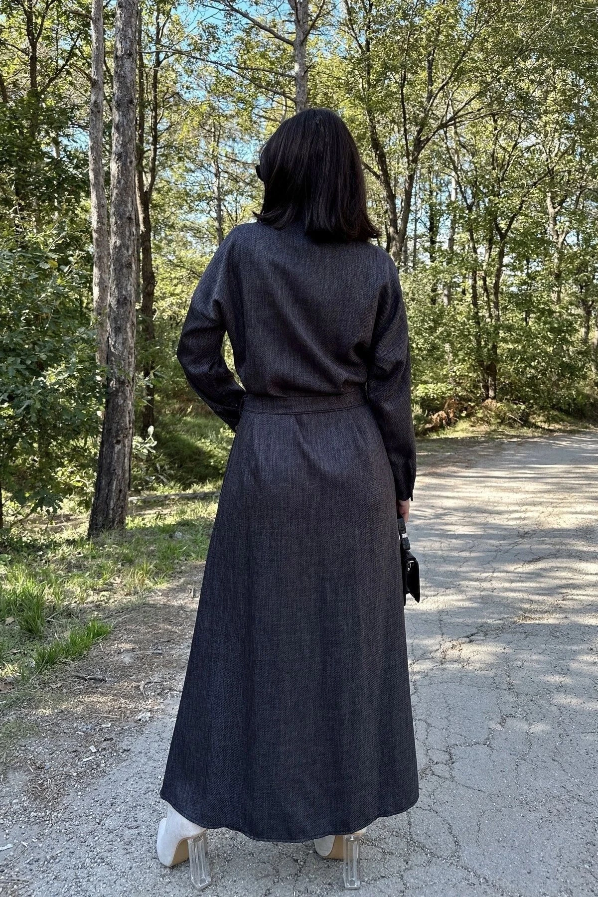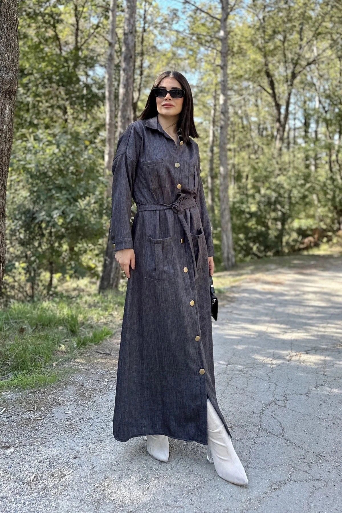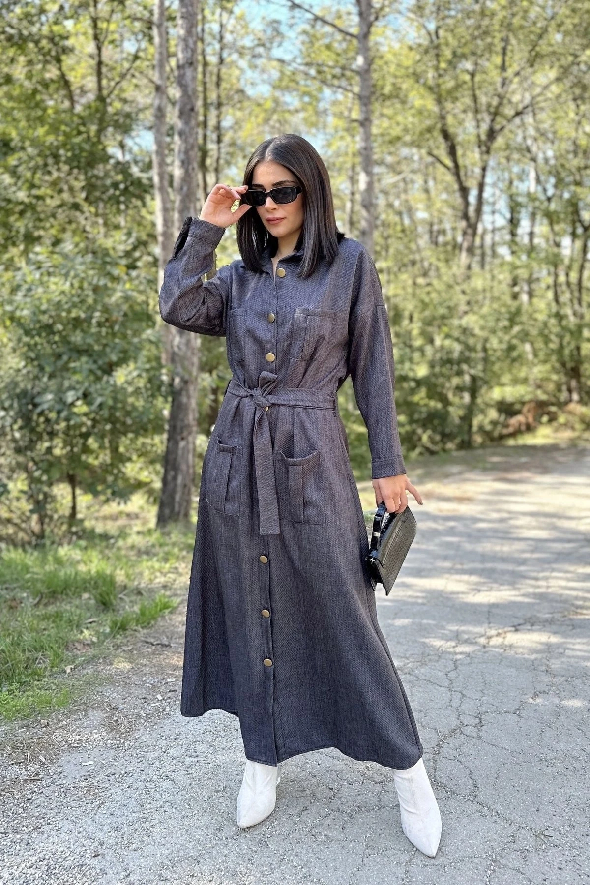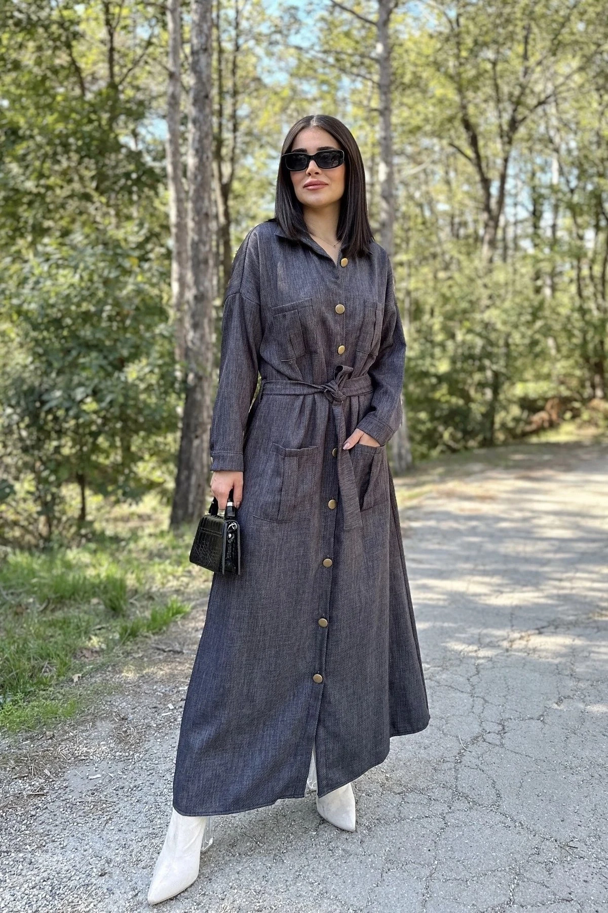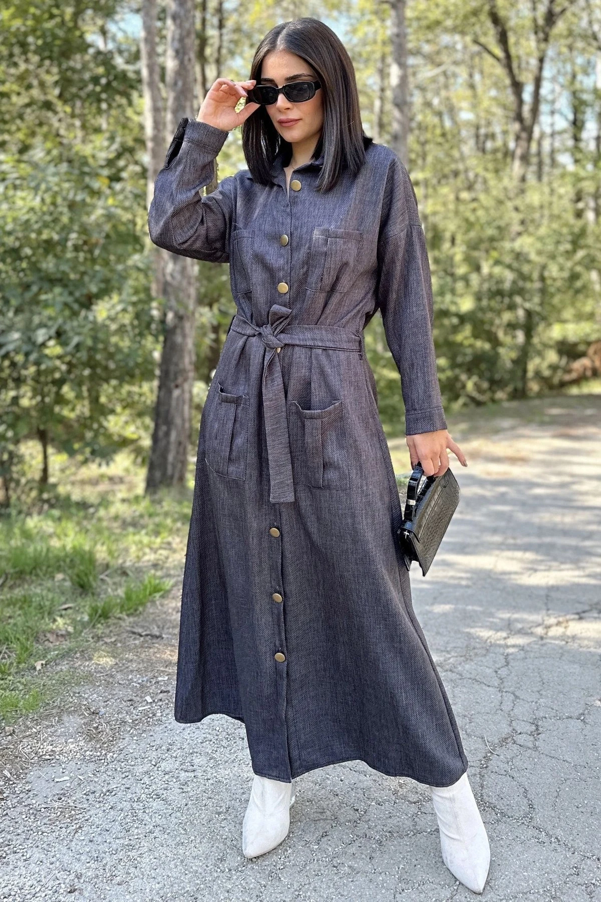 Kadın Antrasit Uzun Kol, Rahat Beli Kemerli, 4 Cepli, Gabardin Keten, Maksi Gömlek Elbise