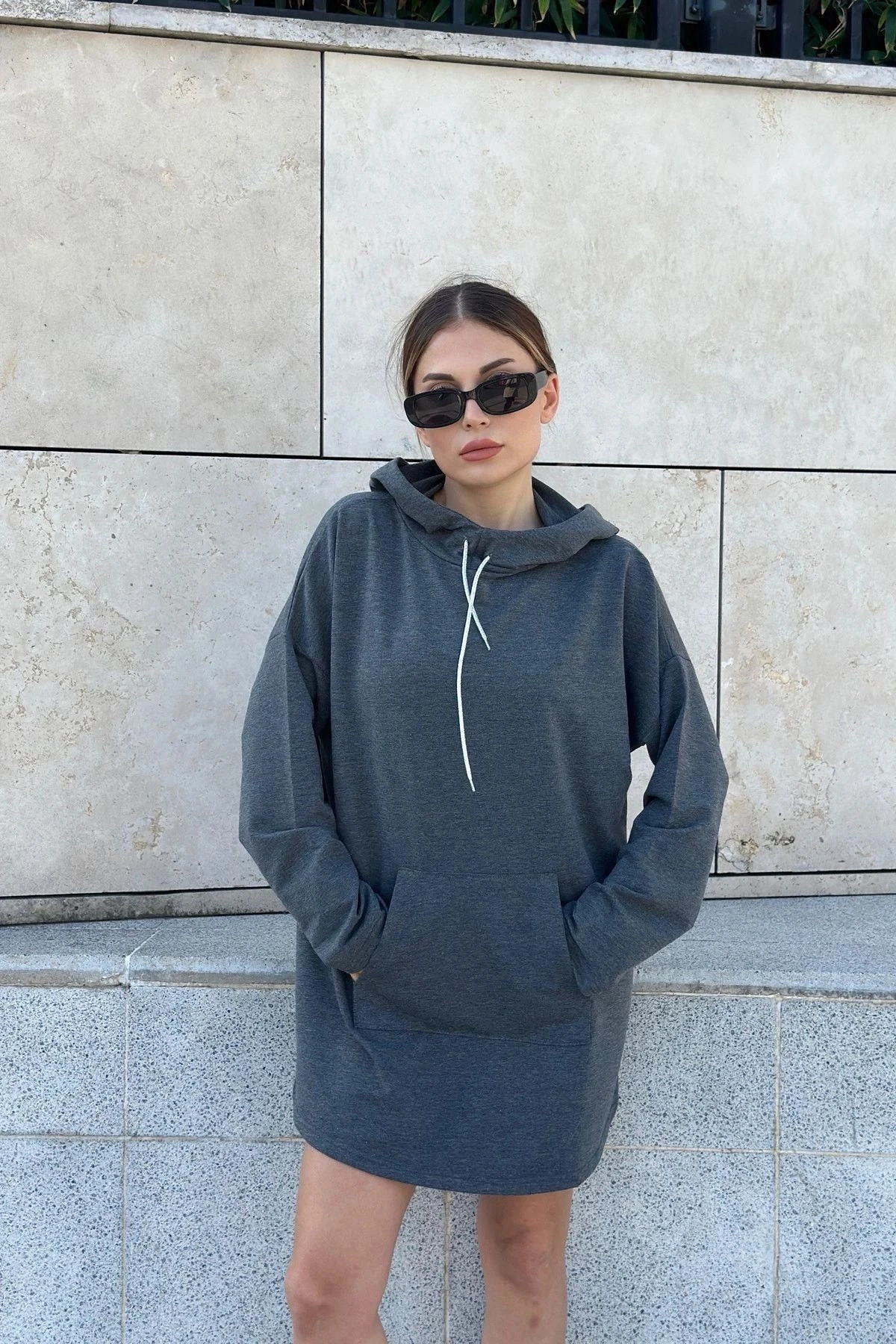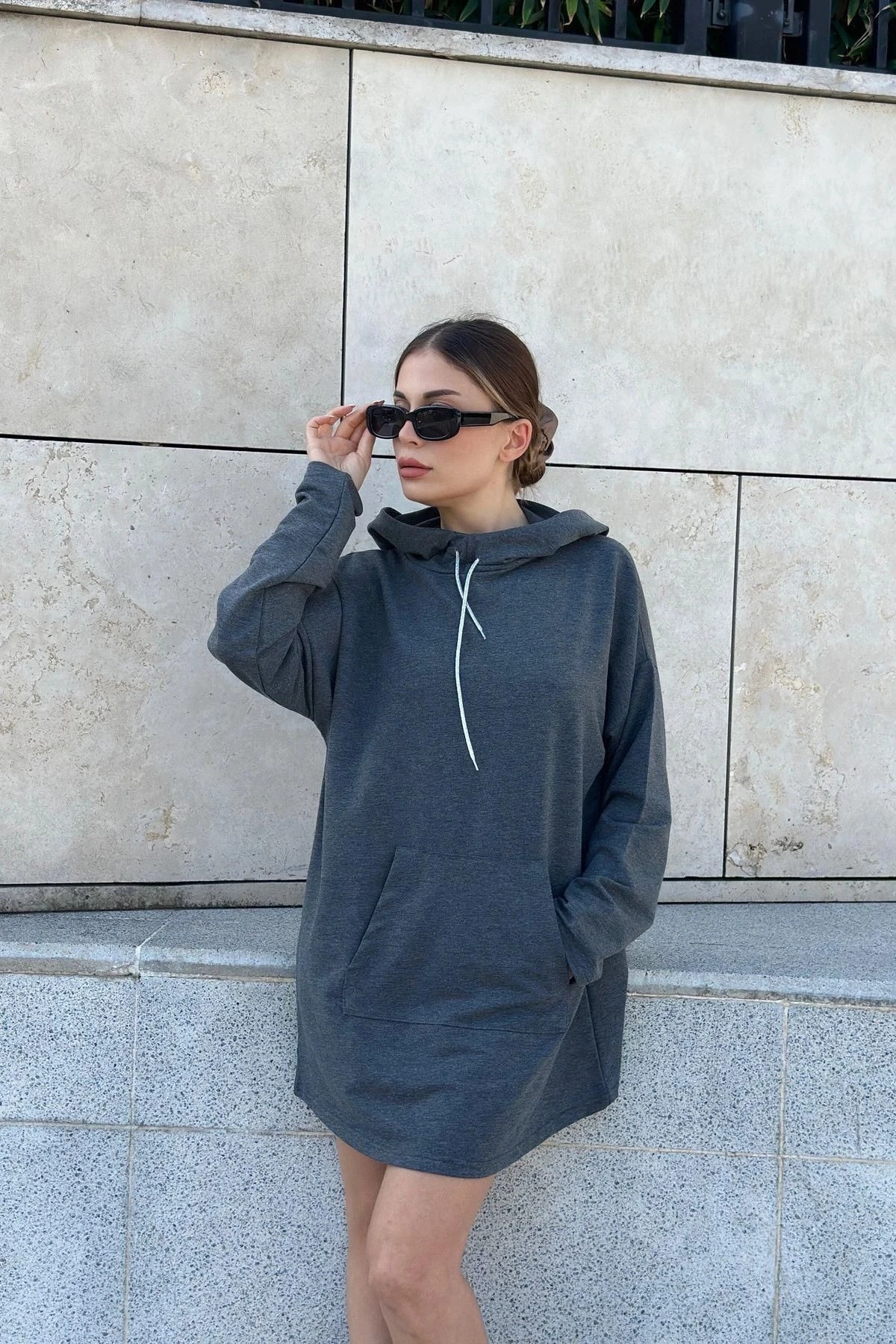 Kadın Antrasit Uzun Kol, Yakası Bağcıklı, Kapüşonlu, Kanguru Cep, Salaş, Uzun Tunik Sweatshirt