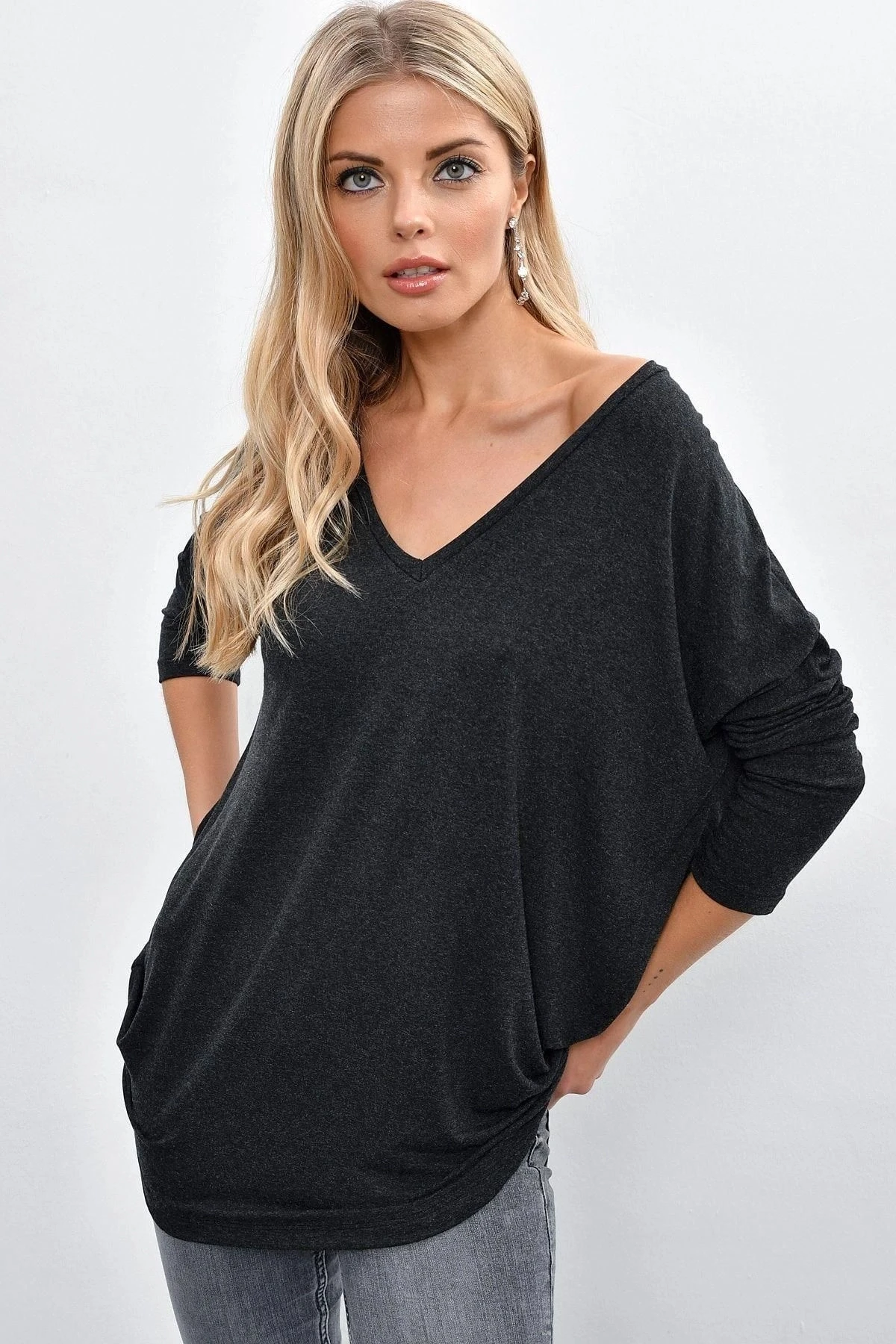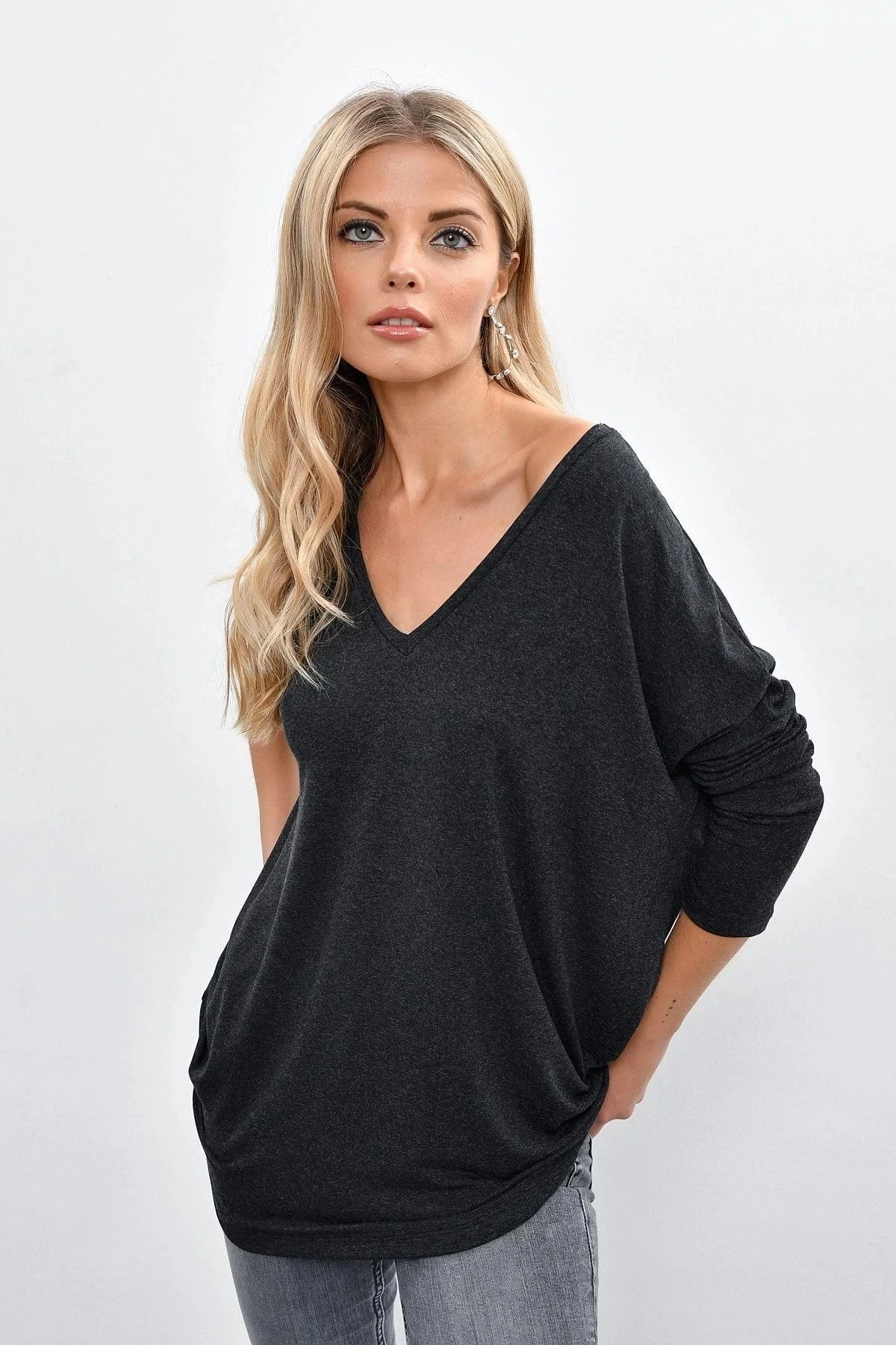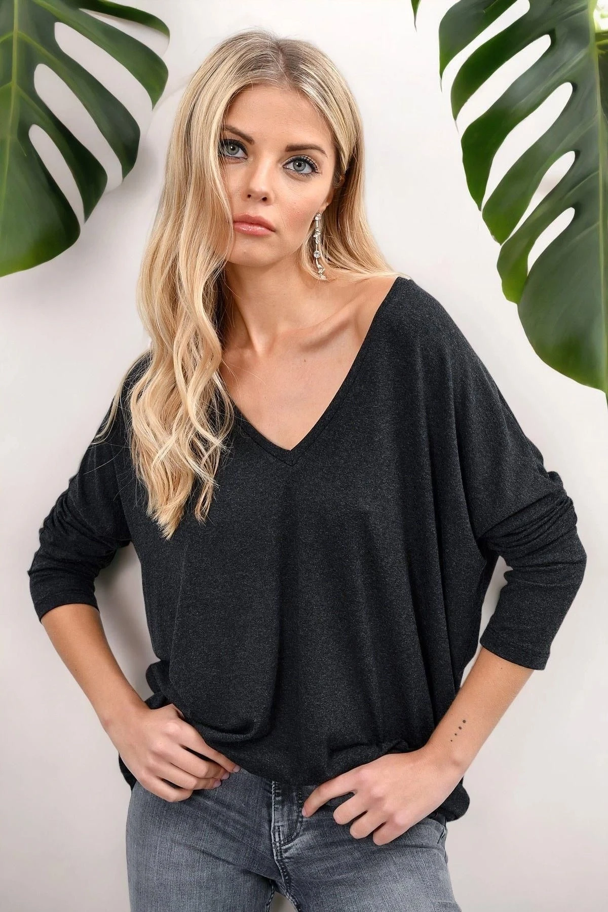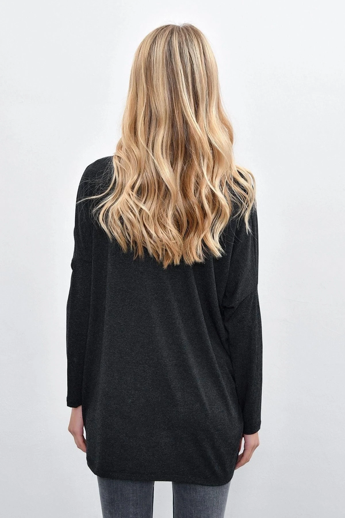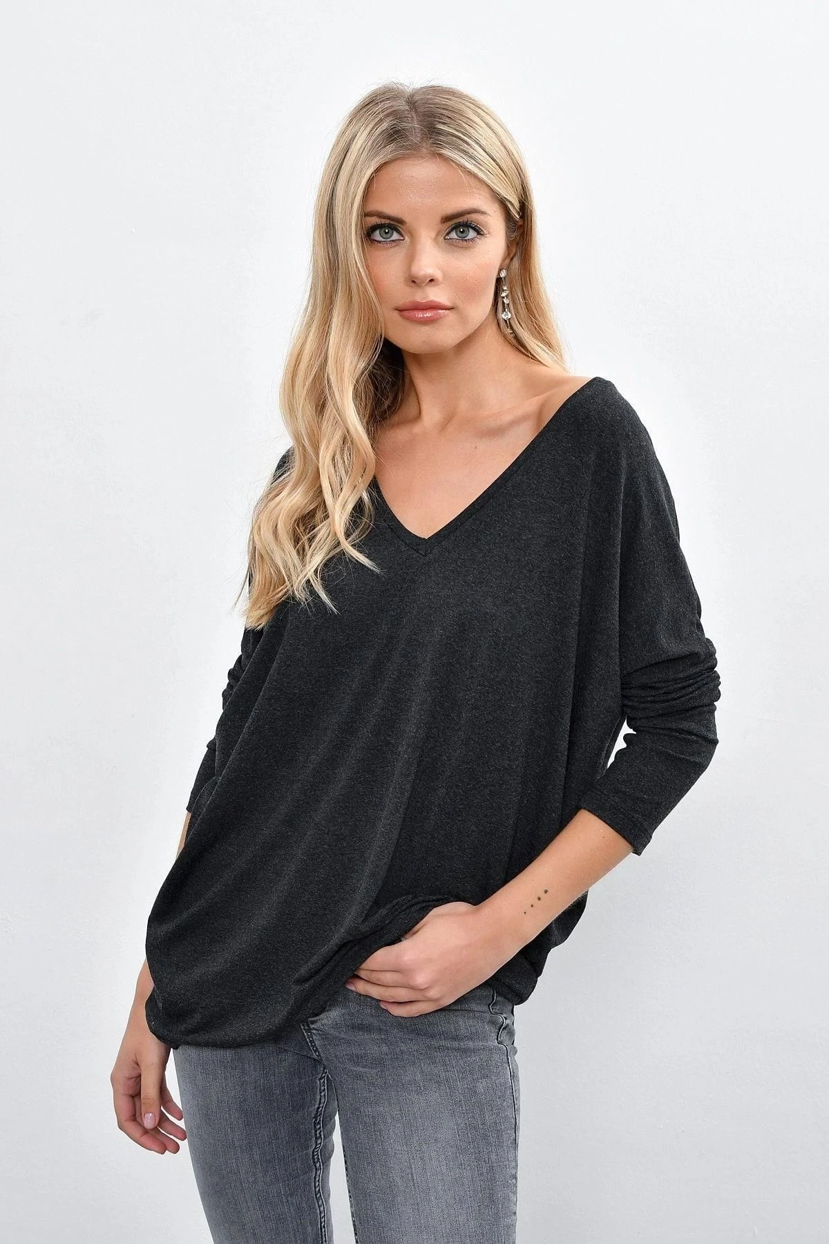 Kadın Antrasit V Yaka Uzun Kol Yarasa Kol Basic Kaliteli Kumaş Oversize Kesim Standart Boy Bluz