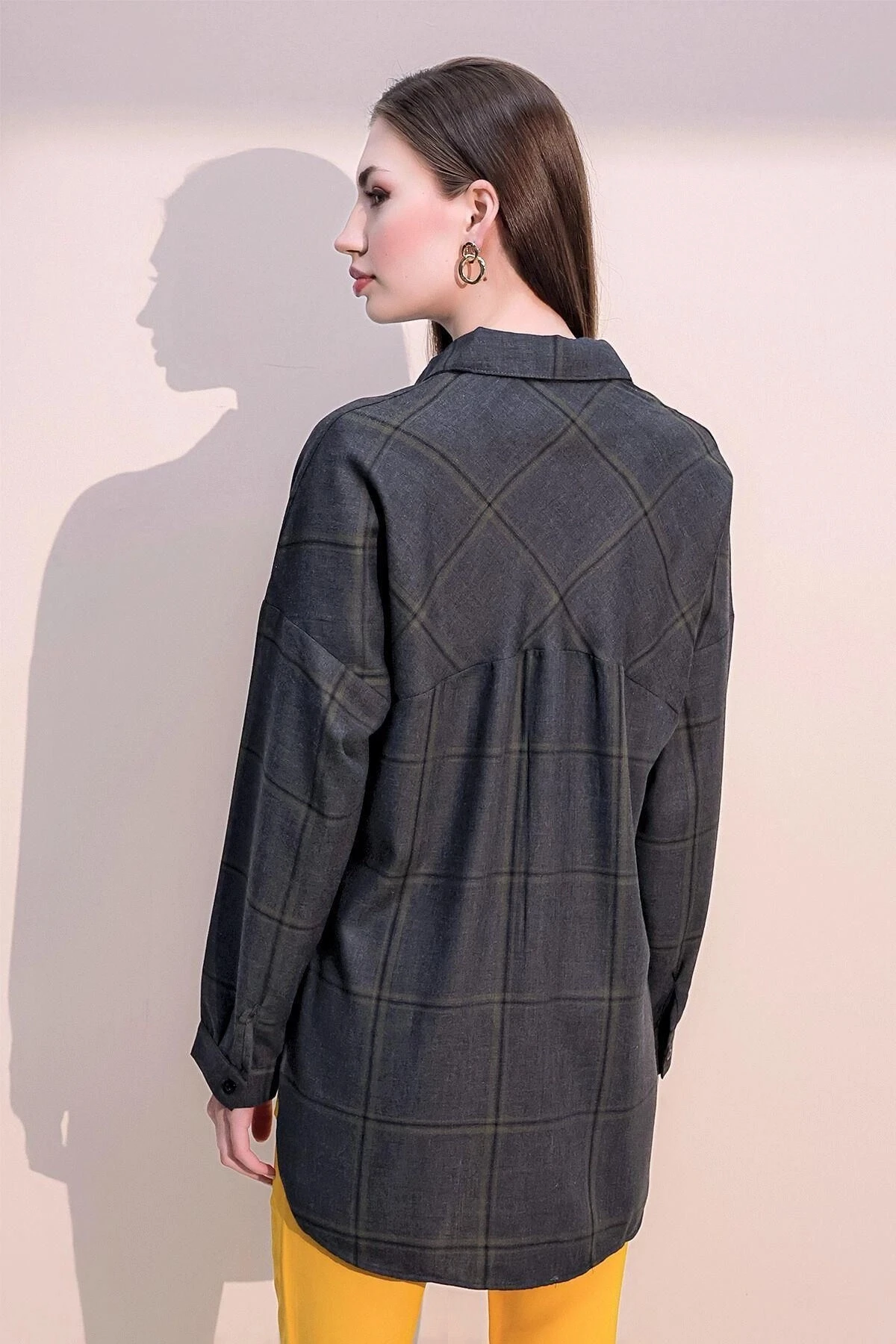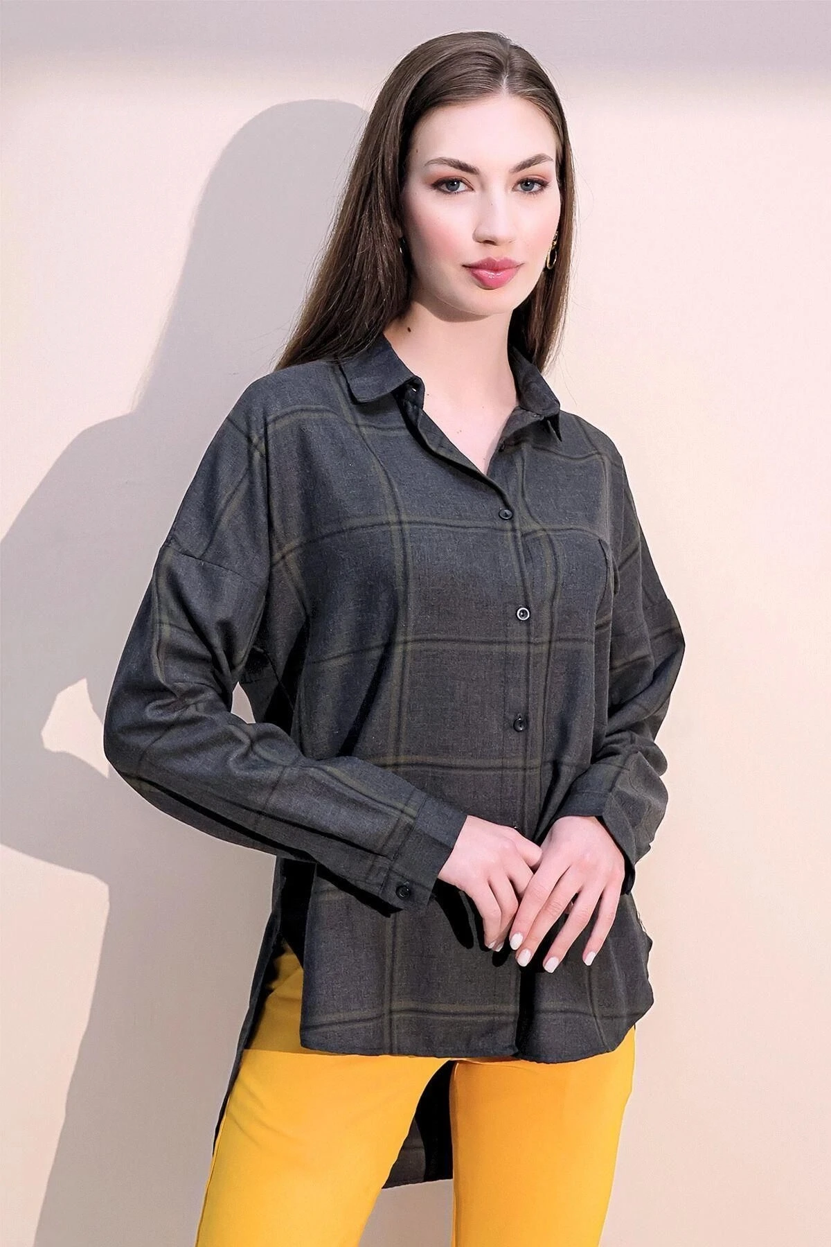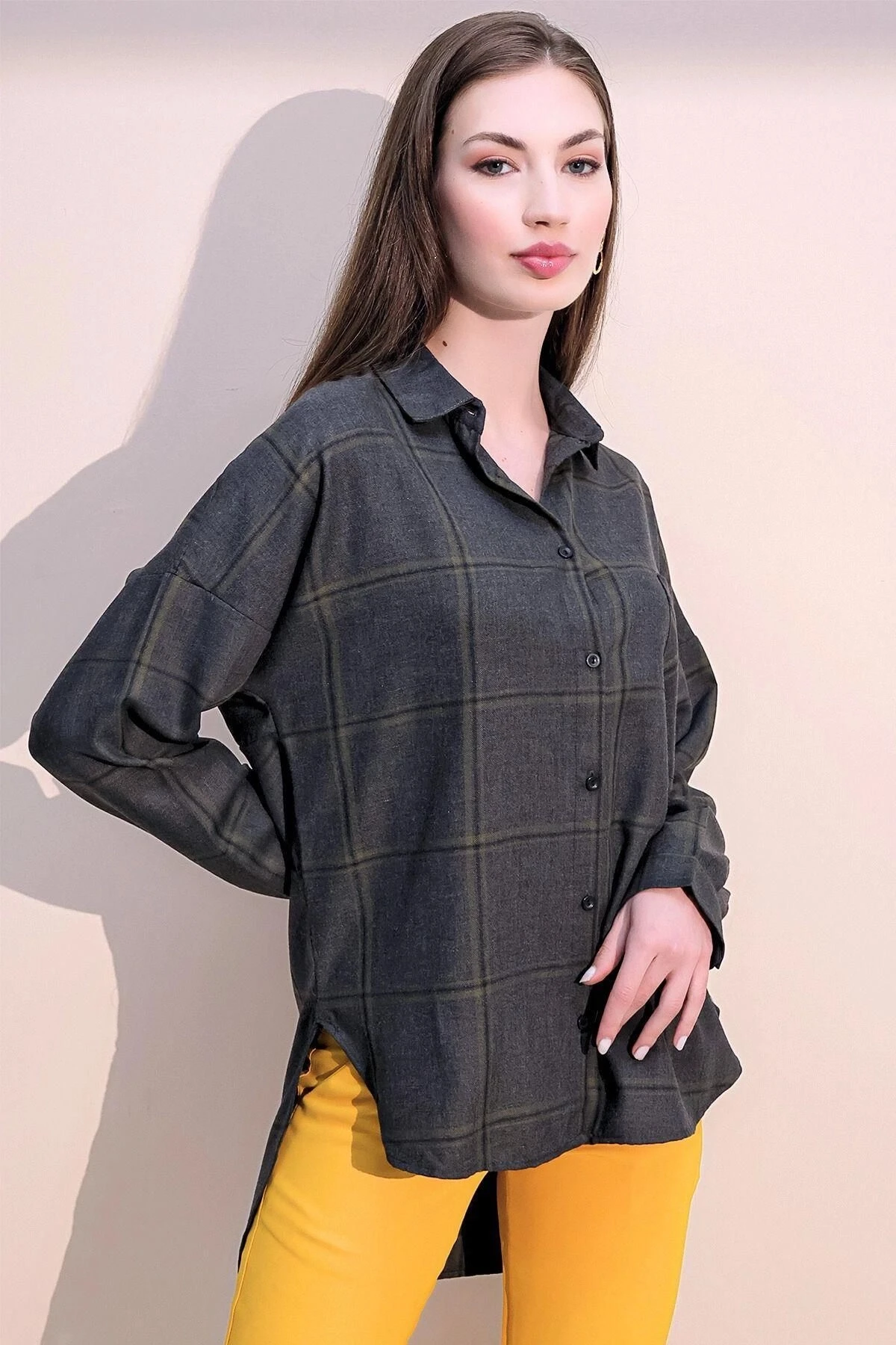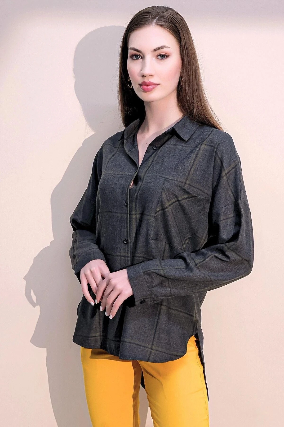 Bu antrasit yeşil renkteki uzun kol ekose desenli gömlek, yumuşak dokusu ve oversize kesimi ile şıklığı ve rahatlığı bir araya getiriyor.; %50 pamuk ve %50 polyester içeriğiyle, kaliteli bir kumaş kullanılarak üretilmiştir.; Bu gömlek, modern tasarımı ve dikkat çekici renk kombinasyonuyla öne çıkıyor.; Antrasit yeşili rengi, herhangi bir gardıroba sofistike bir dokunuş katarken, ekose desenleri zamansız bir tarz sunuyor.; Bu desenli gömlek, her mevsimde giyilebilecek ve farklı kombinasyonlarla şık bir görünüm elde etmenizi sağlayacak bir parçadır.; Oversize kesimi, rahat bir ve modern bir tarzı bir araya getiriyor.; Geniş kesimi sayesinde vücudu saran sıkı bir yapıdan uzaklaşırken, rahat bir kullanım sunar.; Bu gömleği istediğiniz gibi katlayabilir, ön kısmını düğmeleyebilir veya bağlayabilirsiniz.; Farklı stillerde ve farklı mekanlarda rahatlıkla kullanabilirsiniz.; Yumuşak dokulu kumaşı, gün boyu konforlu bir giyim deneyimi sağlar.; %50 pamuk içeriği, cildinizin nefes almasını sağlarken, %50 polyester içeriği ise dayanıklılığını artırır ve kolayca kırışmaz.; Bu gömlek, hem günlük kullanım için hem de özel bir etkinlikte giymek için ideal bir seçimdir.; Bu antrasit yeşil renkteki uzun kol ekose desenli gömlek, şık tasarımı, kaliteli kumaşı ve rahat kesimiyle gardırobunuza şıklık katacak bir parçadır.; Hem günlük hayatta hem de özel etkinliklerde şık ve rahat bir görünüm elde etmek isteyenler için mükemmel bir seçimdir.