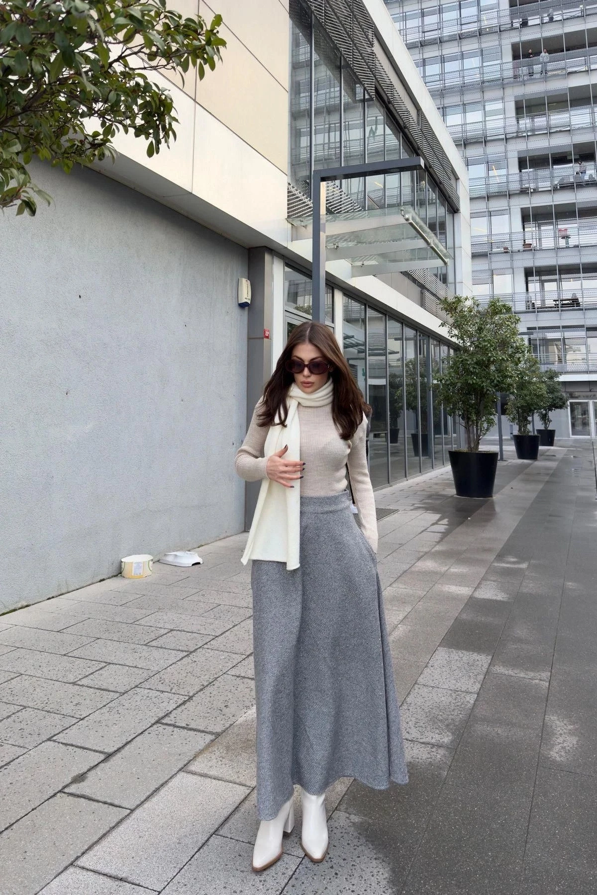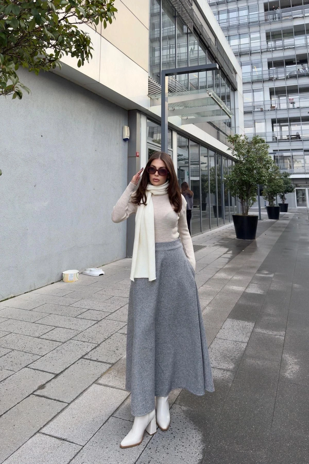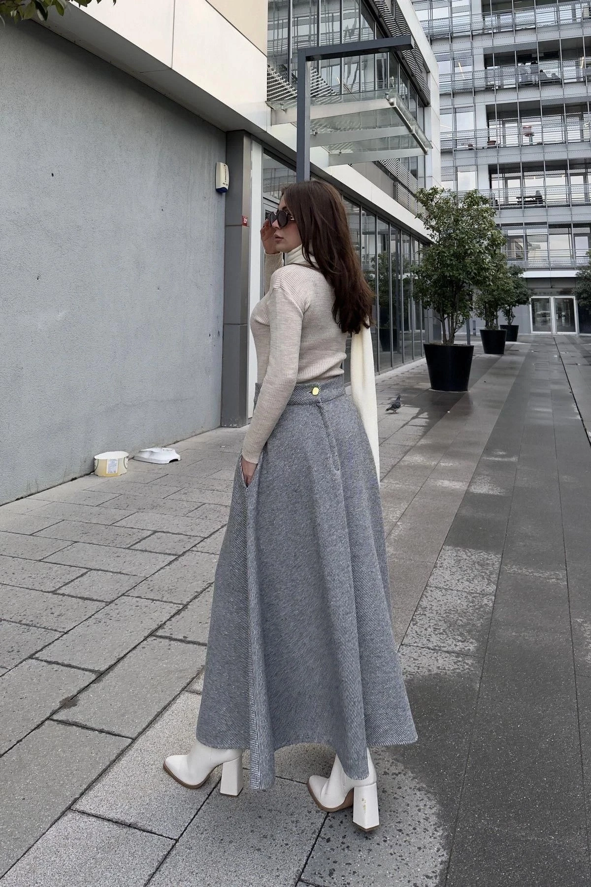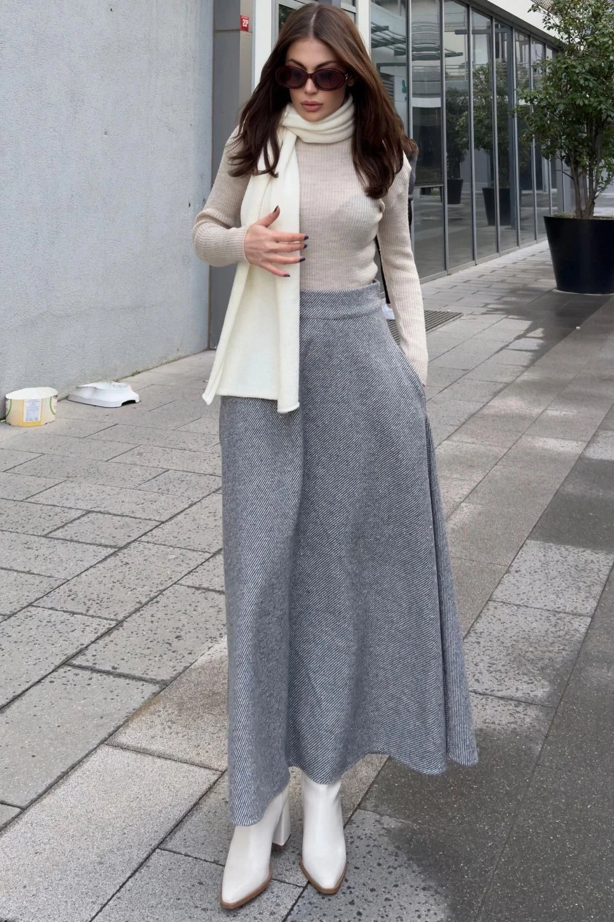 Kadın Antrasit Yüksek Bel, Cepli, Kiloş Kesim, Uzun Kaşe Etek