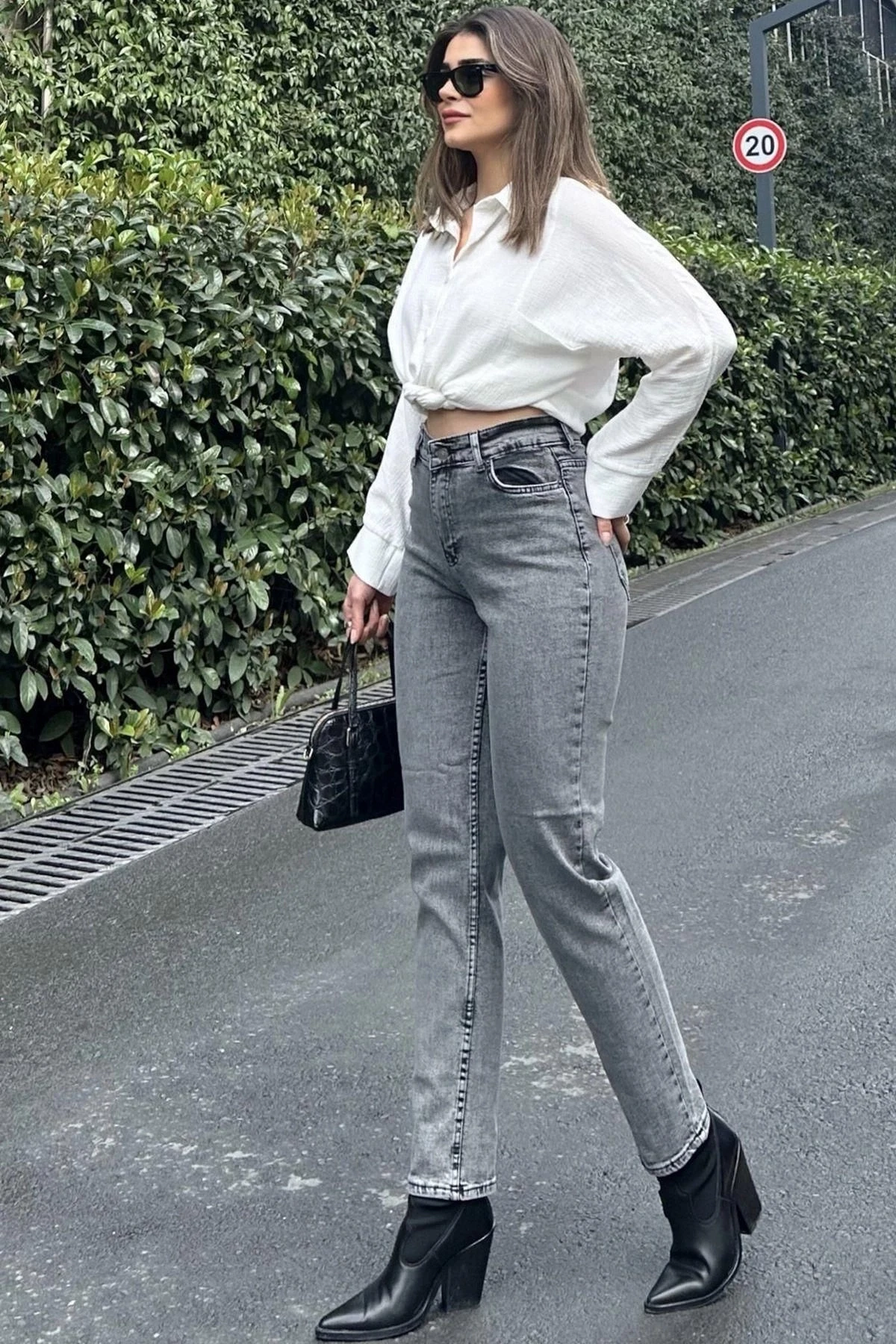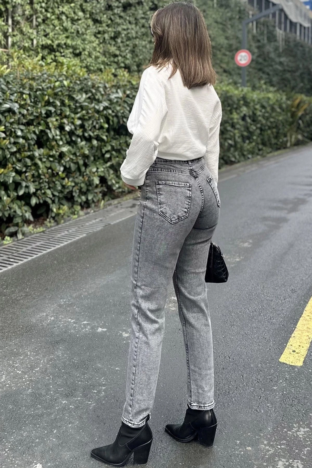 Kadın Antrasit Yüksek Bel, Rahat Kesim, Boru Paça, Skinny Kot Pantolon - Jeans