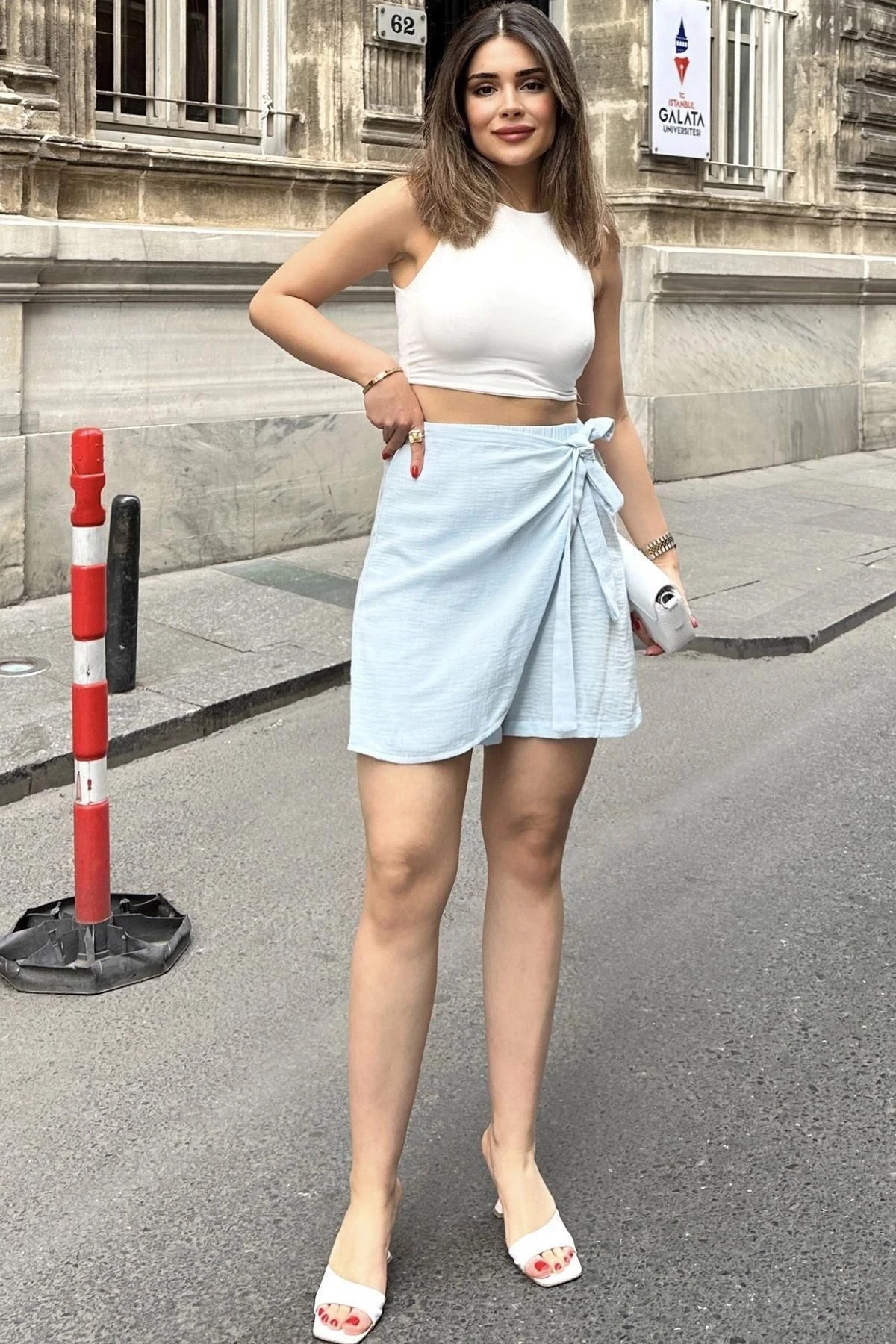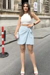 Kadın Bebe Mavi Çapraz Bağlama Detaylı, Terletmez Pamuklu, İthal Müslin Kumaş Etek Şort