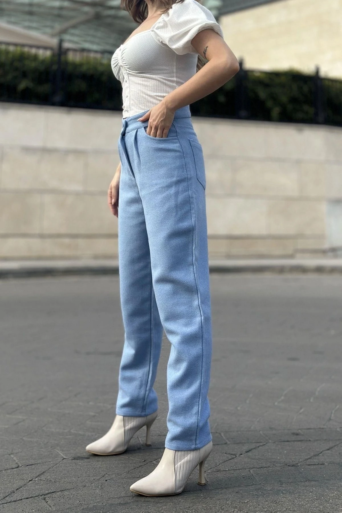 Kadın Bebe Mavi Yüksek Bel, Kaşe Kumaş, Rahat Kalıp, Regular Kesim, Pliseli, Cepli Pantolon