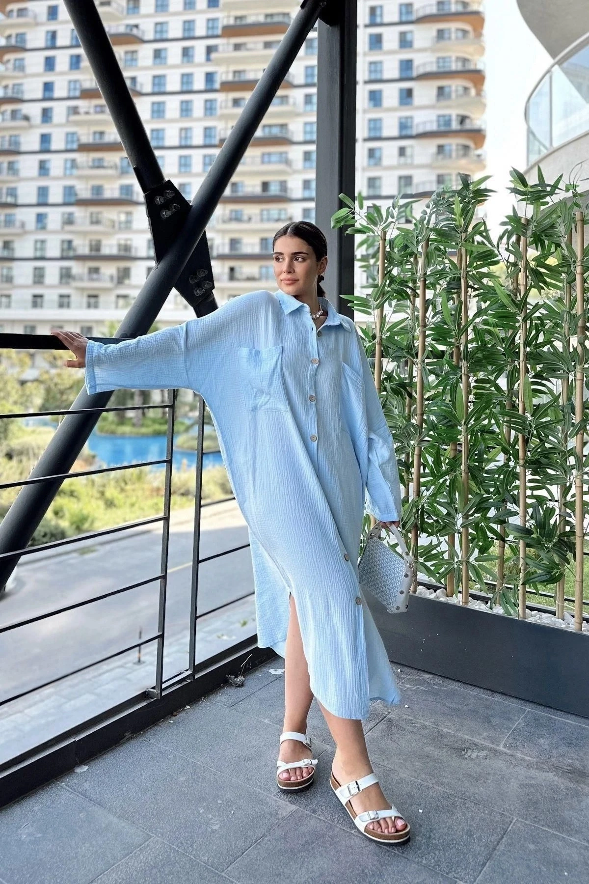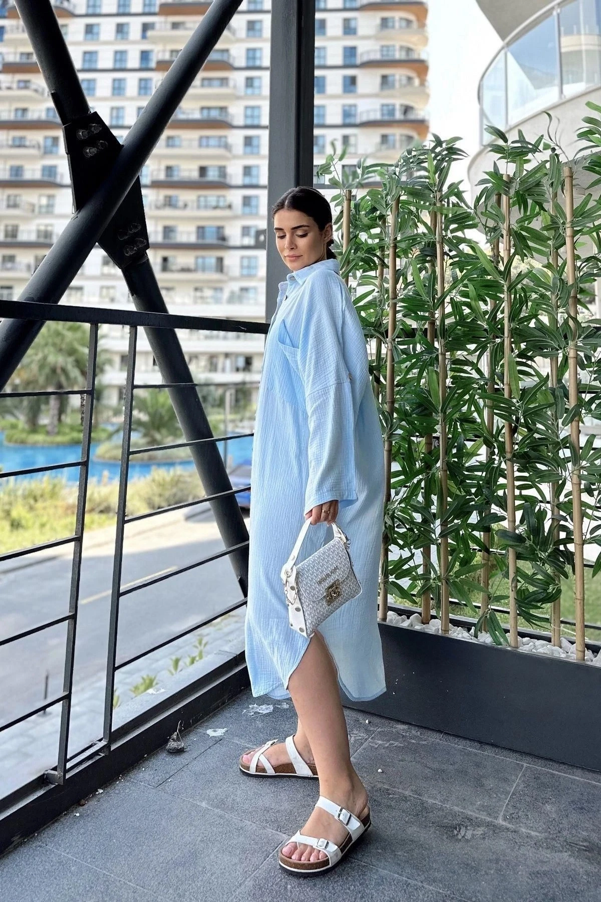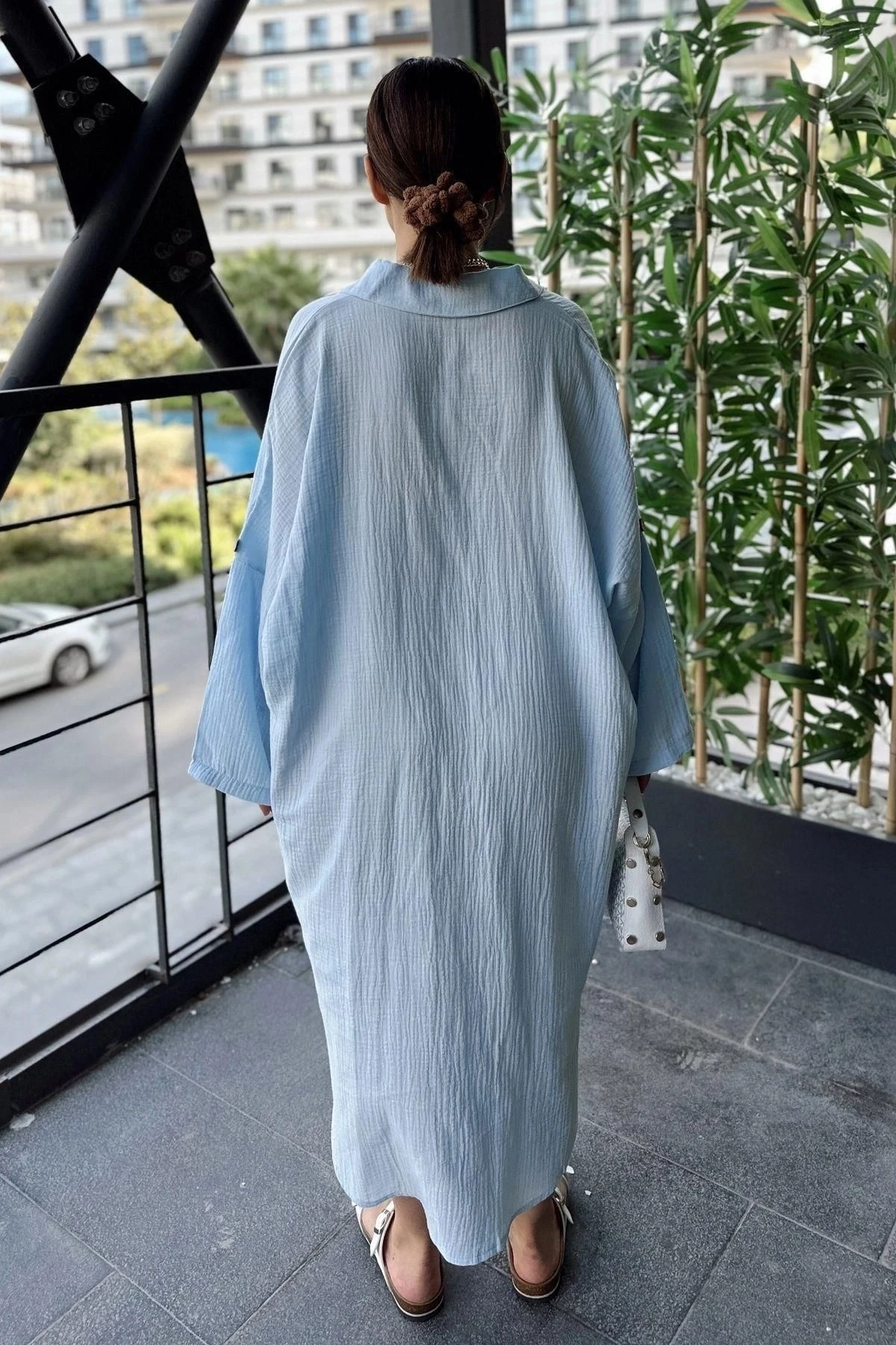 Kadın Bebe Mavisi Muslin Kumaş, Yarasa Kol, Eteği Oval, Çift Uzun Oversize Salaş Gömlek Elbise