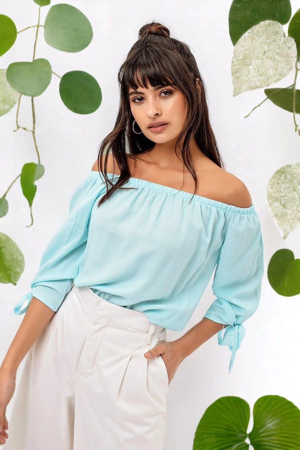 Kadın Bebe Mavisi Straplez Yaka Truvakar Kol yaprak desenli kolu büzgülü Regular Kesim Bluz