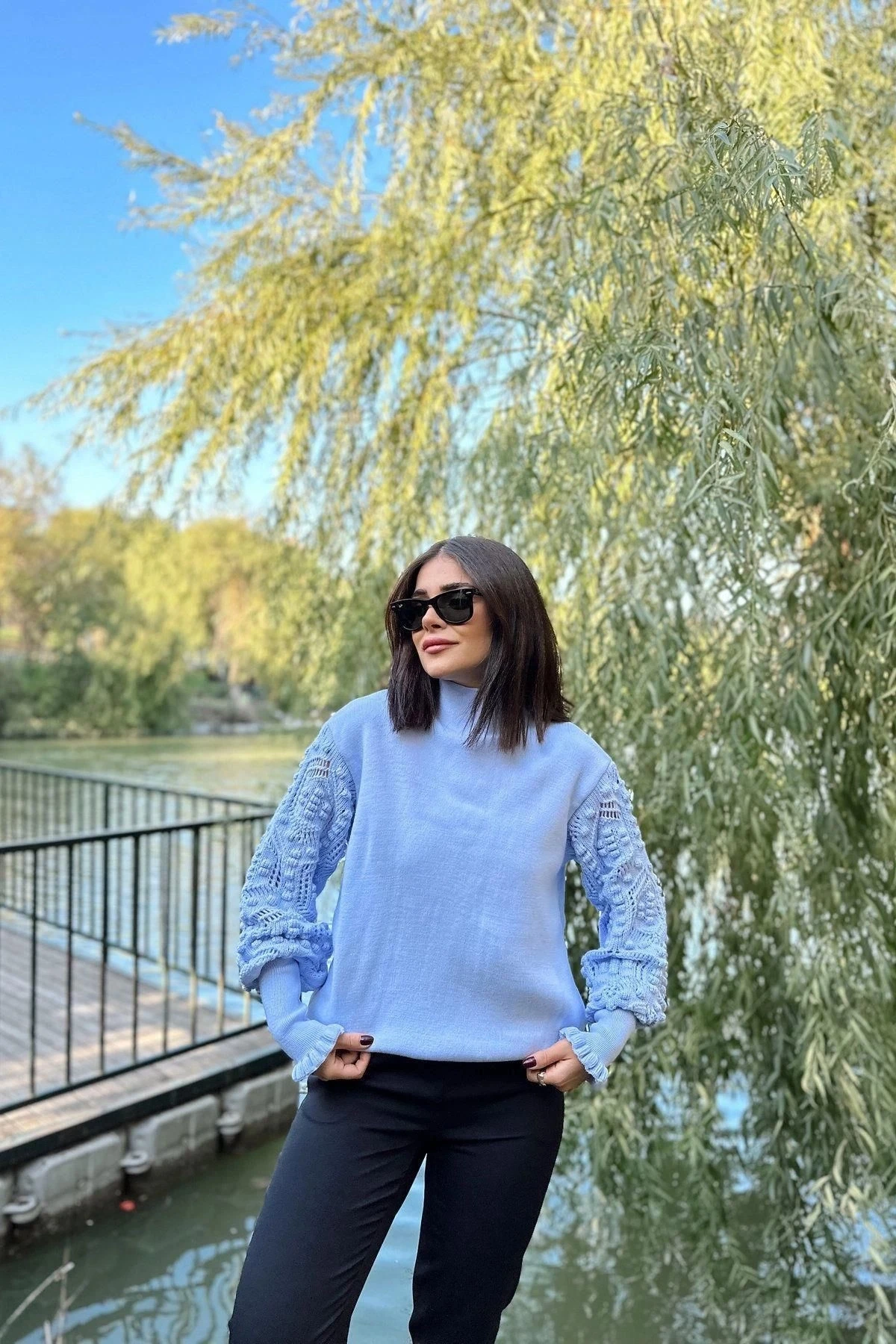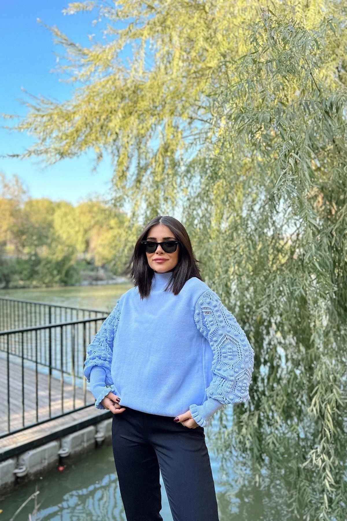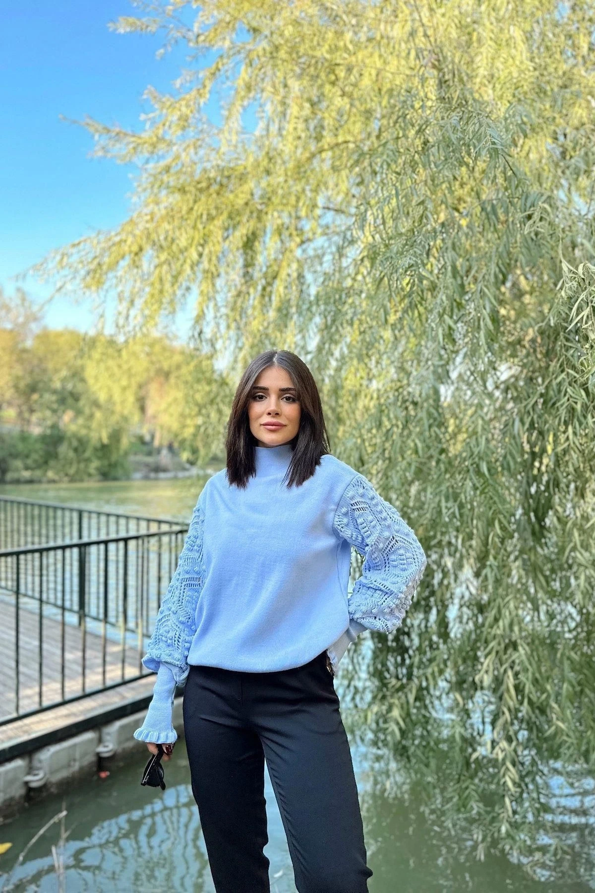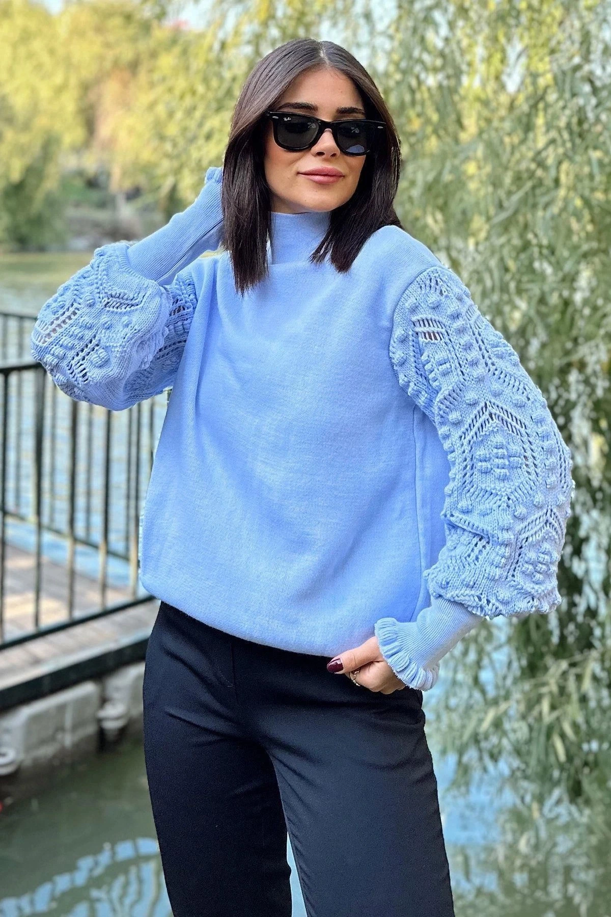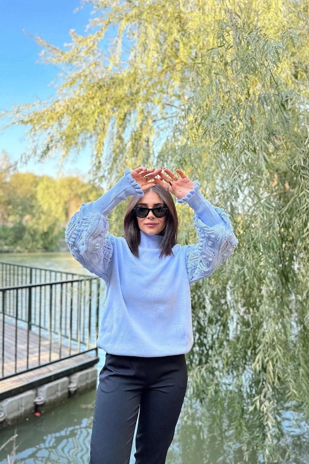 Kadın Bebe Mavisi Yüksek Yaka, Ponponlu Uzun Kol Detaylı, Yumuşak Dokulu, Salaş Triko Kazak
