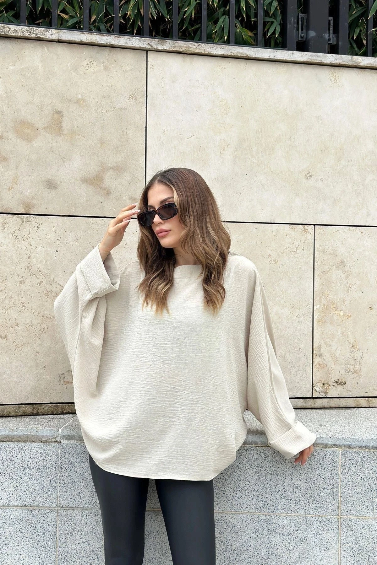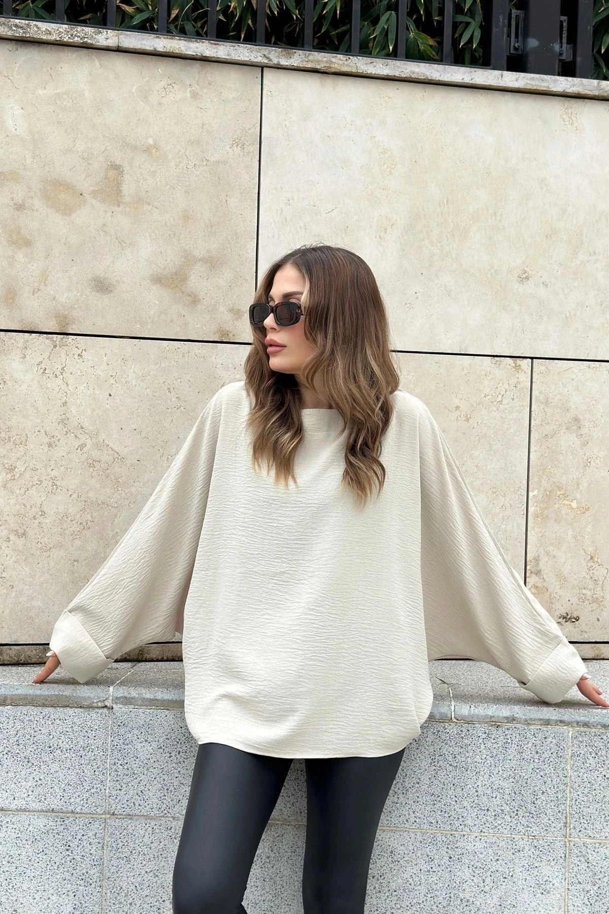 Kadın Bej Airobin Yarasa Duble Kol Salaş Bluz Ekstra Oversize Yuvarlak Yaka - Tesettüre Uygun