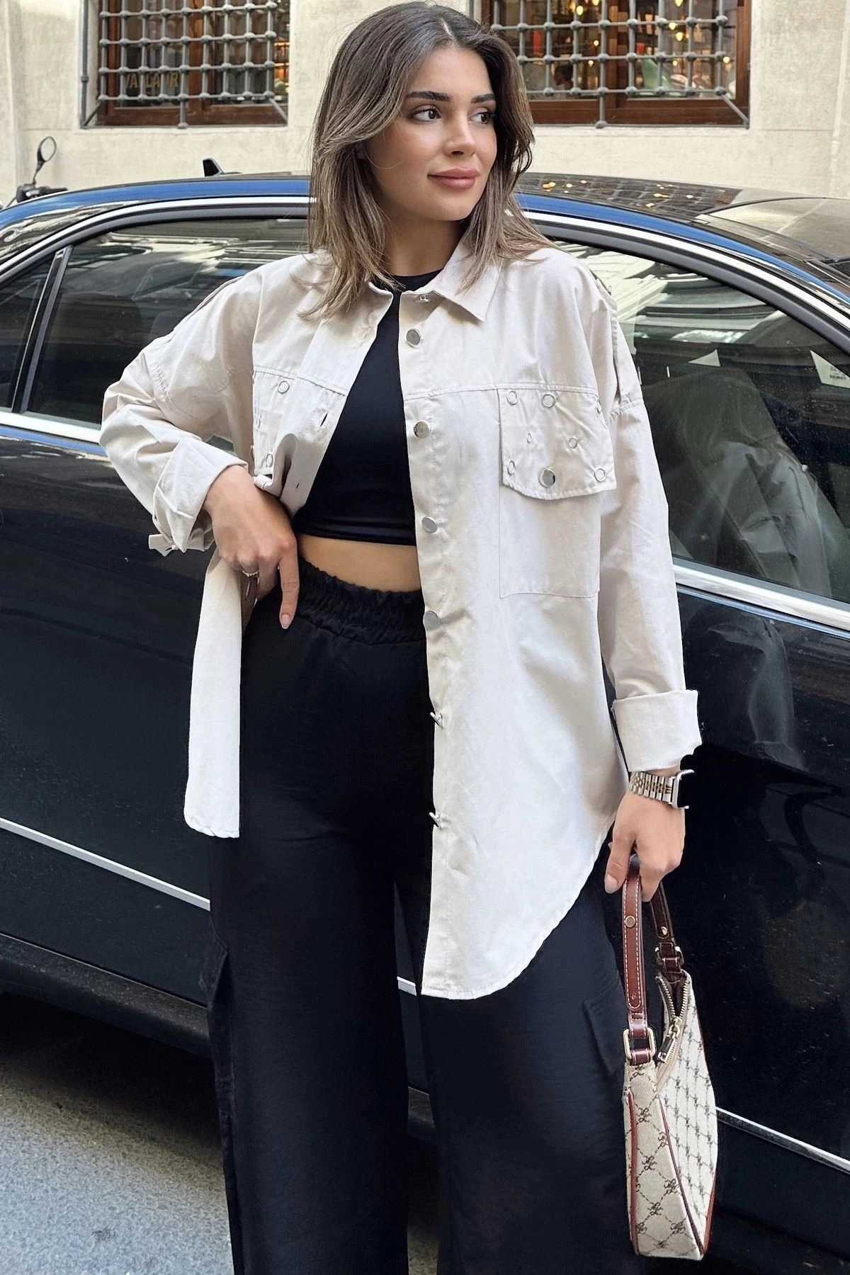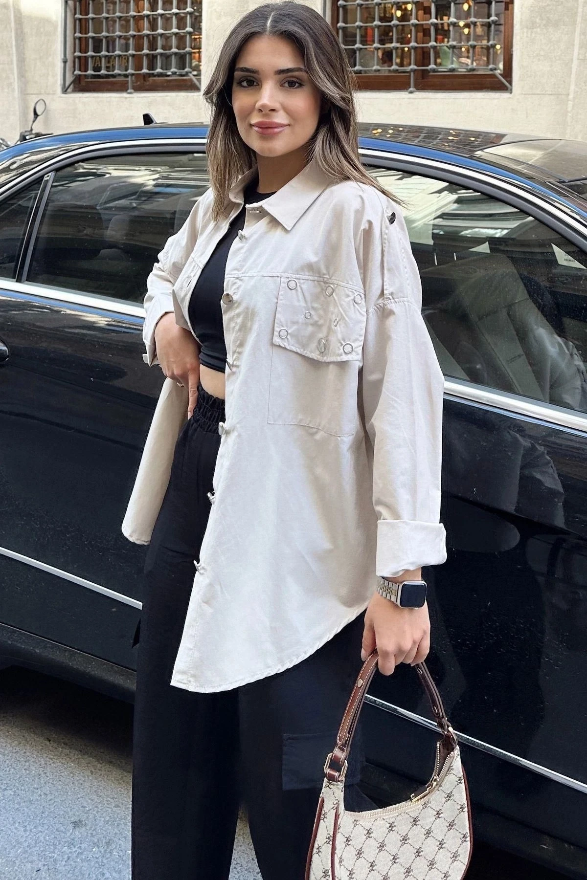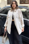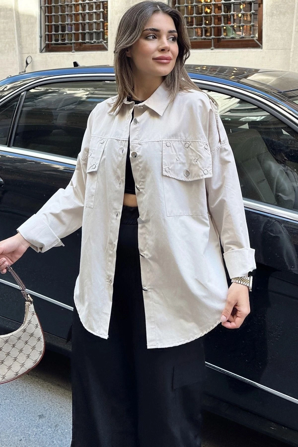 Kadın Bej Apolet Ve Zımba Detaylı, Salaş Kesim, Terletmez, Poplin Gömlek