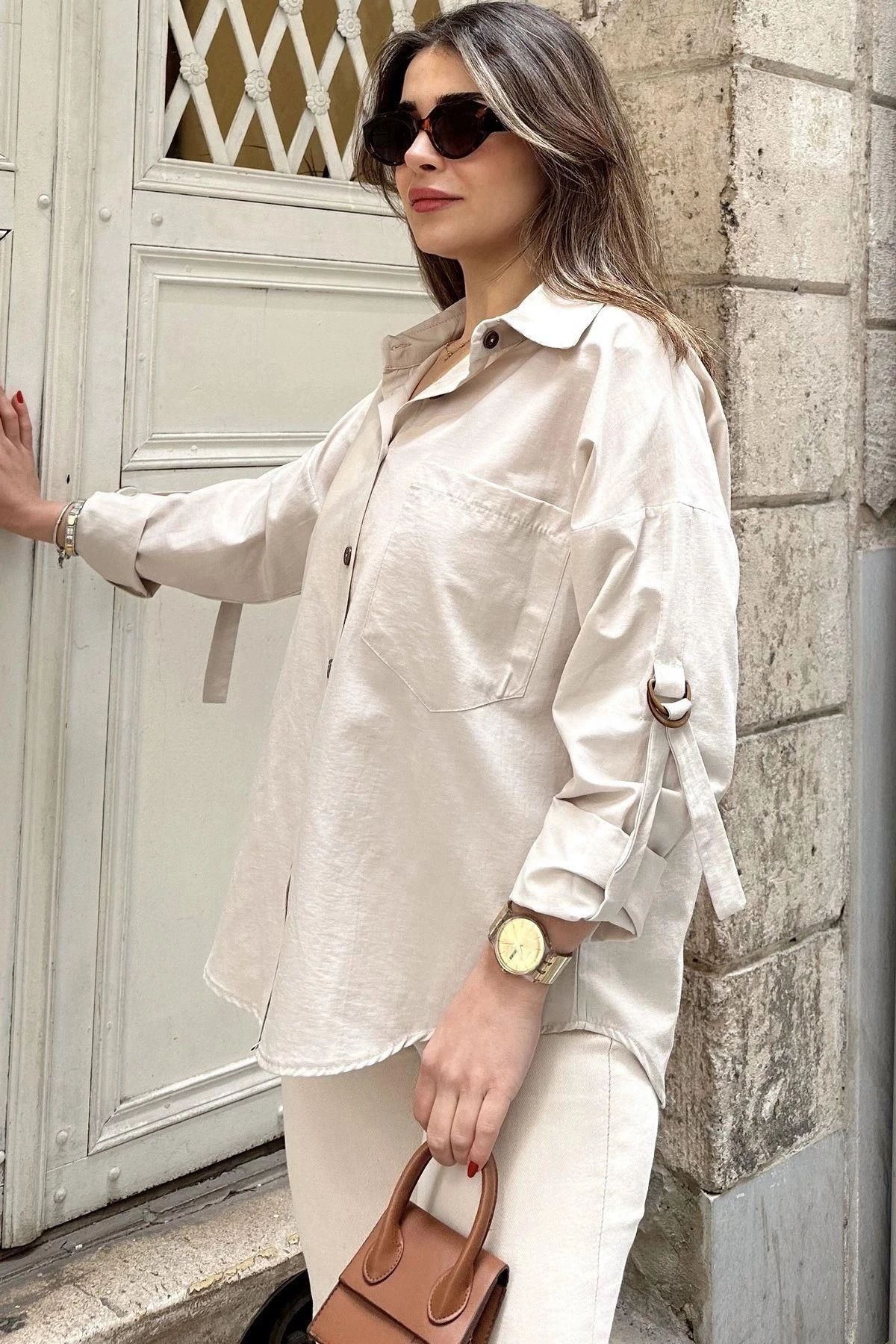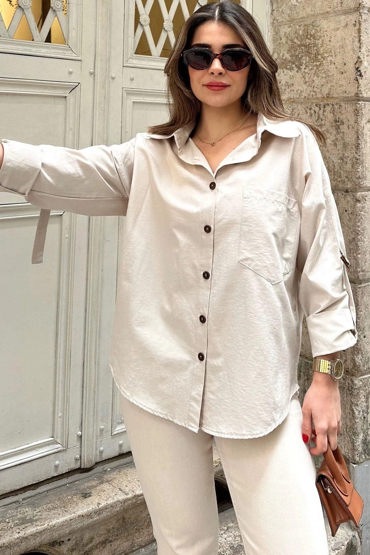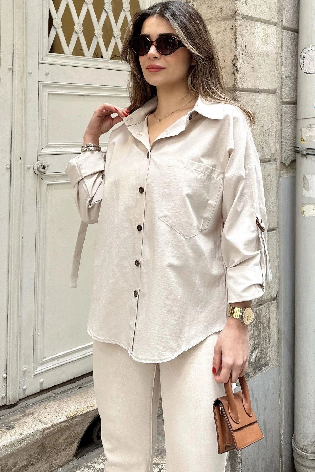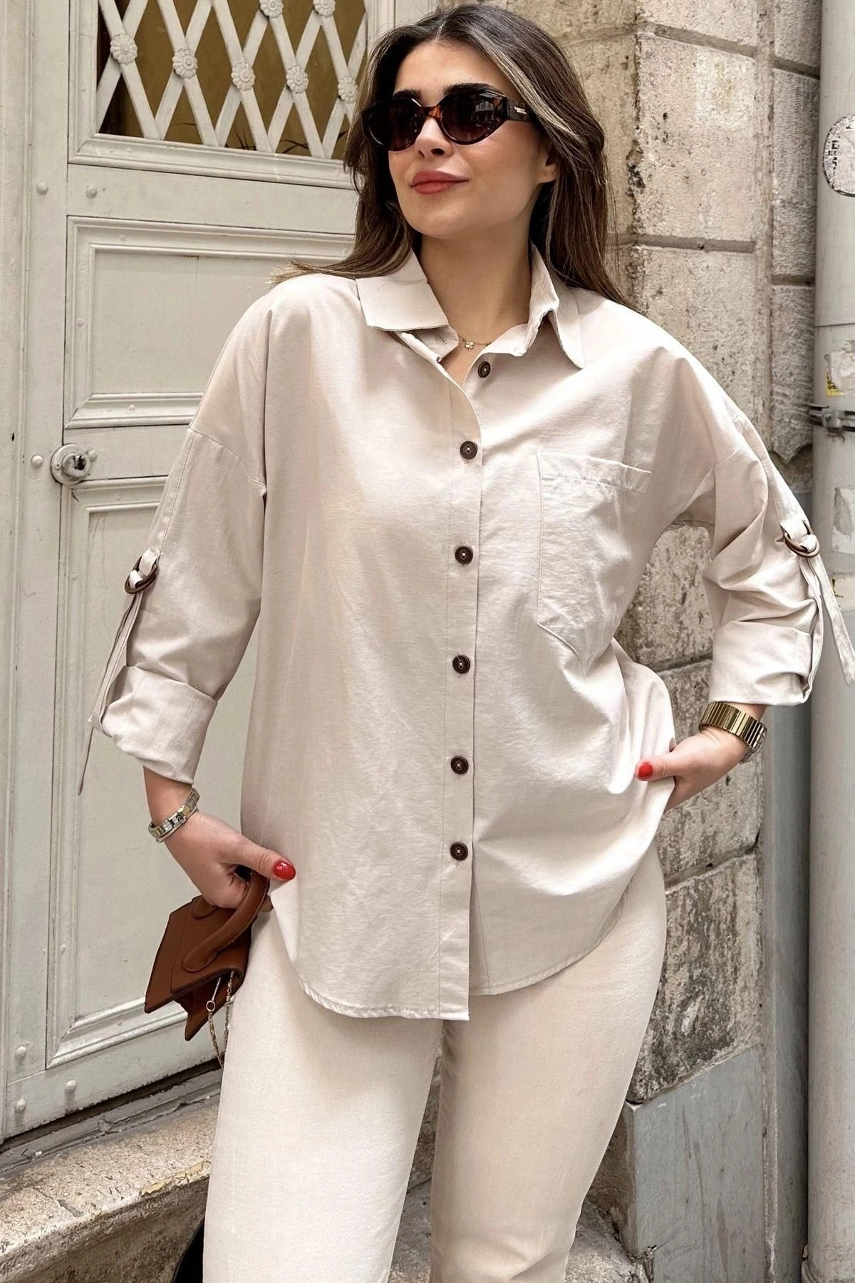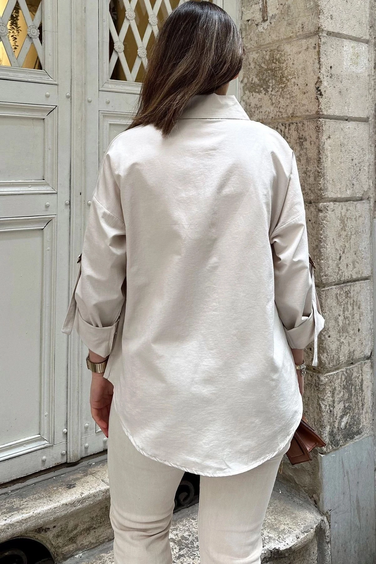 Kadın Bej Apoletli, Kolları Tokalı, Geniş Cepli, Eteği Oval, Salaş Gömlek