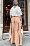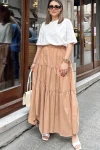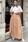 Kadın Bej Asimetrik Kesim, Beli Lastikli, Fırfırlı Kat Kumaş, Uzun Pamuklu Etek