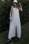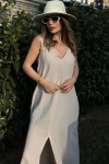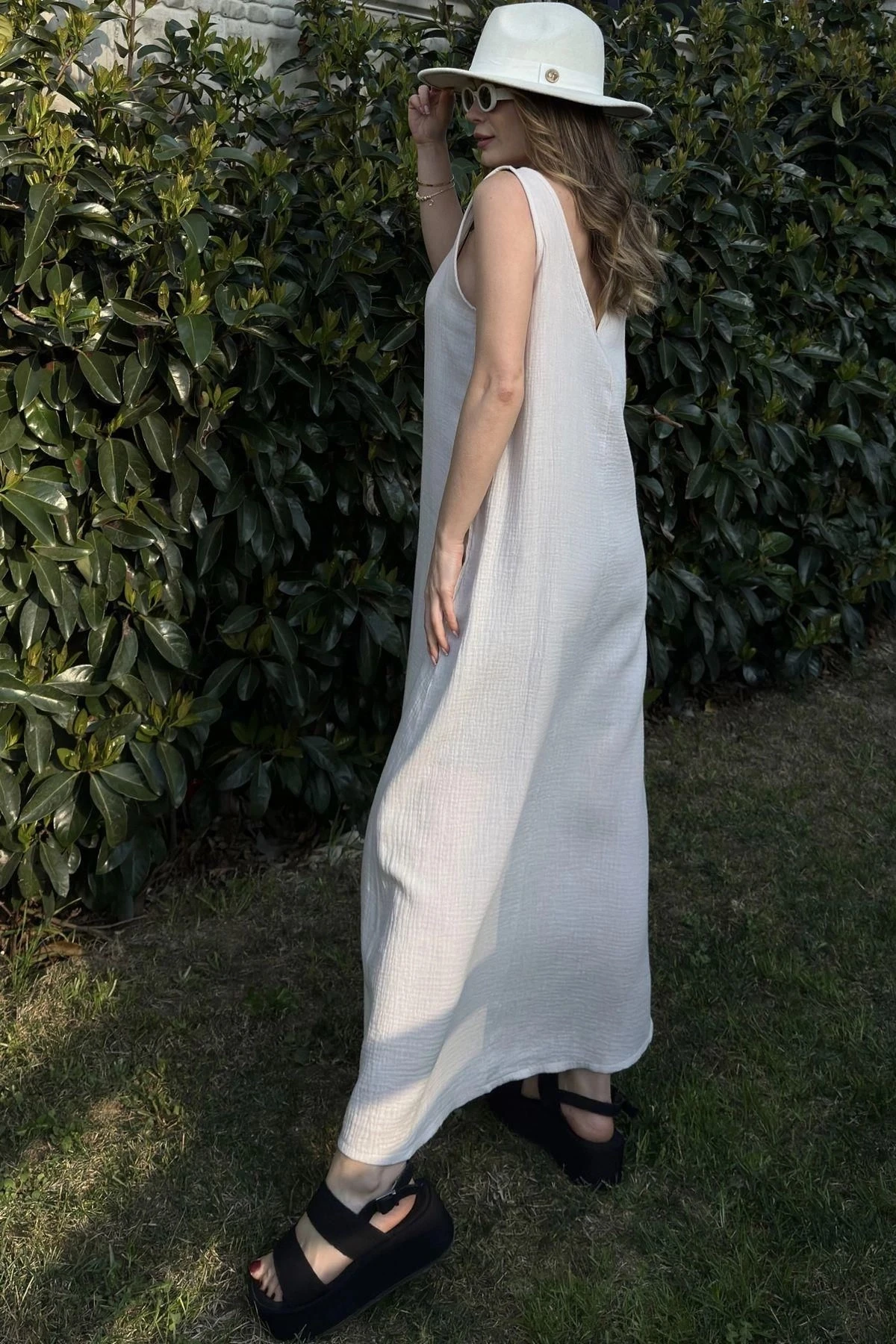 Kadın Bej Askılı İthal Müslin Kumaş, Önü Ve Arkası V Yaka, Önden Yırtmaçlı, Maksi/Uzun Salaş Elbise