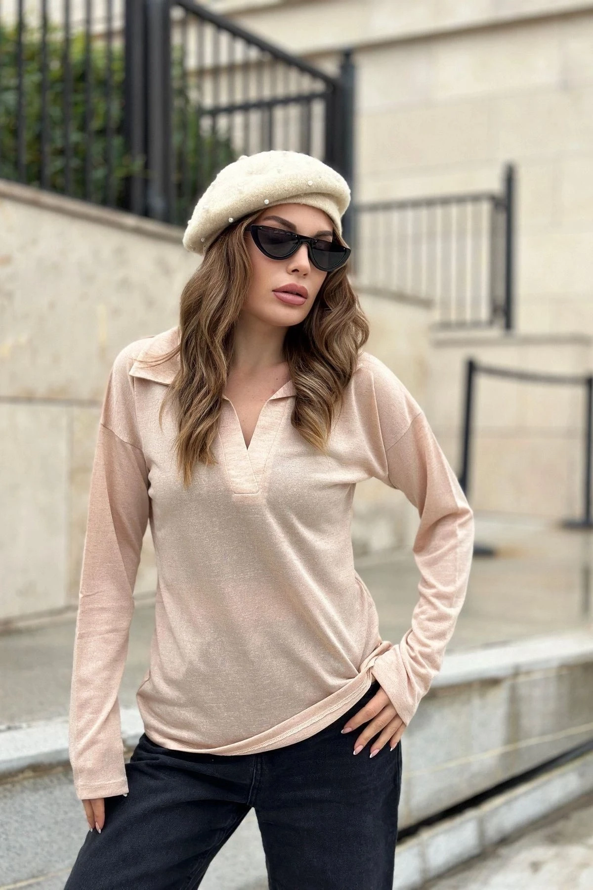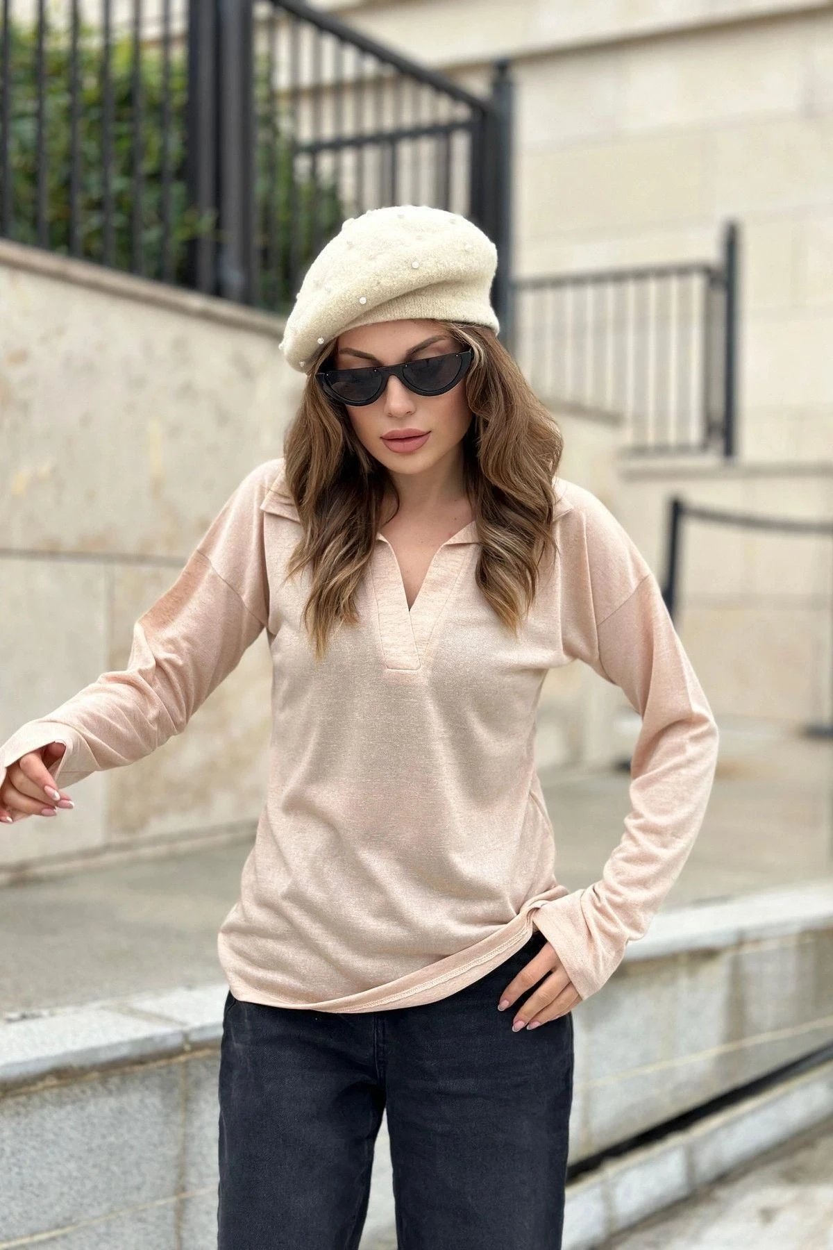 Kadın Bej Basic Stil Polo Yaka Uzun Kollu Keten Bluz Sweatshirt