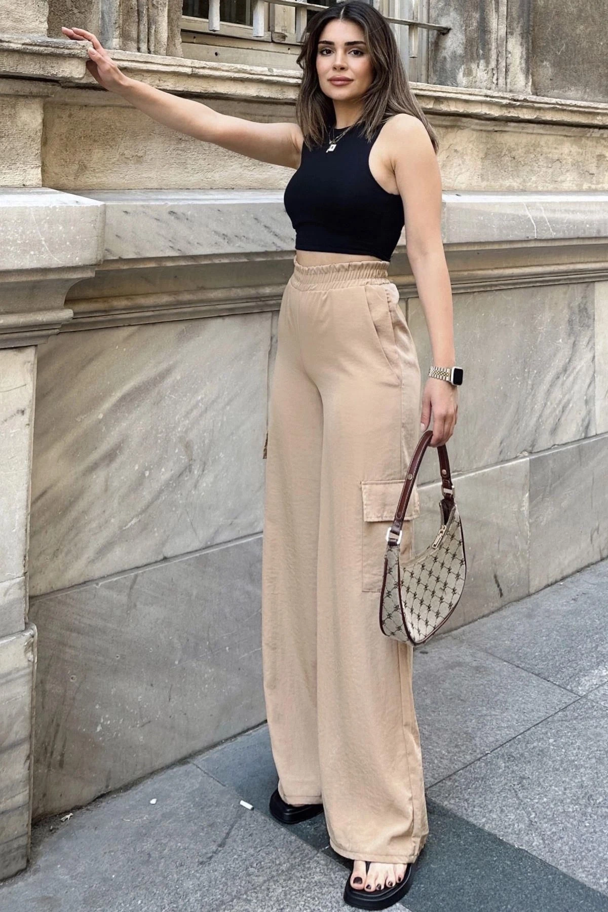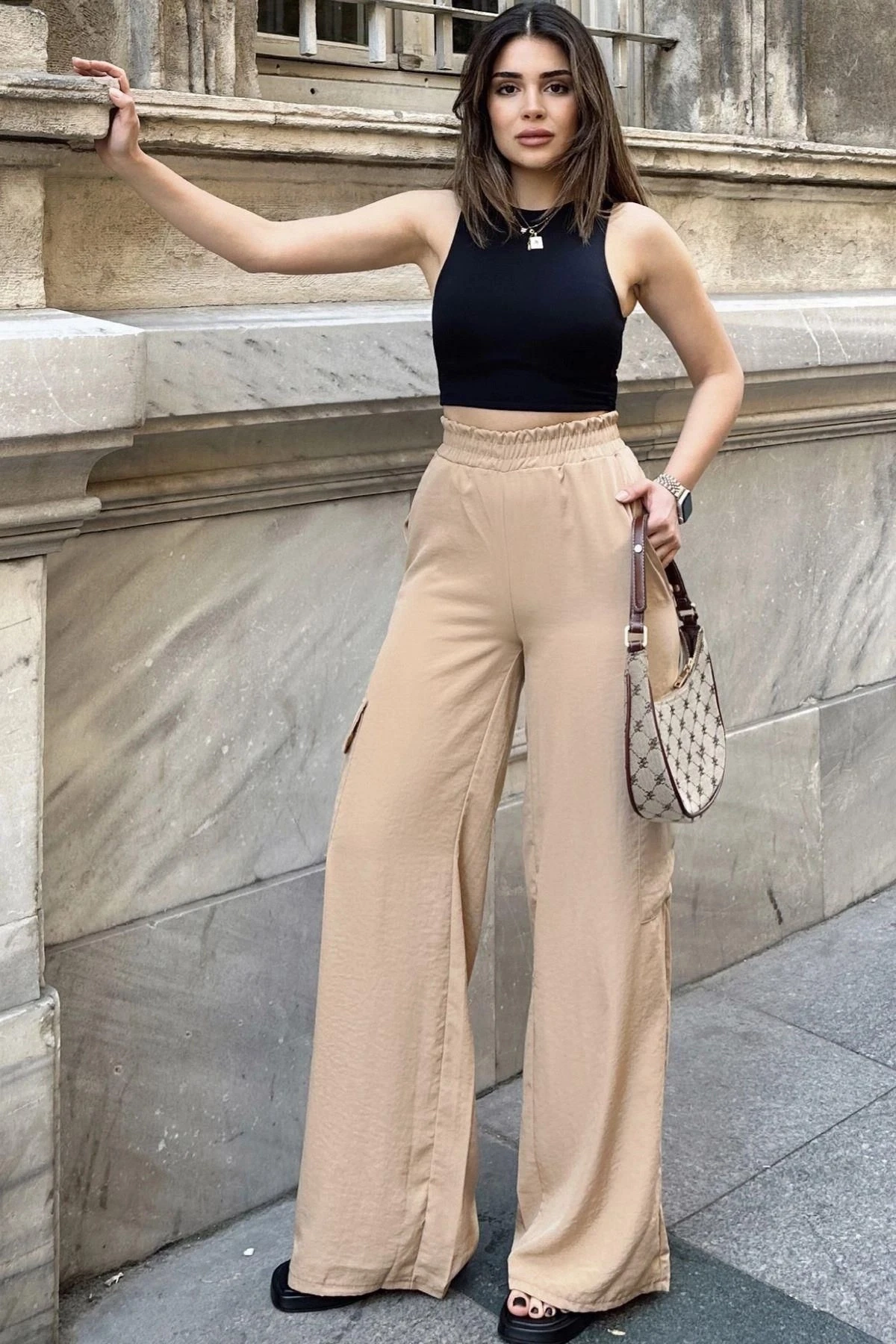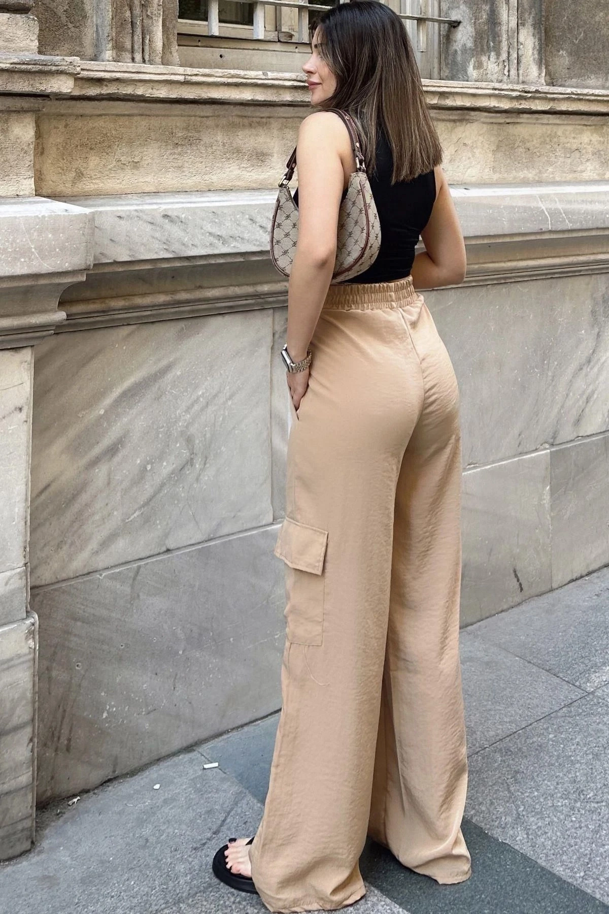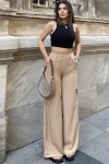 Kadın Bej Beli Lastikli, Kargo Cepli, Bol Paça Kupra Kumaş Palazzo Pantolon - Tesettüre Uygun