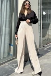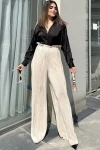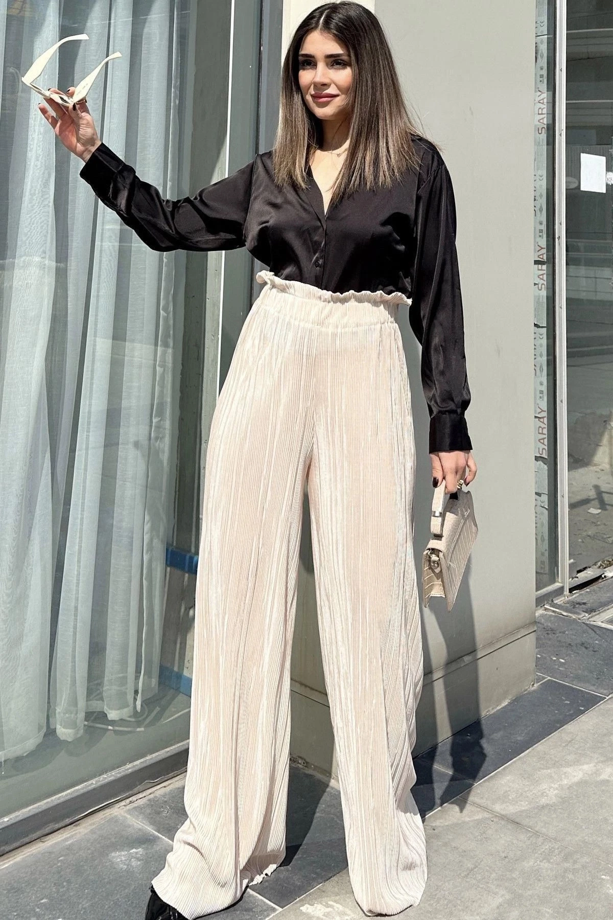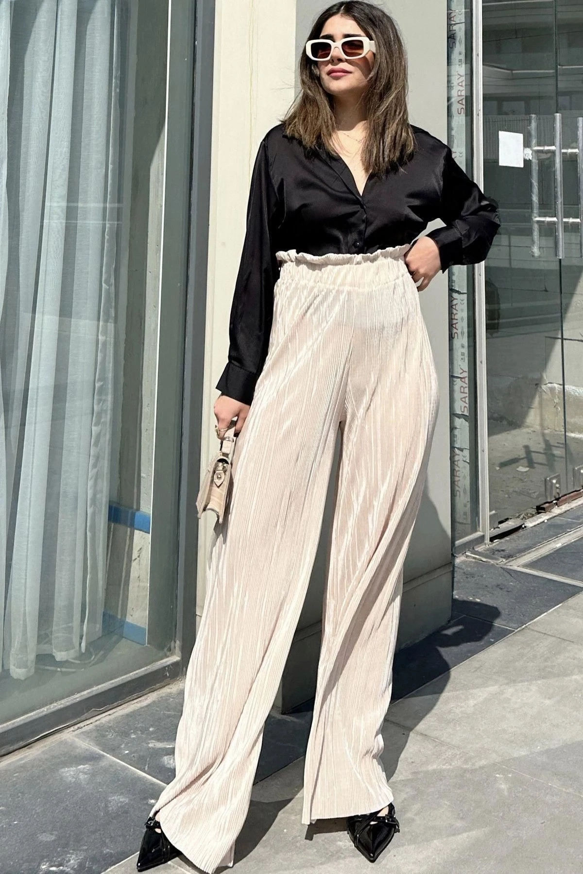 Kadın Bej Beli Lastikli, Yüksel Bel, Salaş Kesim, Bol Paça Bürümcük Pantolon