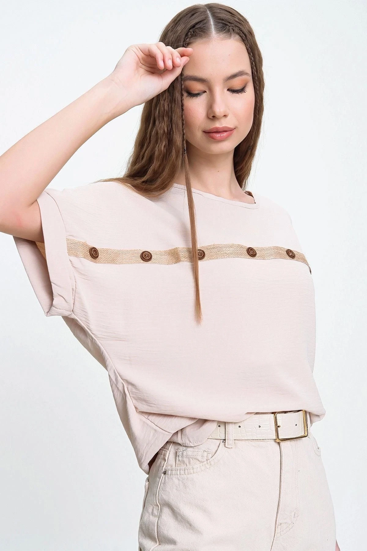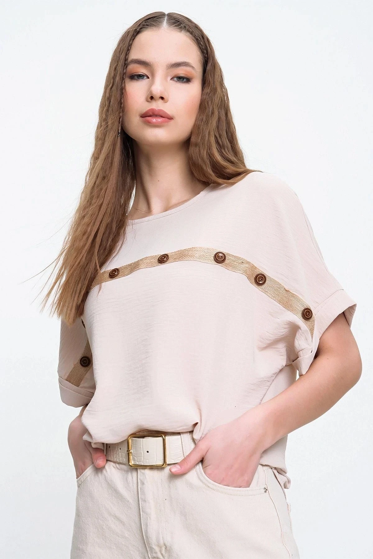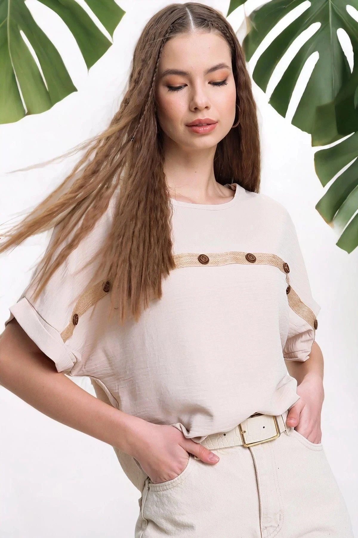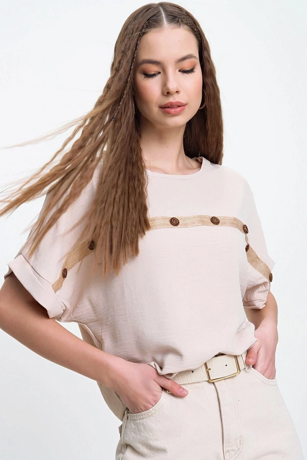 Sunulan ürün, rahatlığı ve şıklığı bir araya getiren Bej Renk Bisiklet Yaka Rahat Hasır Düğme ve Şerit Detaylı Kısa Kollu Salaş Airobin Bluz, gardırobunuza tarz ve ferahlık katacak mükemmel bir seçenektir.; Bu bluzun kumaşı, %60 polyester ve %40 pamuktan oluşmaktadır.; Bu karışım, yumuşaklık ve dayanıklılığı bir araya getirerek size uzun süreli bir kullanım sağlar.; Ayrıca, polyesterin üstün nefes alabilirlik özelliği ve pamuğun doğal yumuşak dokusu, gün boyu serin ve rahat kalmanızı sağlar.; Bej renk, klasik ve zamansız bir seçimdir.; Bu renk, her türlü stil ve kombinasyonla uyum sağlar ve giyim seçeneklerinizi genişletir.; Bisiklet yaka detayı, bluza modern bir dokunuş katarken, hasır dokuması ve şerit detayları, bluza özgün bir görünüm kazandırır.; Bu bluz, salaş ve rahat bir kesime sahiptir, bu da hem günlük hayatta hem de özel etkinliklerde giyim konforu sunar.; Kısa kollu tasarımı, yaz aylarında serin ve hafif hissetmenizi sağlar.; Ayrıca, bluzun düğme detayı, hem şık bir görünüm hem de kolay giyip çıkarabilme imkanı sunar.; Bej Renk Bisiklet Yaka Rahat Hasır Düğme ve Şerit Detaylı Kısa Kollu Salaş Airobin Bluz, şık ve konforlu bir seçenek arayanların tercihi olacak.; Bu bluzla tarzınızı ifade ederken aynı zamanda rahatlıktan ödün vermezsiniz.; Herhangi bir mevsimde giyebileceğiniz ve farklı kombinasyonlarla kullanabileceğiniz çok yönlü bir parçadır.