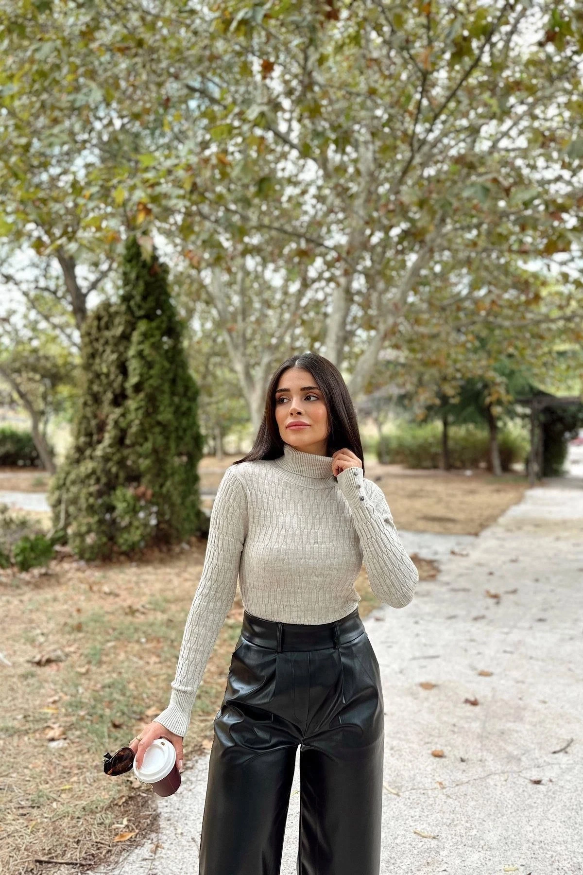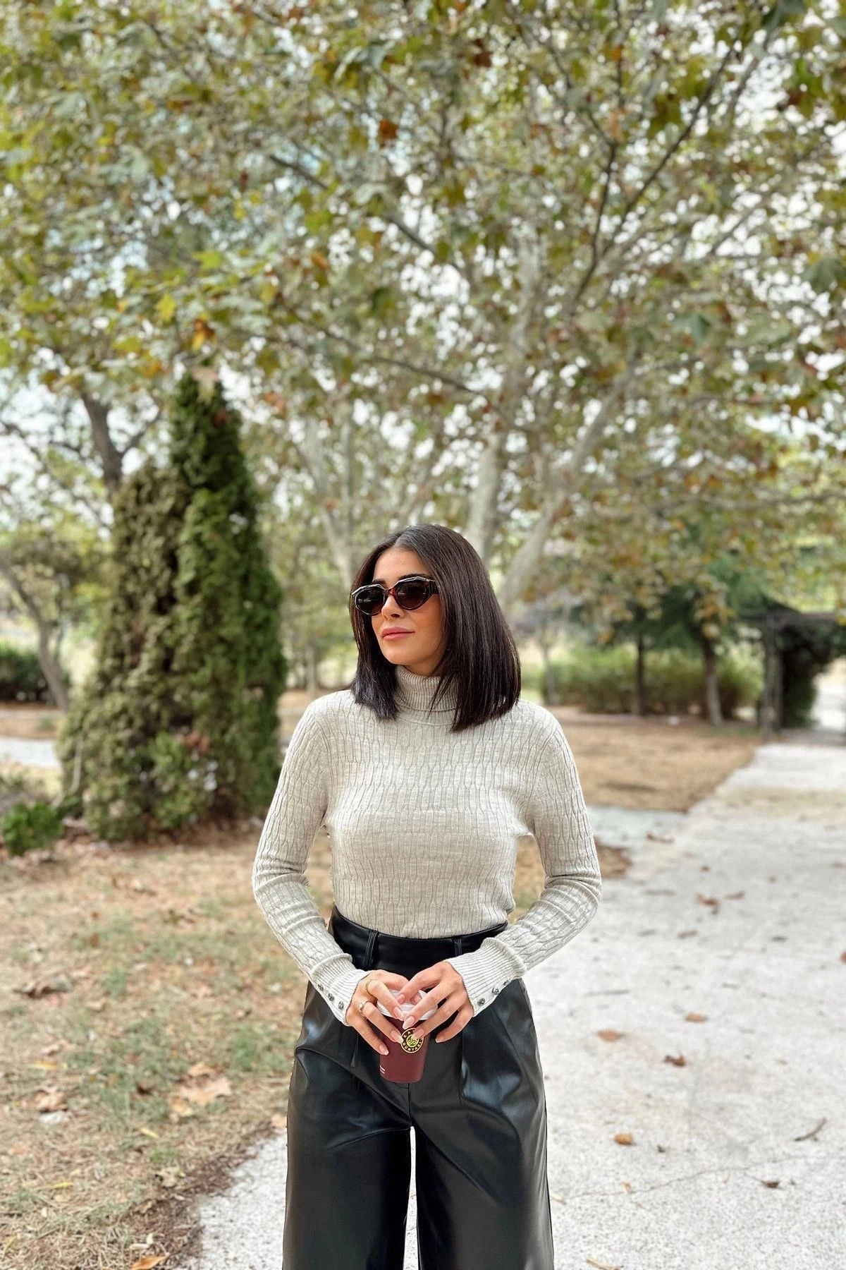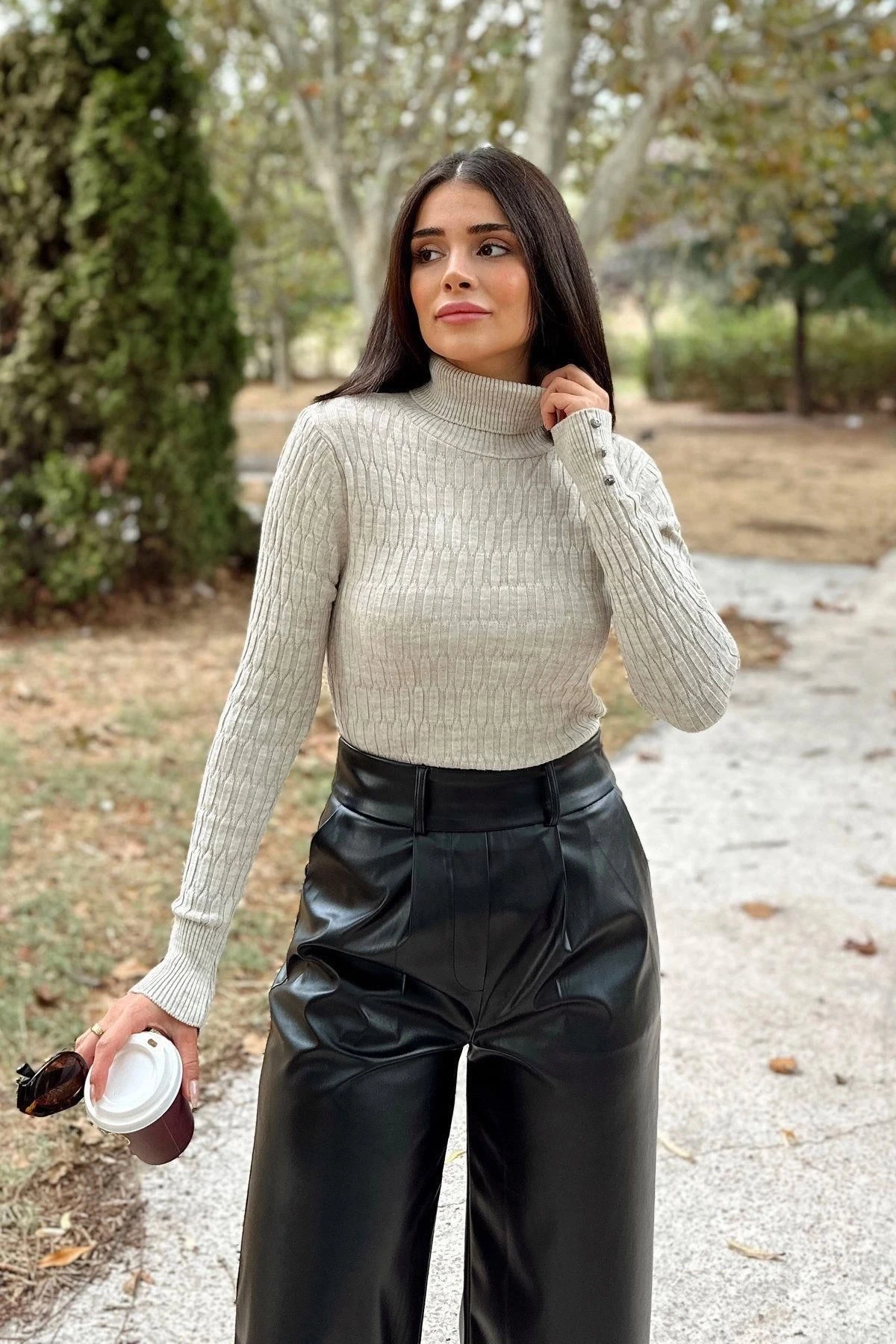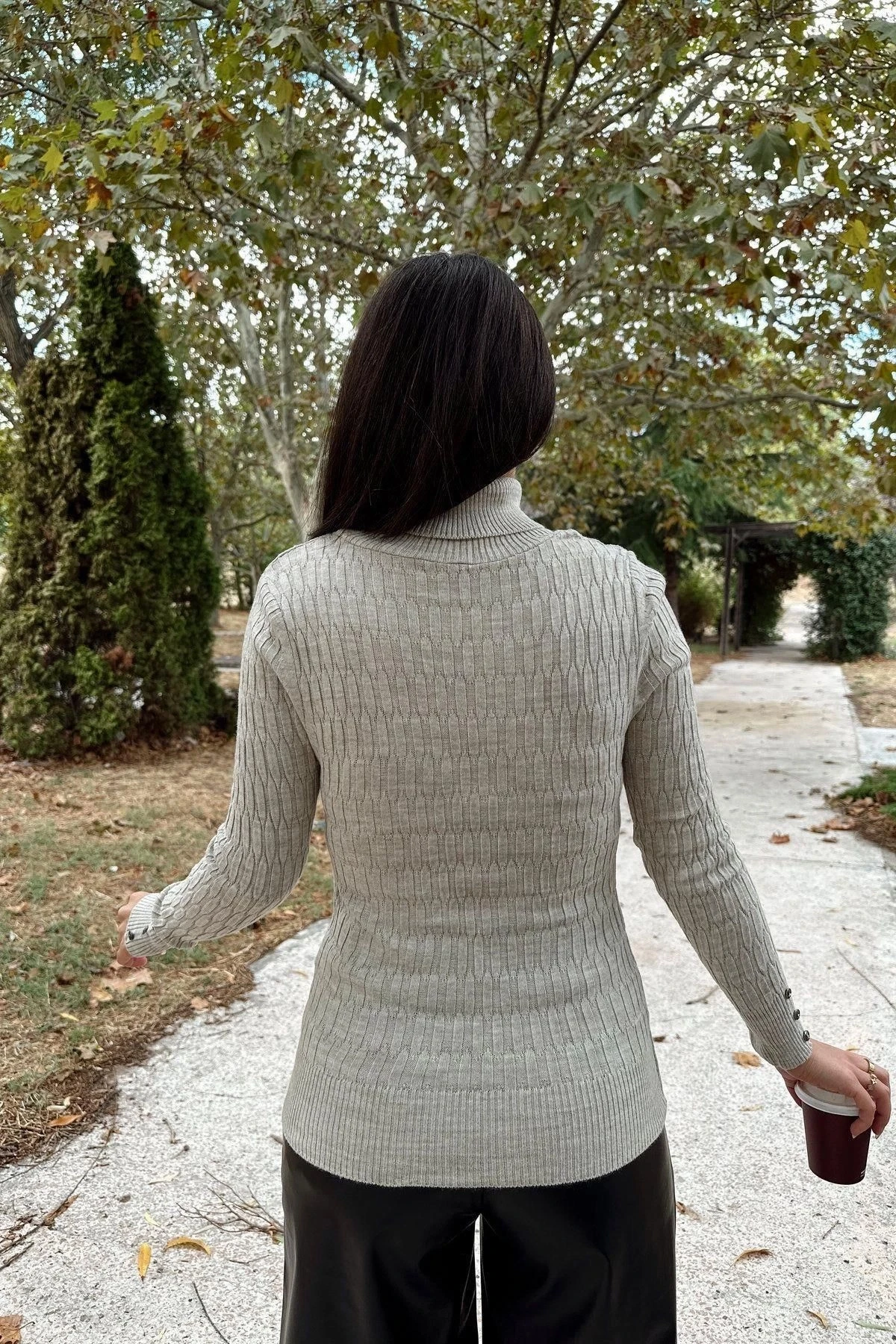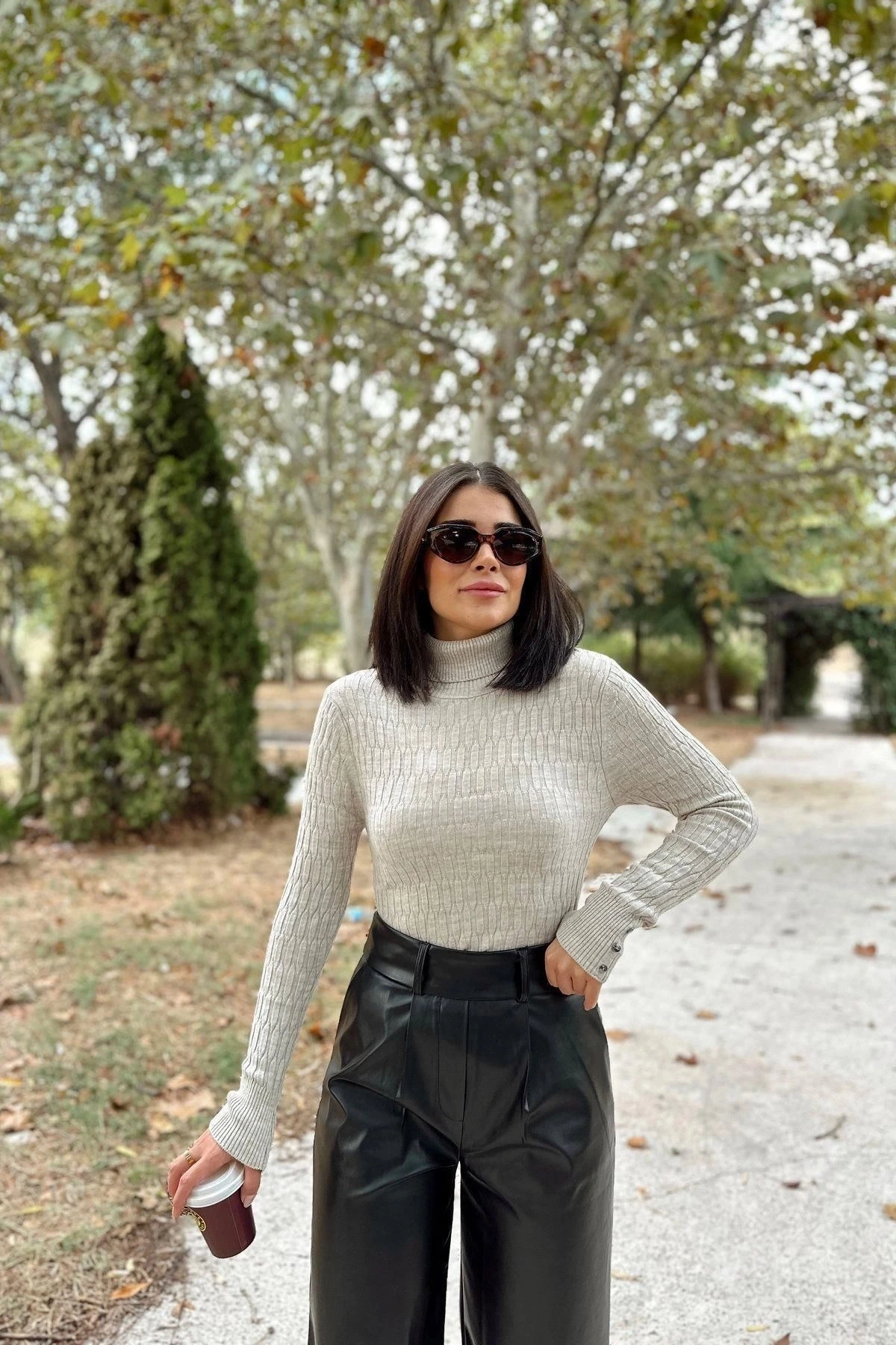 Kadın Bej Boğazlı Yaka, Uzun Kol, Vucüda Oturan Esnek Kumaş, Düğme Manşet, Örgü Desen, Triko Bluz