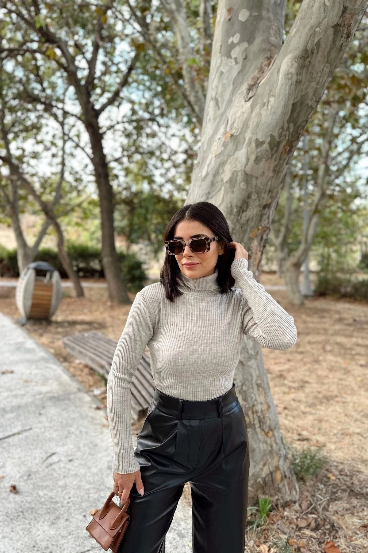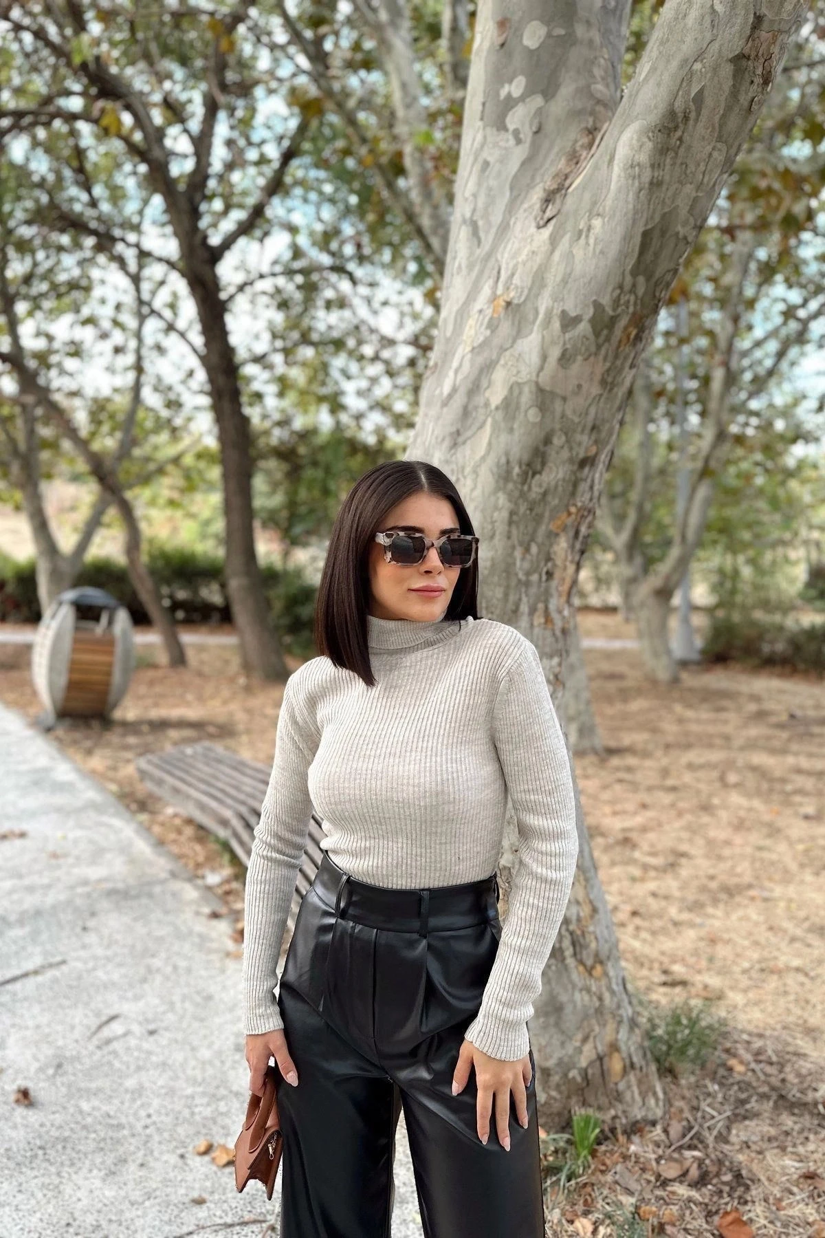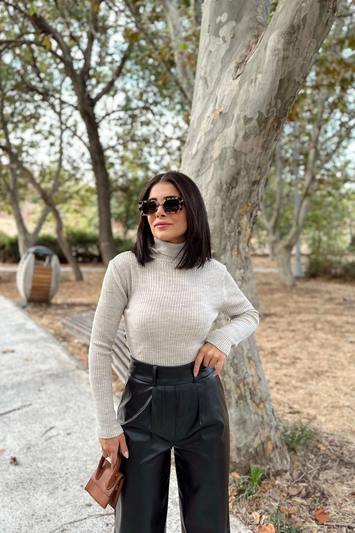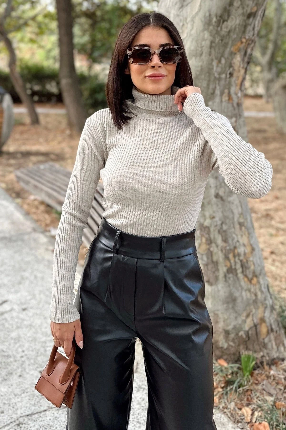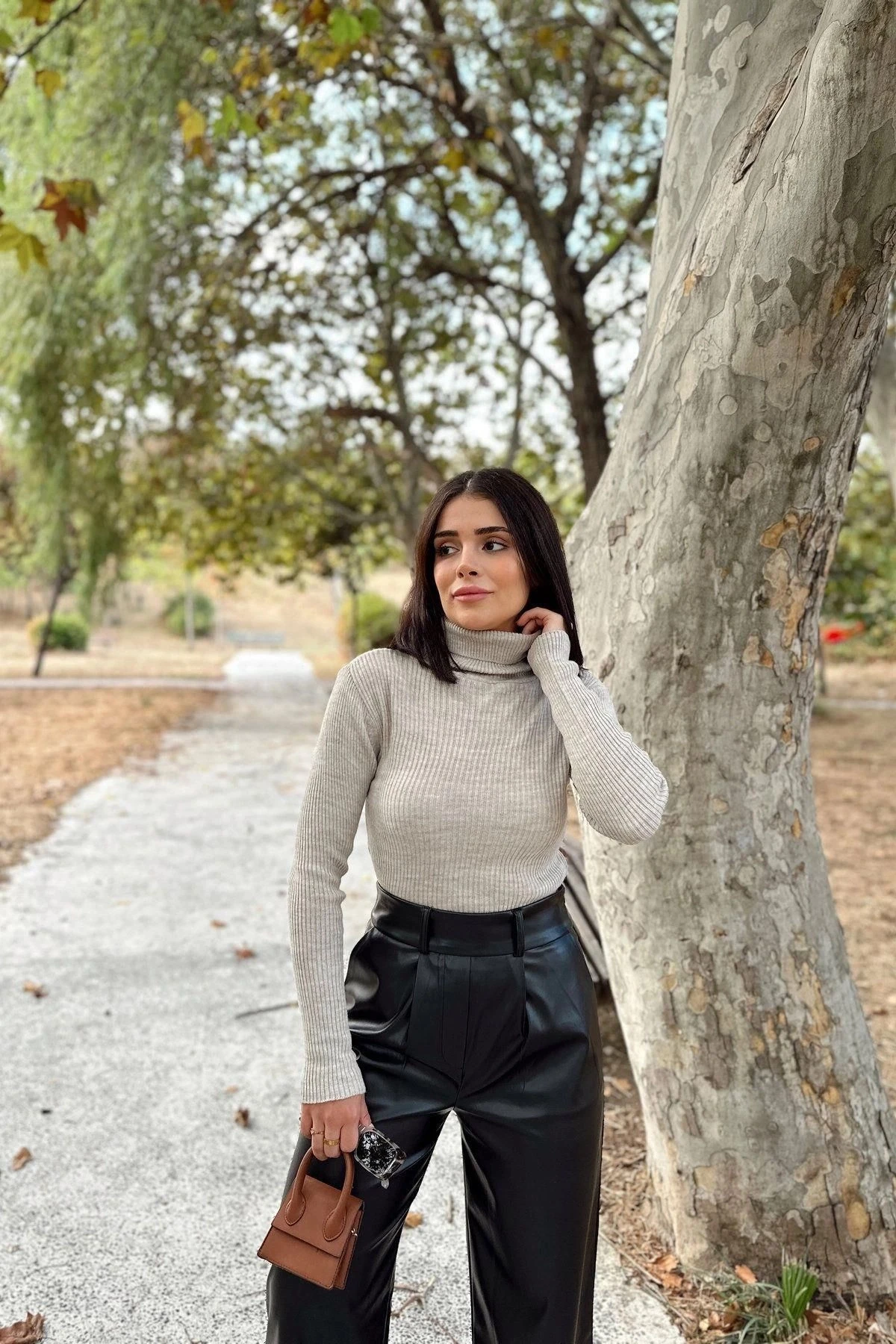Kadın Bej Boğazlı Yaka, Uzun Kol, Vucüda Oturan Kalıp, Esnek Kumaş, Düz Desen, Triko Bluz