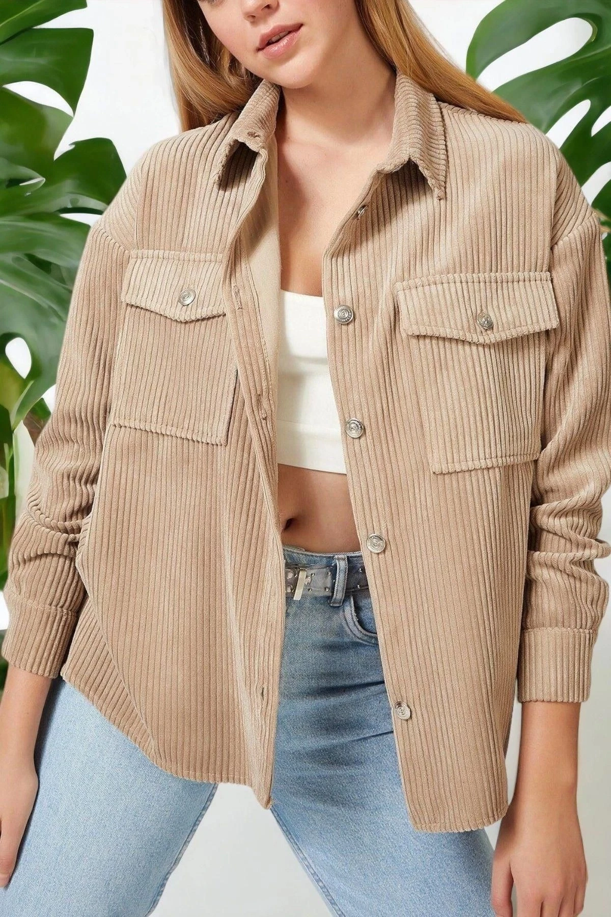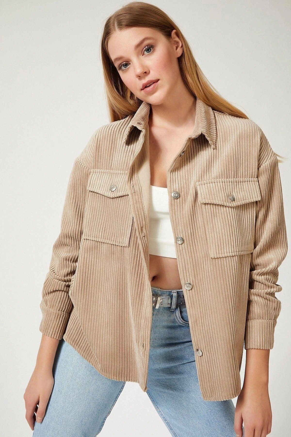 Kadın Bej Ceket Yaka Uzun Kol, Cep Detaylı, Fitilli Regular Kesim Standart Boy Yelek