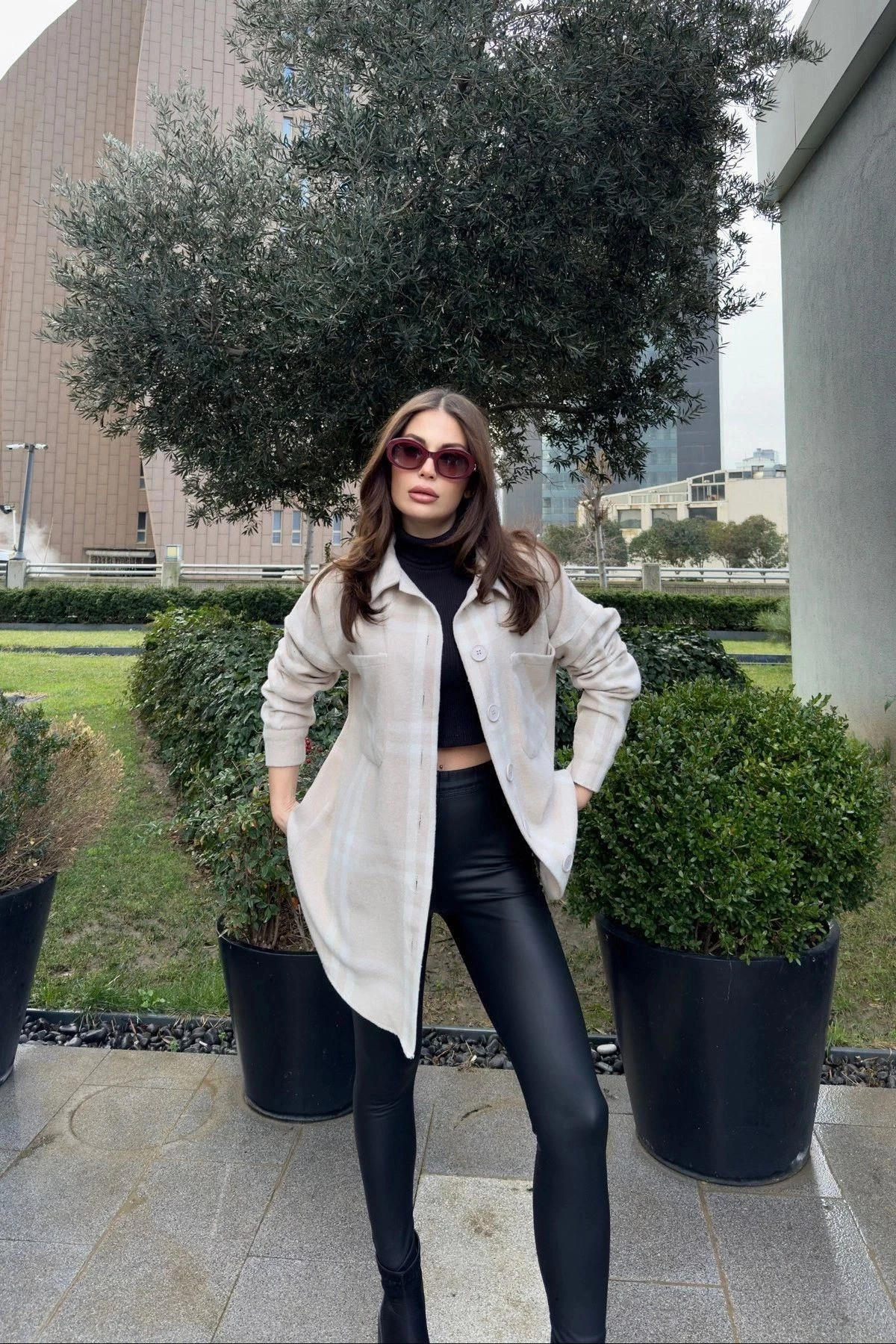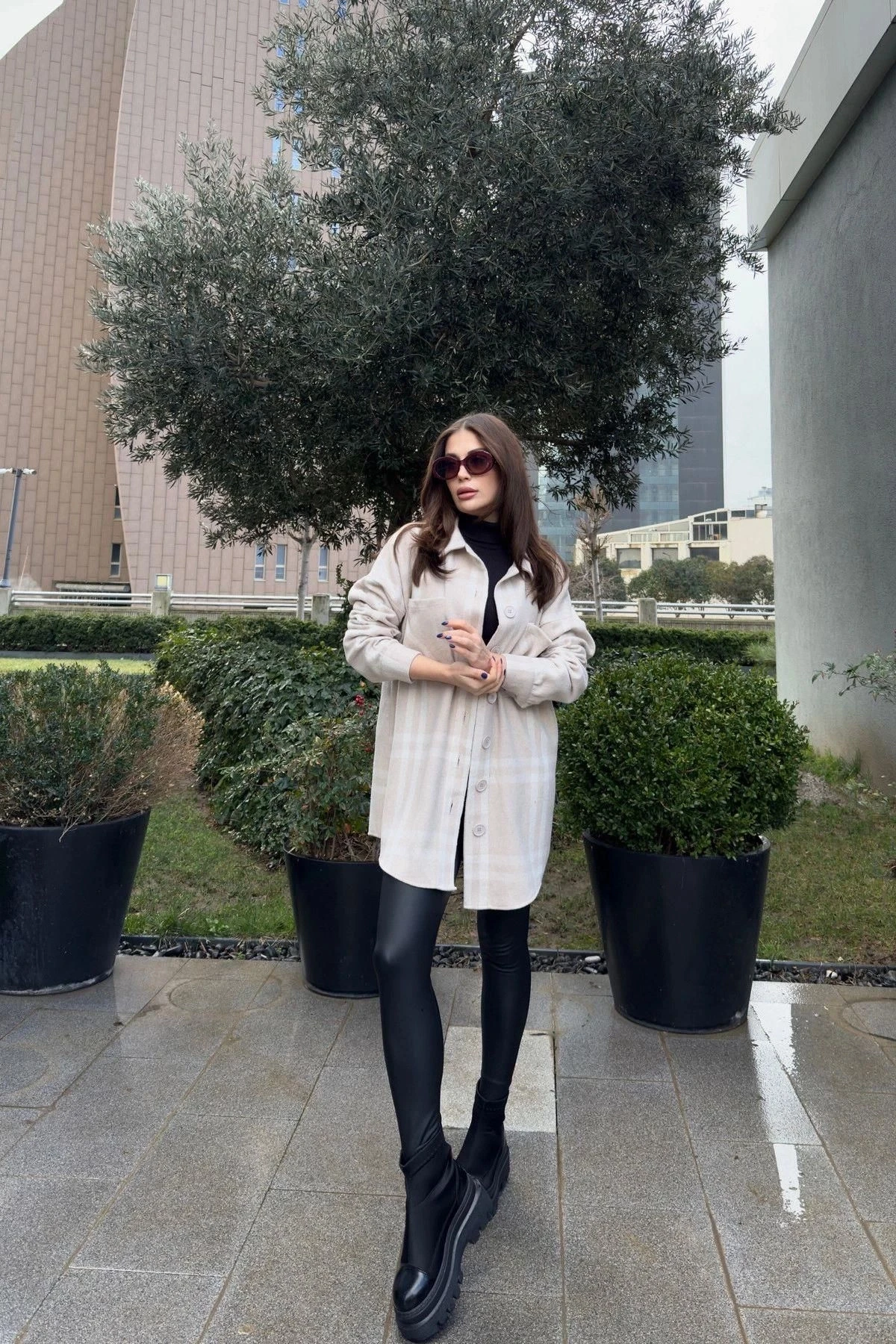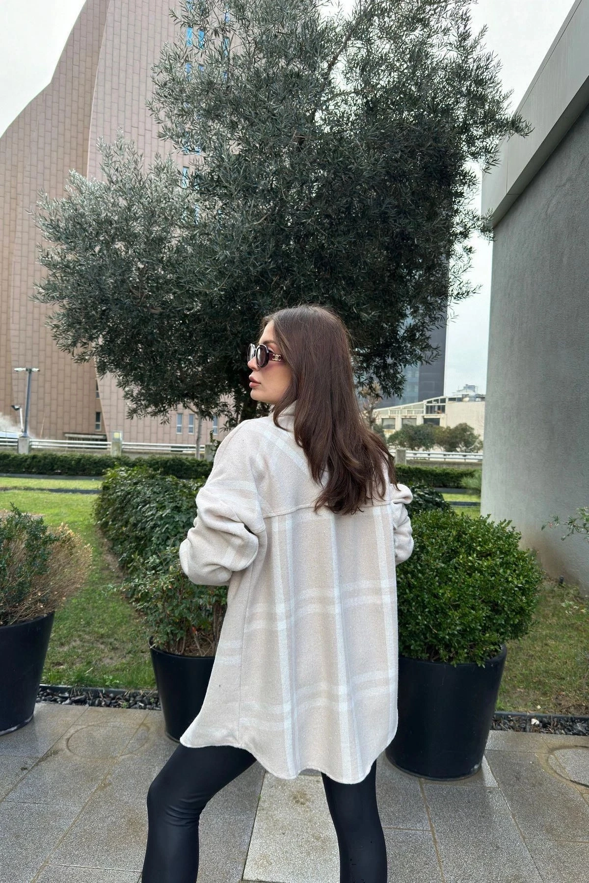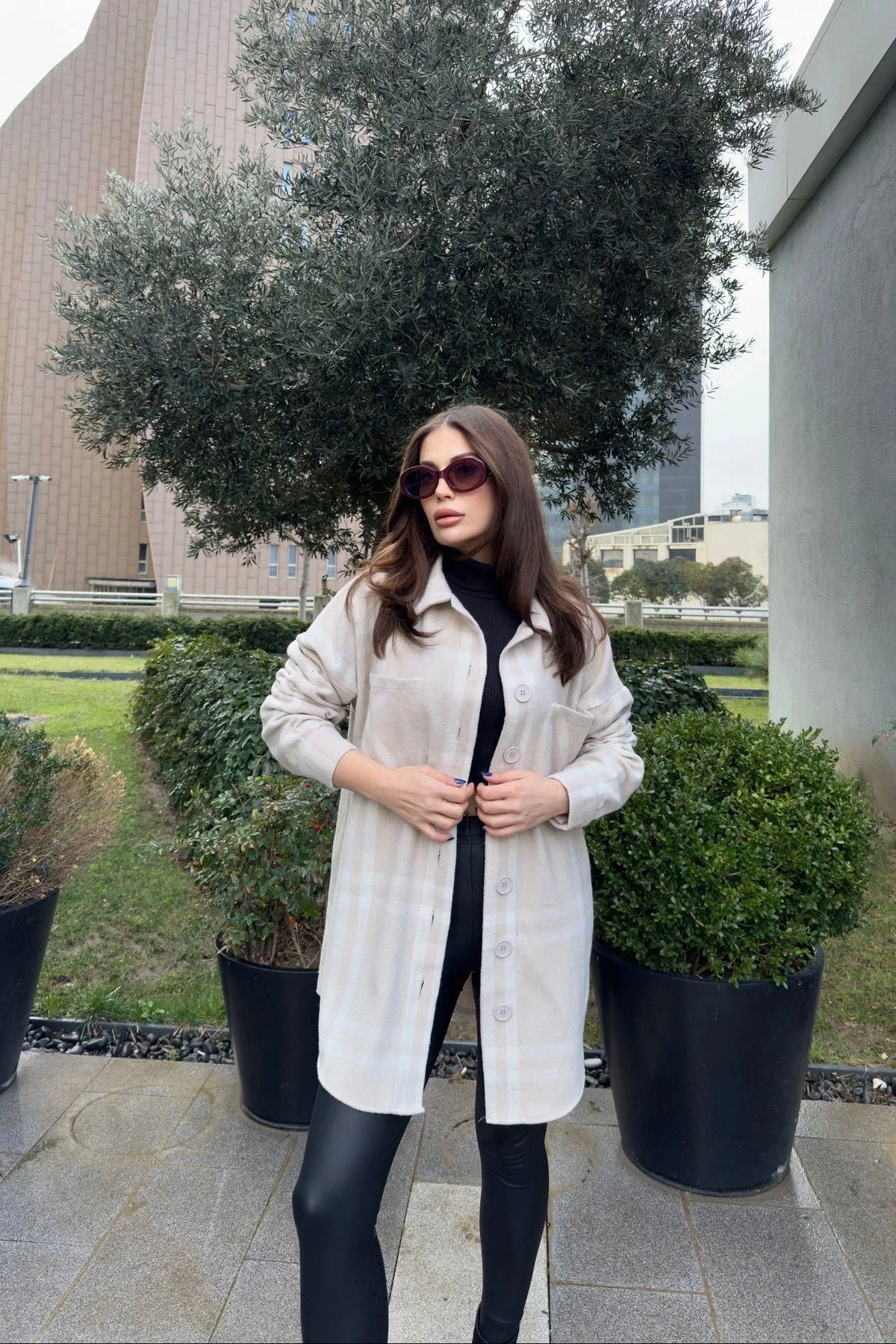 Kadın Bej Çift Cepli, Ekose Desenli, Rahat Kalıp, Uzun Kaşe Gömlek