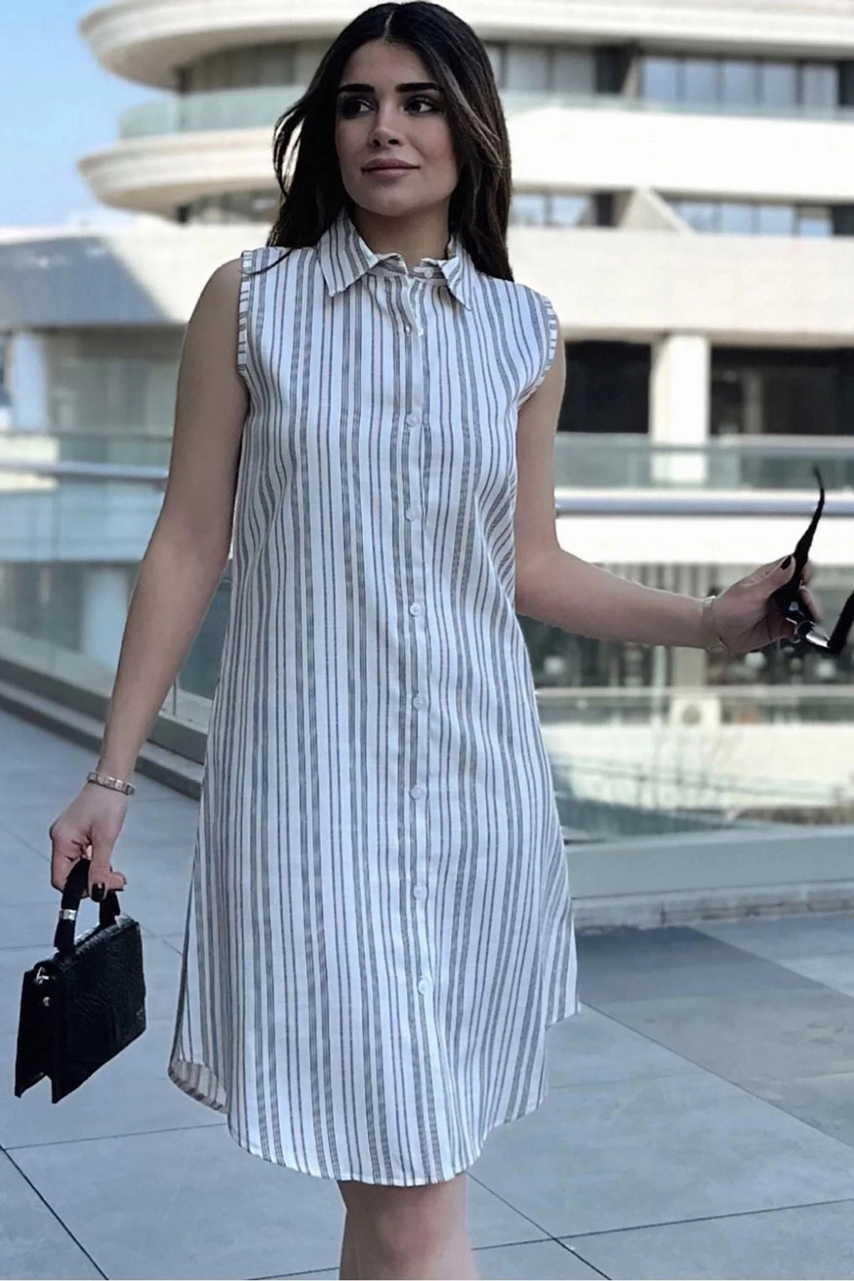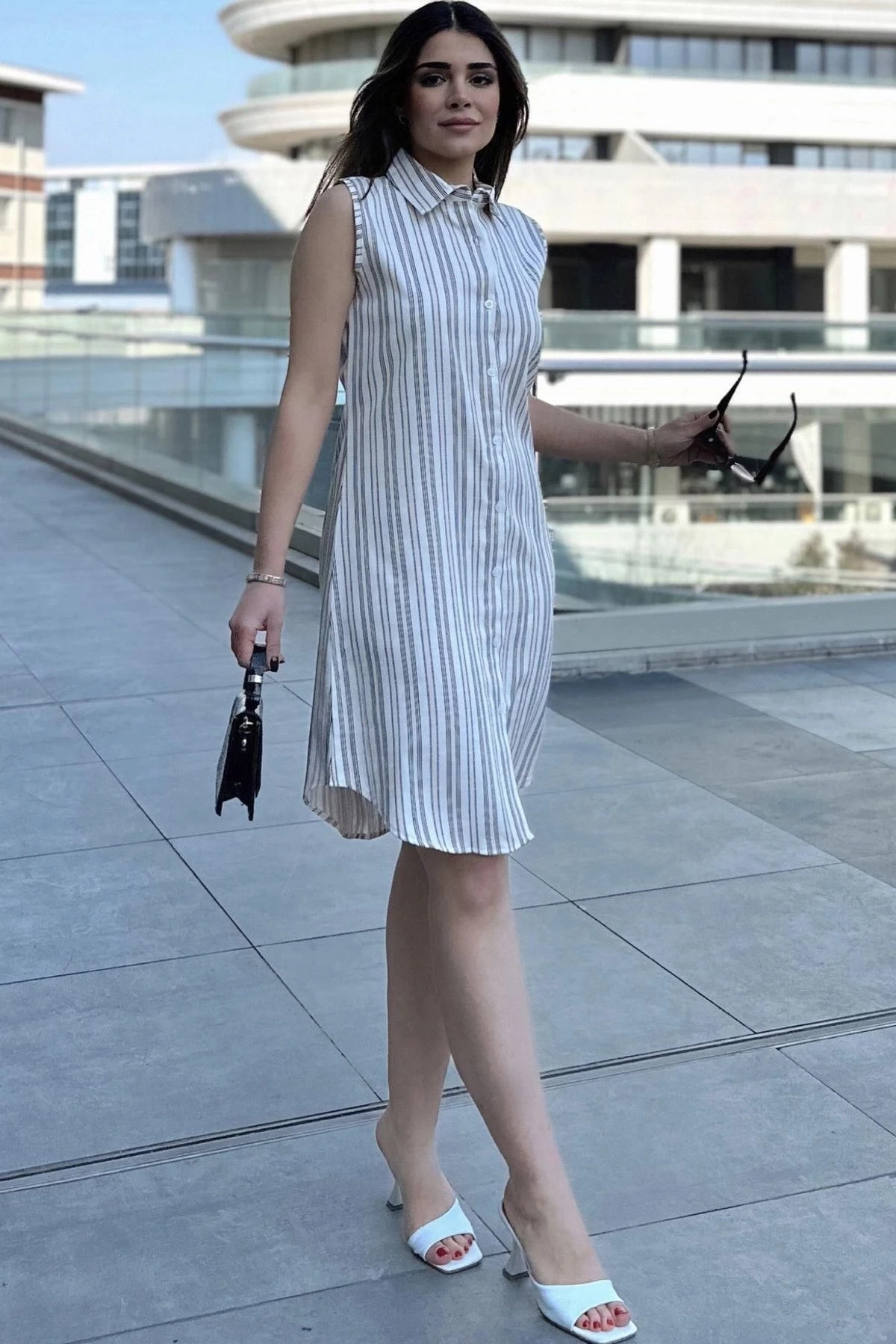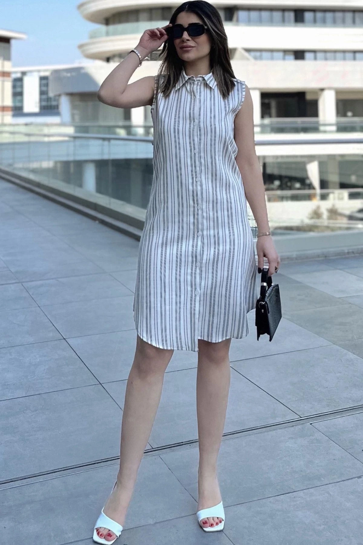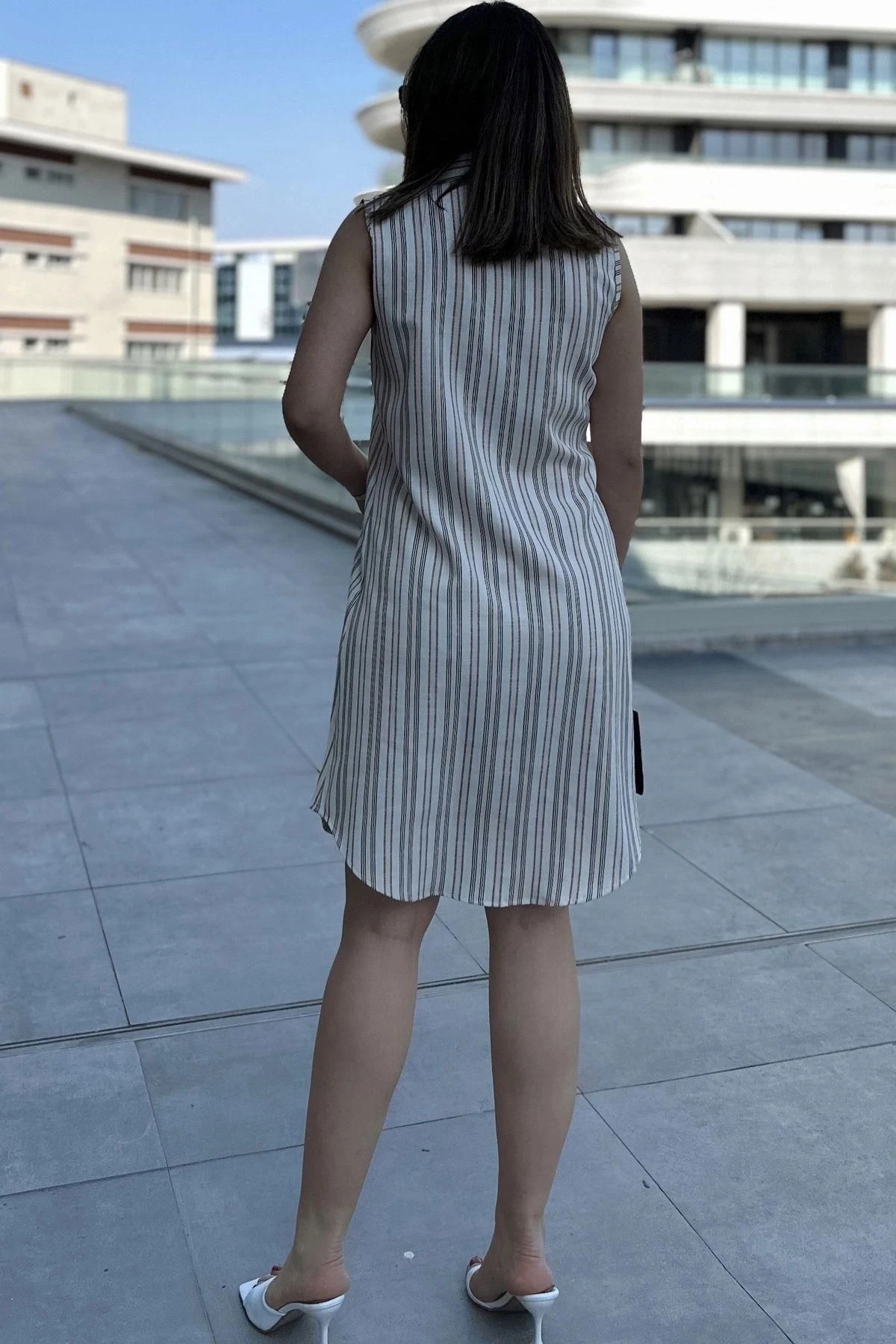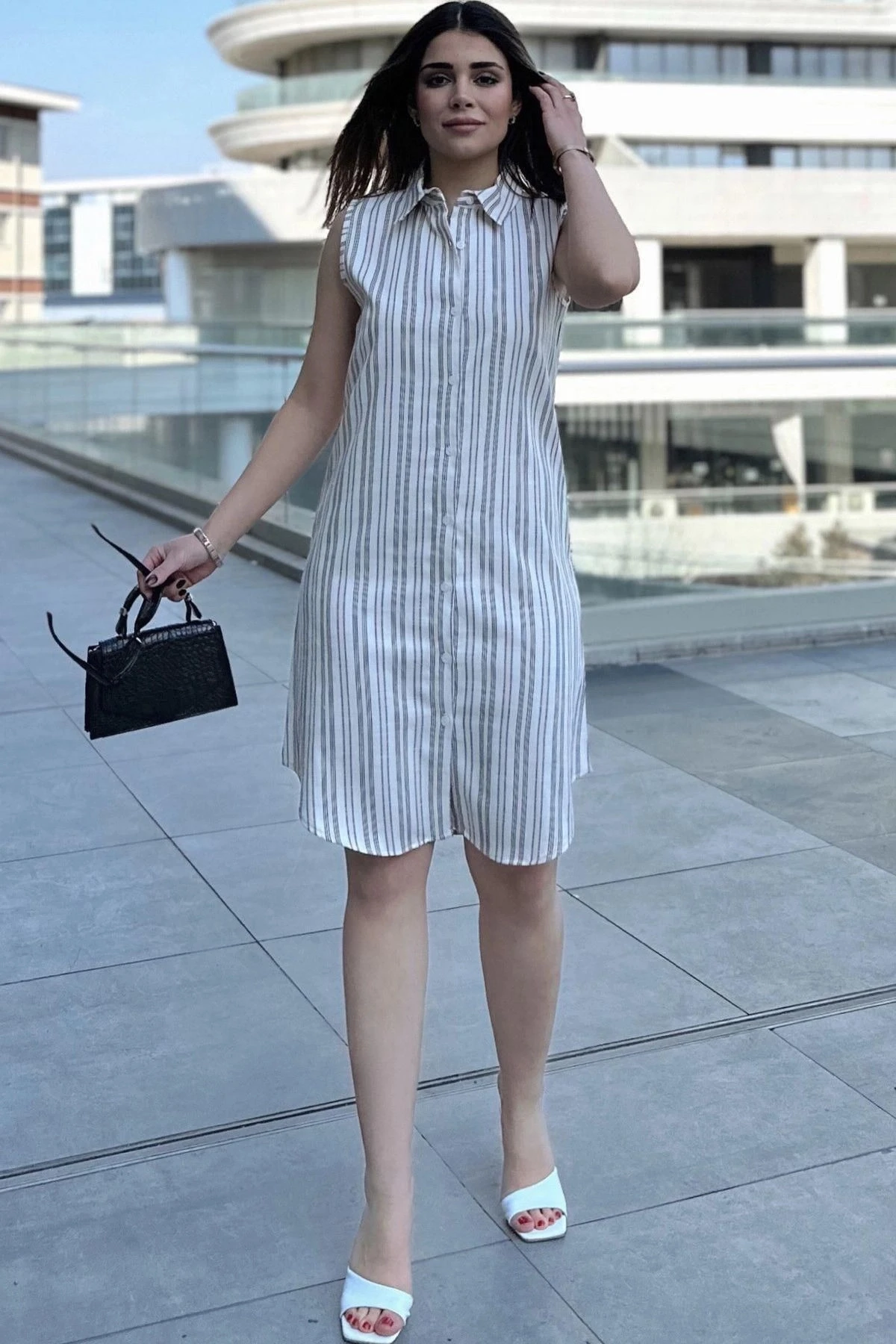 Kadın Bej Çizgili Desen, İthal Kumaş, Kolsuz, Rahat Kesim, Midi Gömlek Elbise