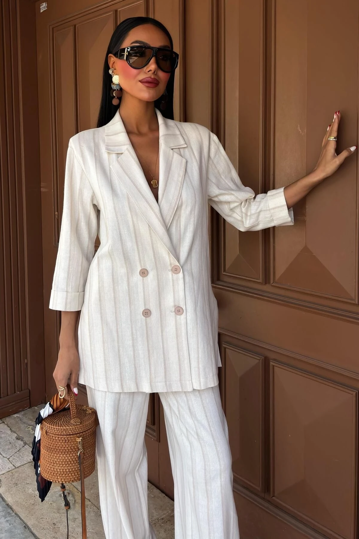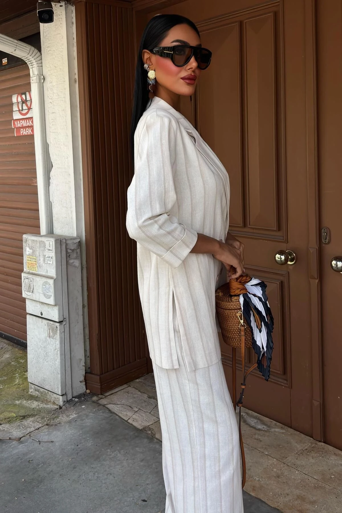 Kadın Bej Çizgili Keten Ceketli Uzun Takım