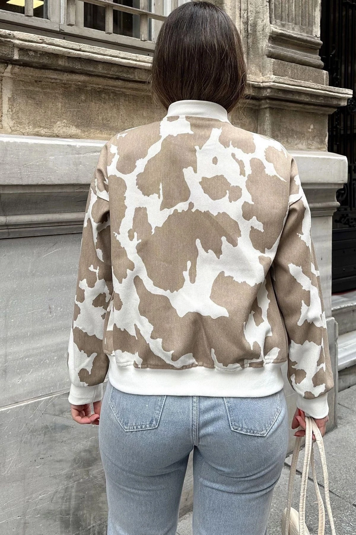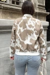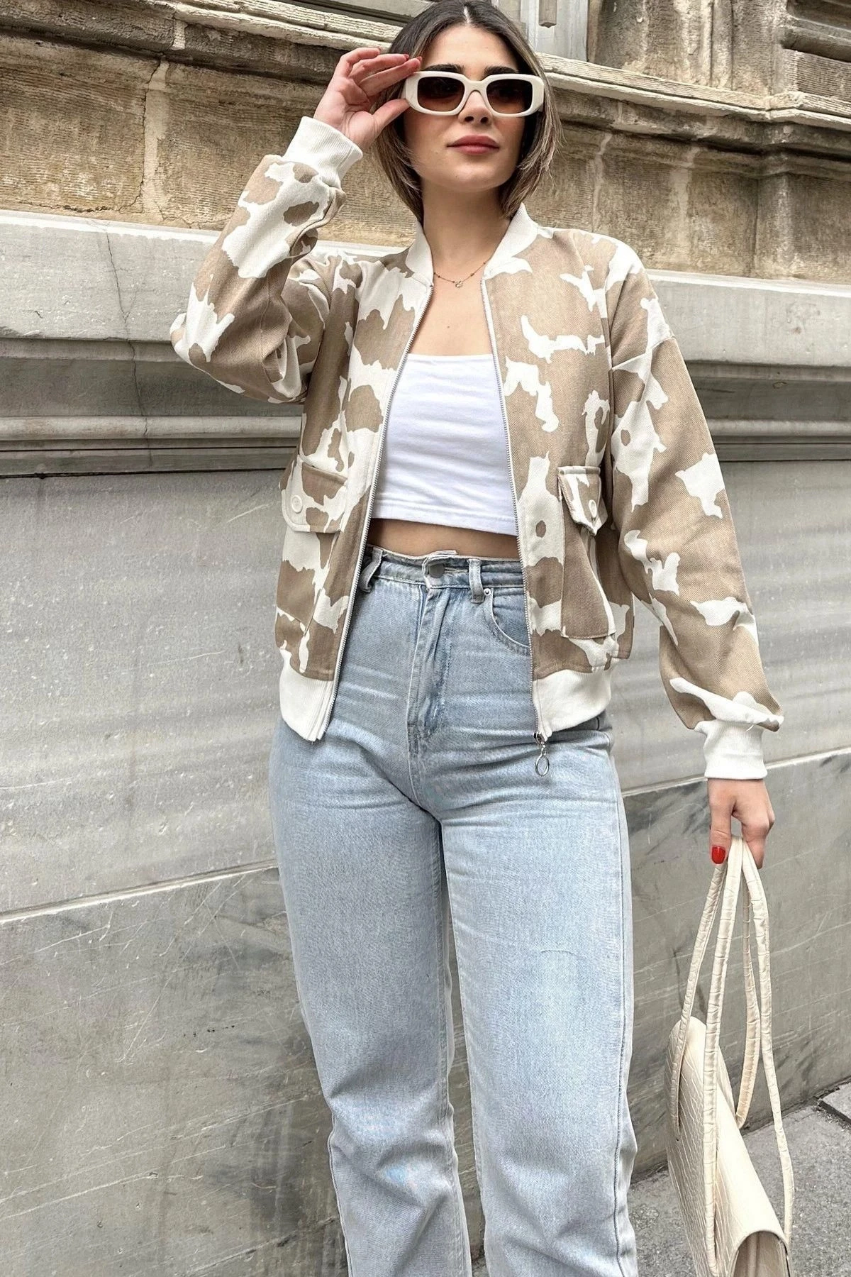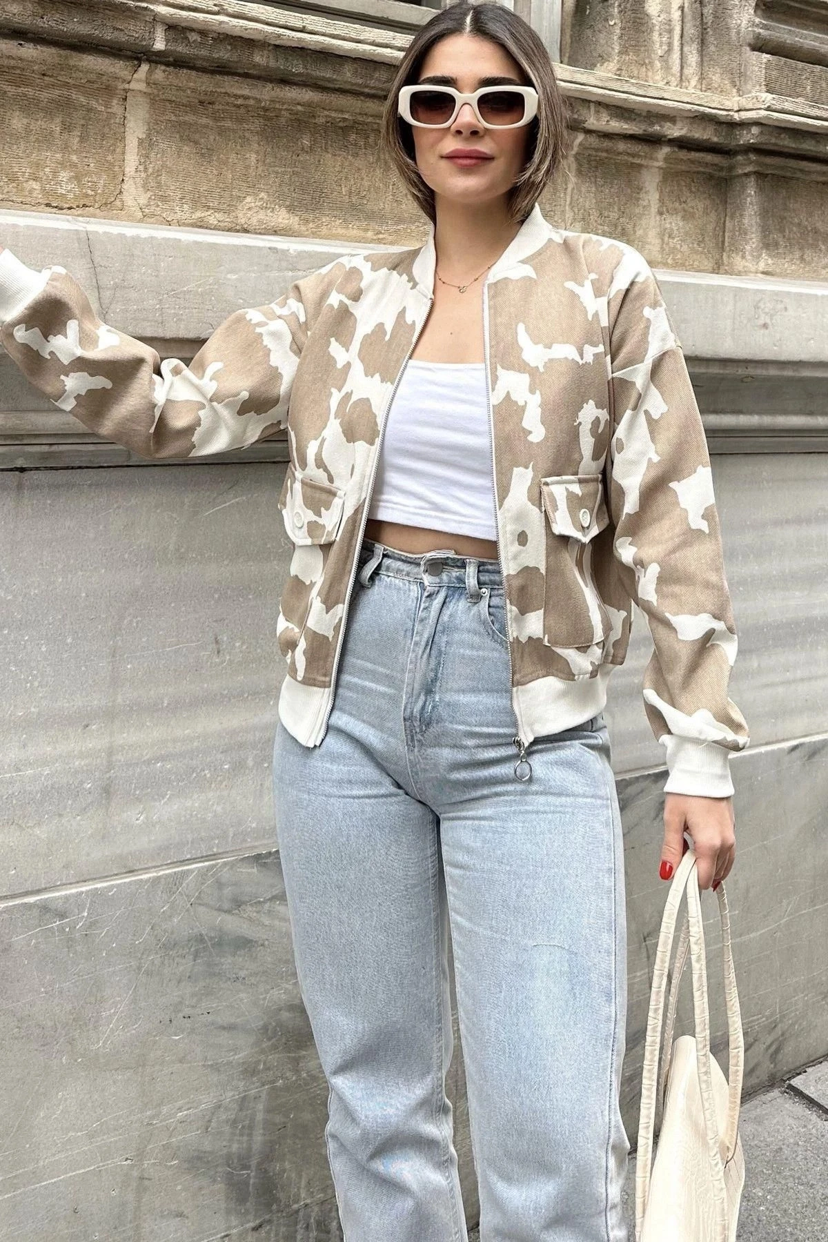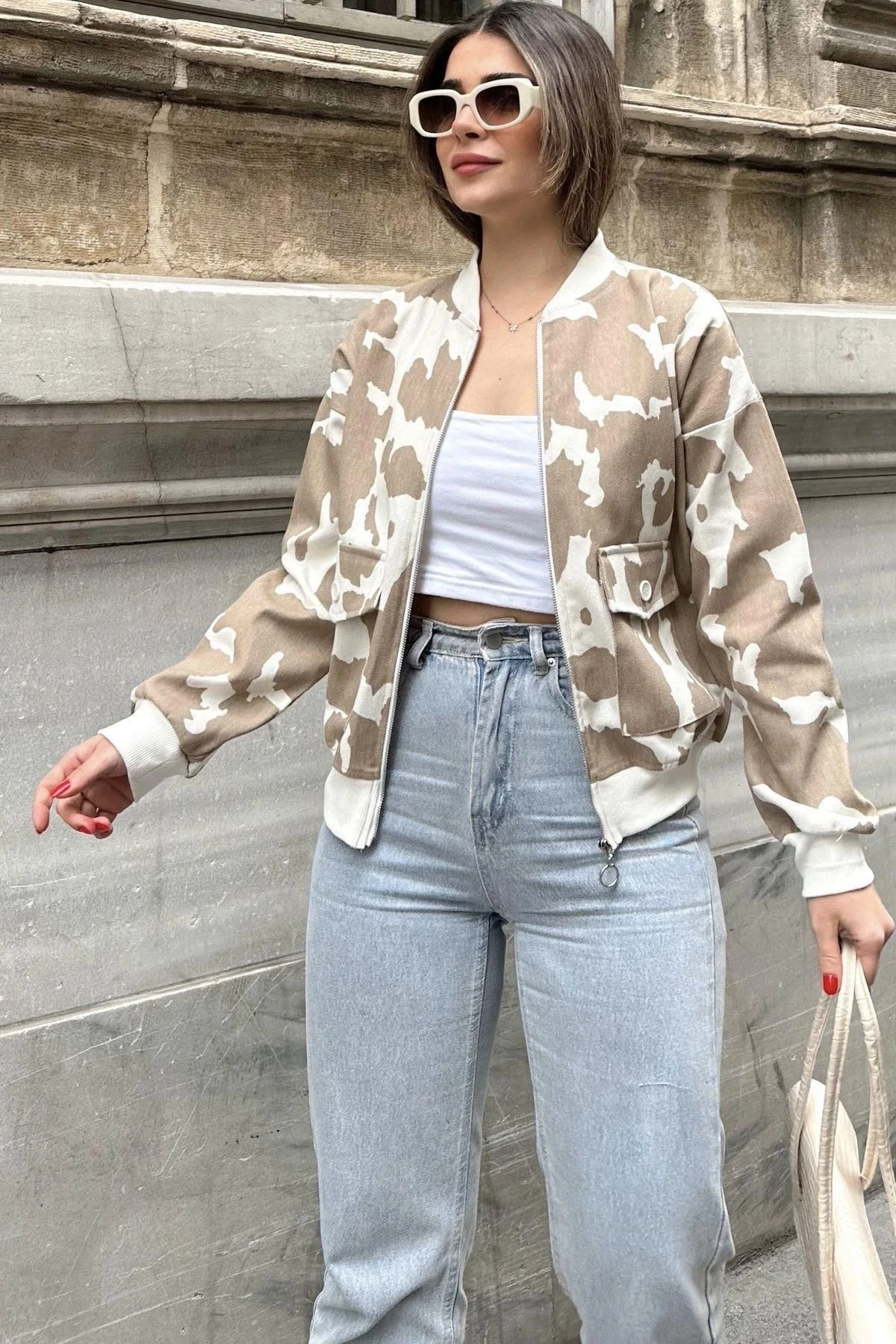 Kadın Bej Desenli Gabardin Kumaş, Rahat Kesim, Kapaklı Cepli, Bomber Ceket