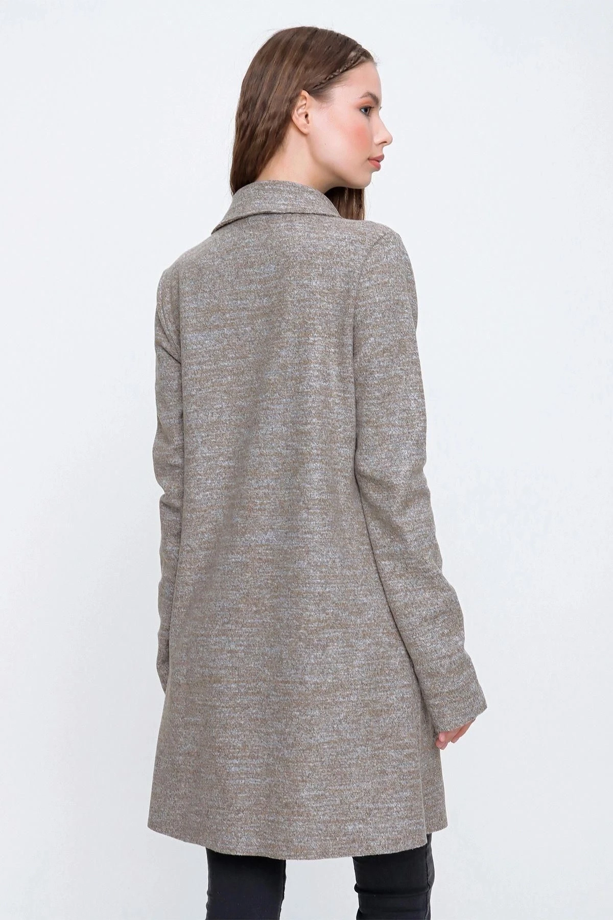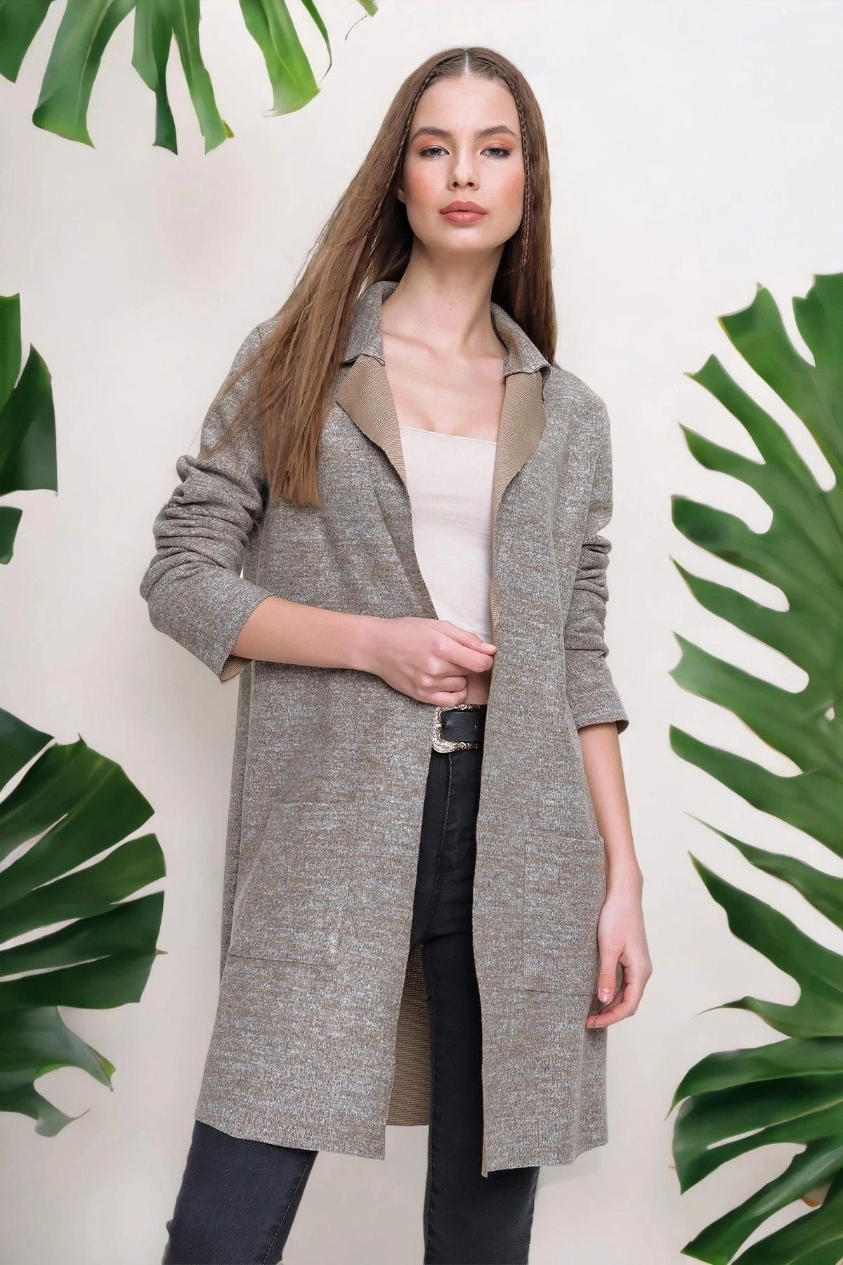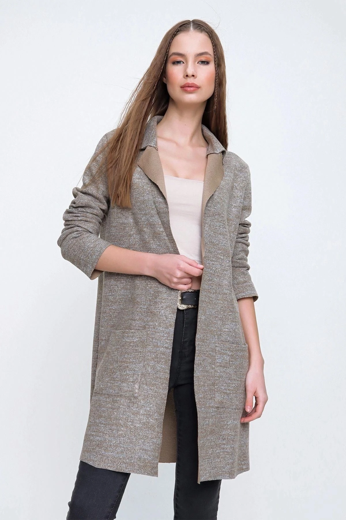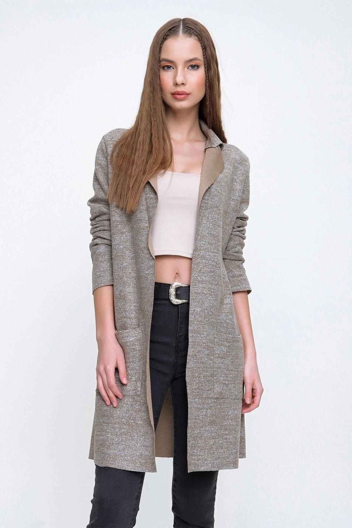Kadın Bej Dokulu Çift Cep Uzun Ceket Hırka Uzun Kol - Tesettüre Uygun