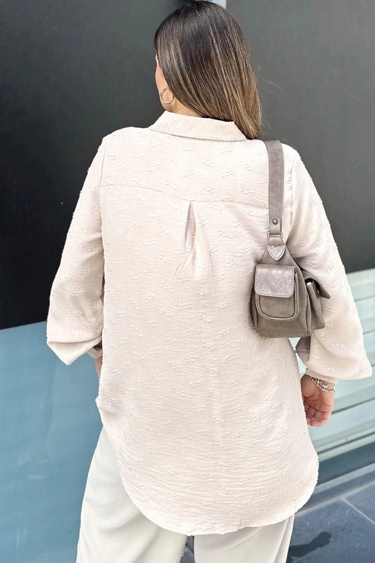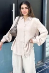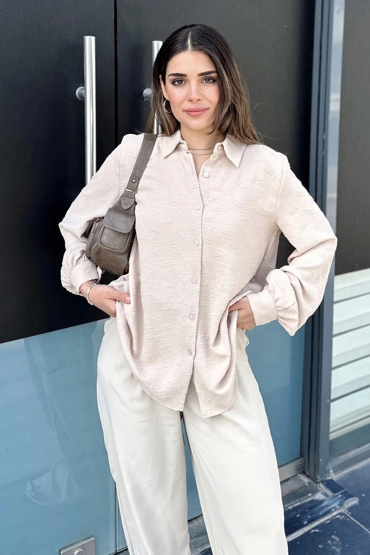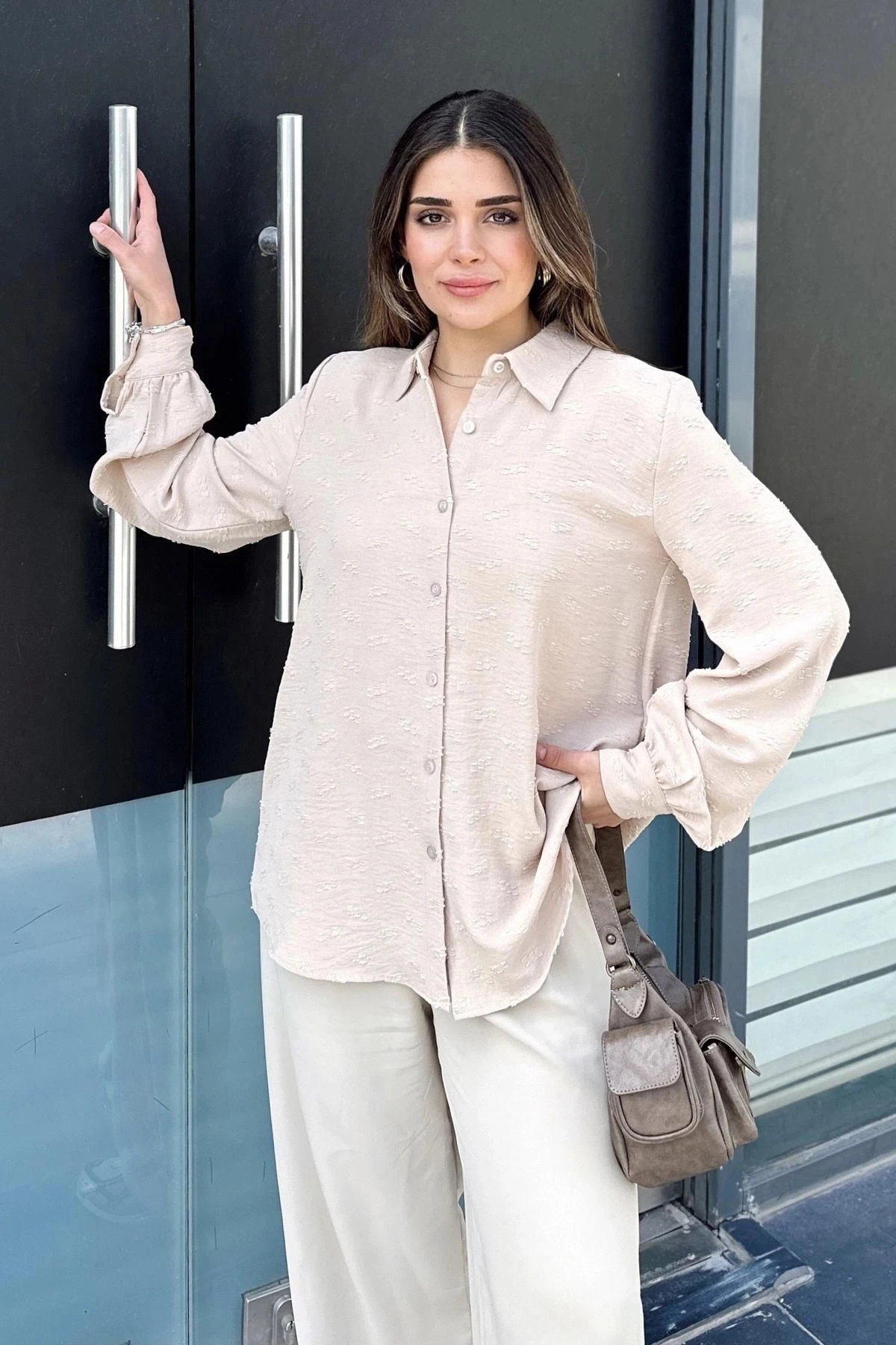 Kadın Bej Dokulu Kumaş, Uzun, Balon Kollu, Rahat Kesim, Pamuklu Gömlek