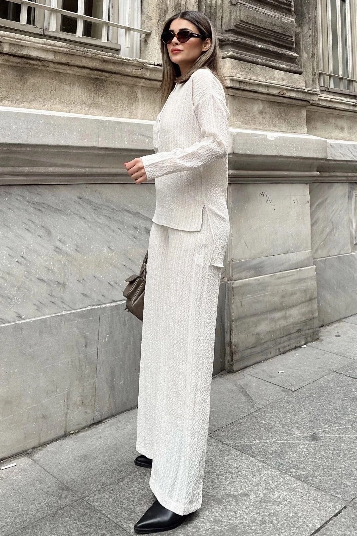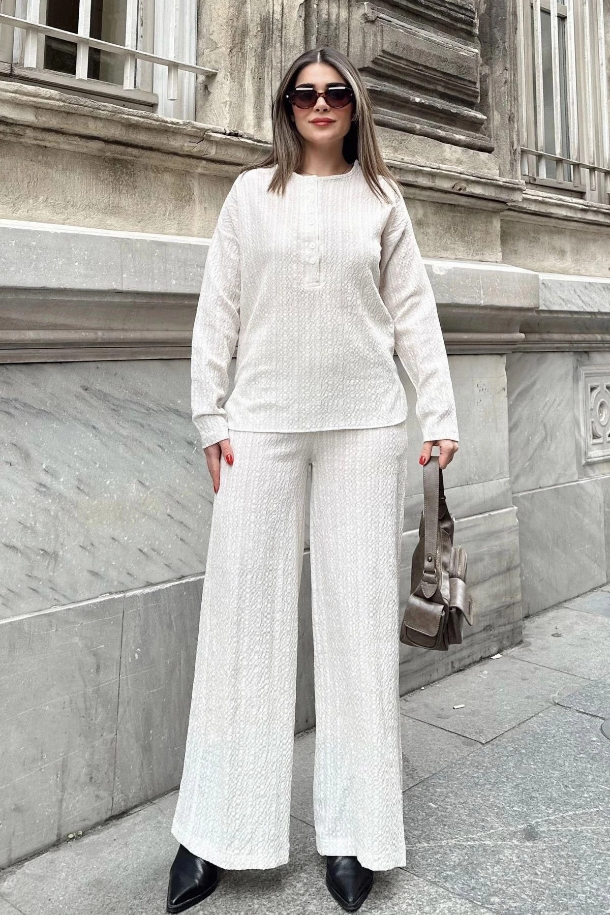 Kadın Bej Düğmeli Yuvarlak Yaka Bluz & Beli Lastikli Geniş Paça Pantolon - Salaş Maya Takım