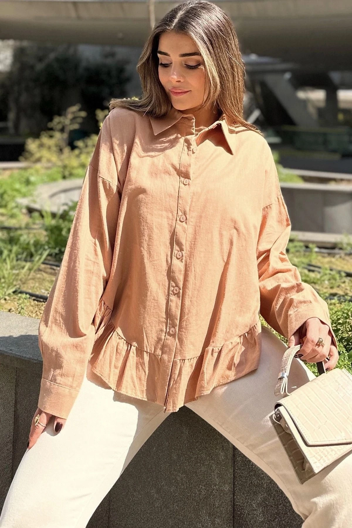 Kadın Bej Eteği Fırfır Ve Yırtmaç Detaylı, Terletmez Rahat Kumaş, Salaş Gömlek ( Pamuklu Keten)