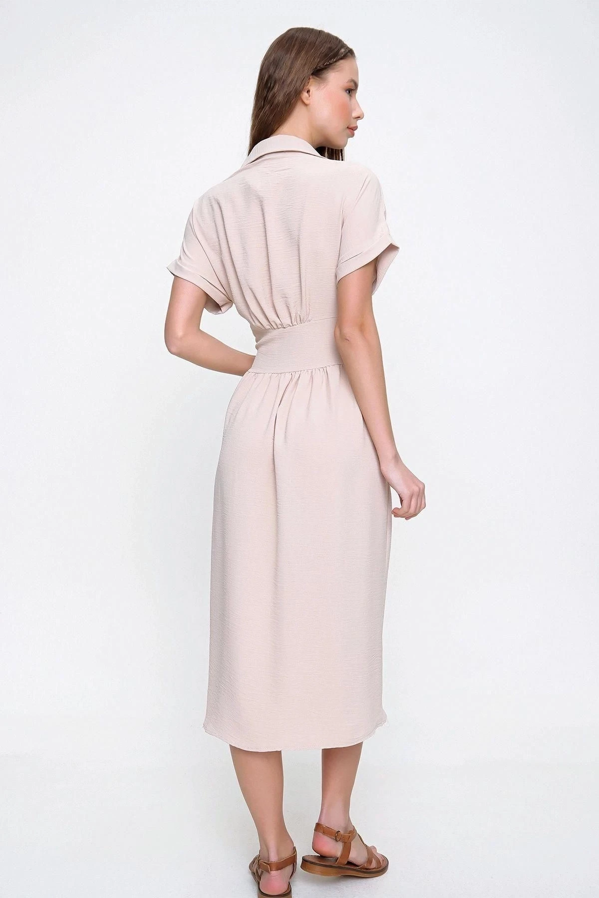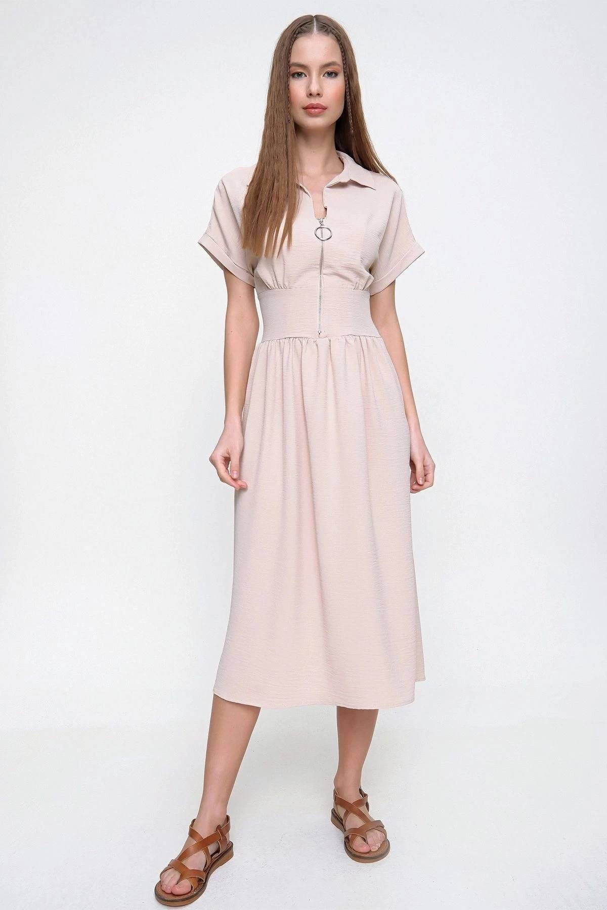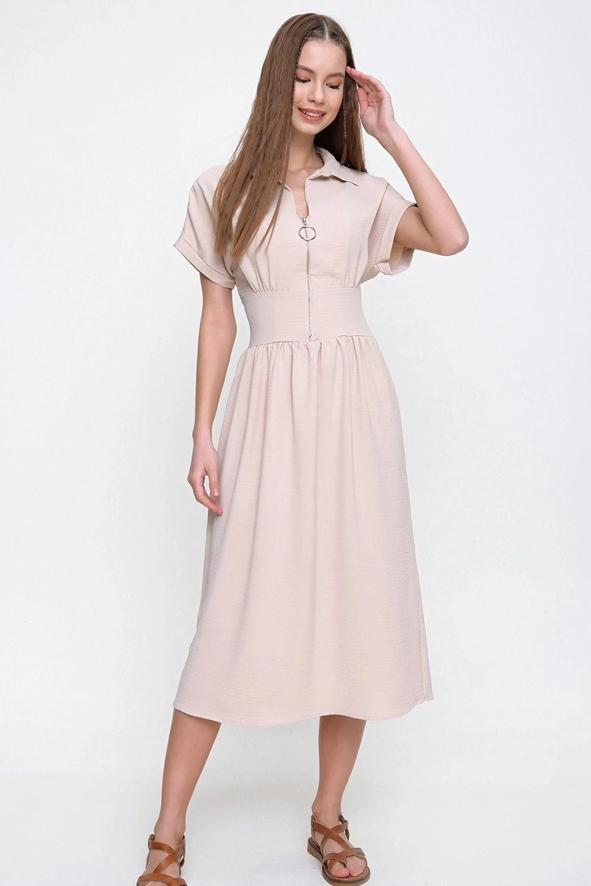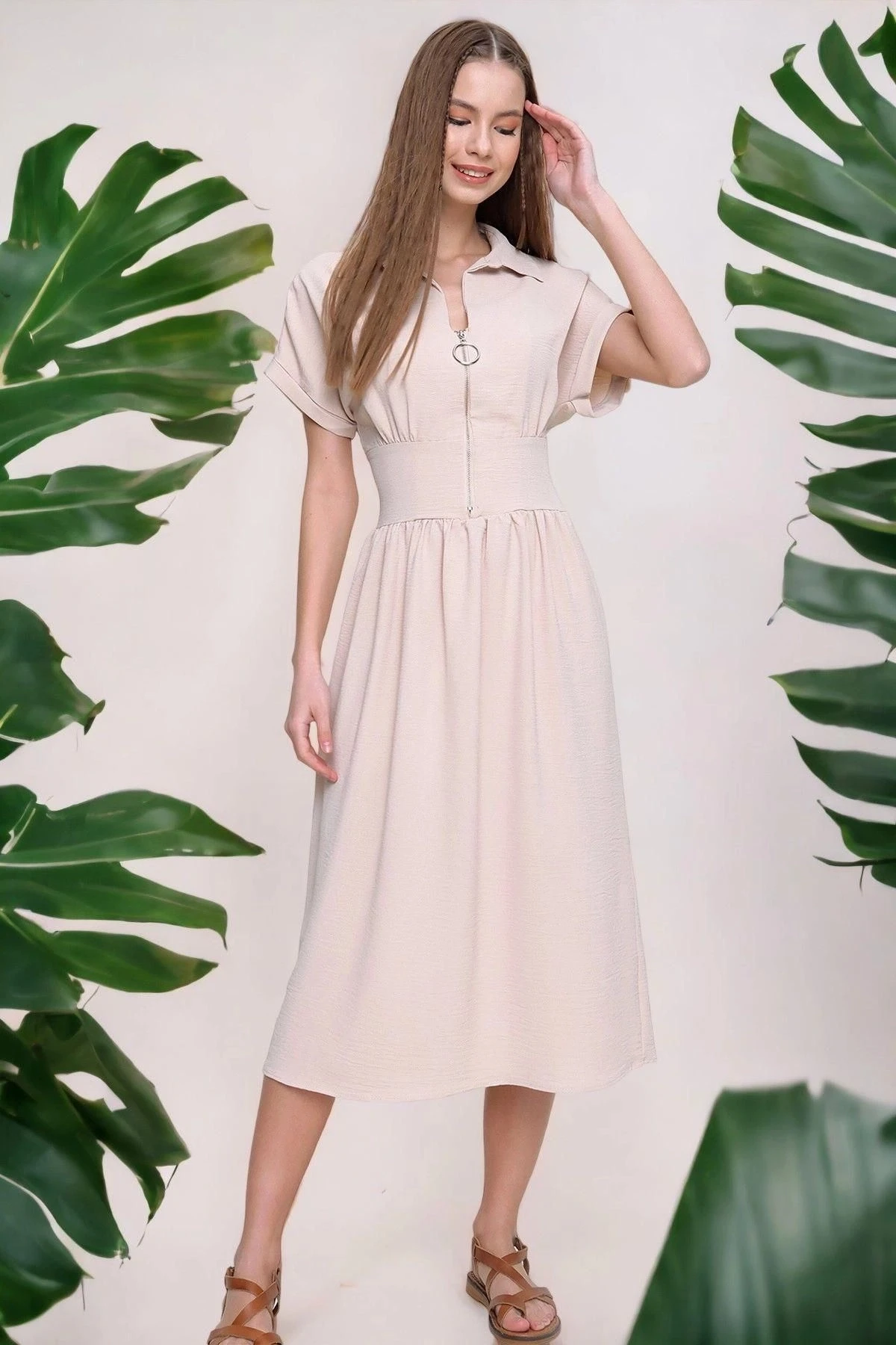 Kadın Bej Fermuarlı Beli Büzgülü Airobin Polo Yaka Elbise Maksi Boy Uzun Rahat Ve Günlük