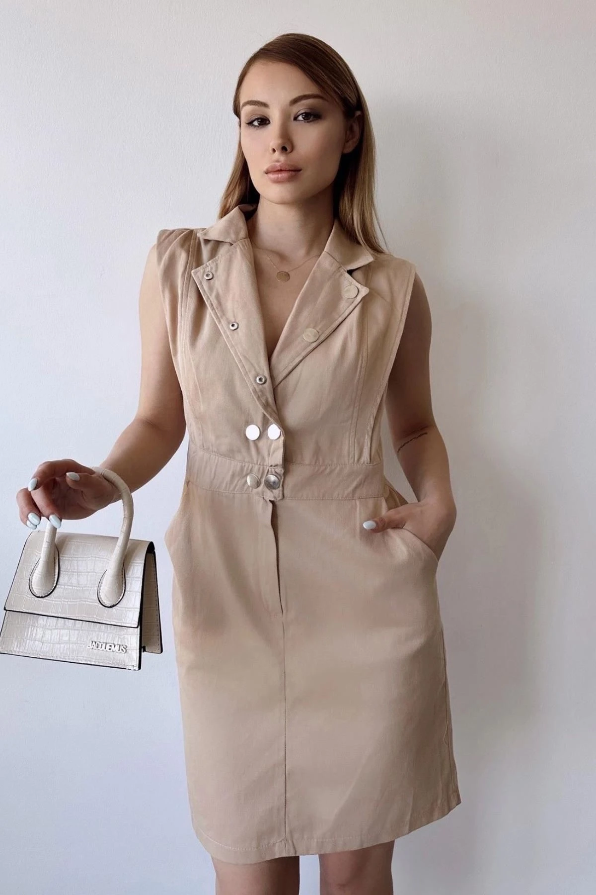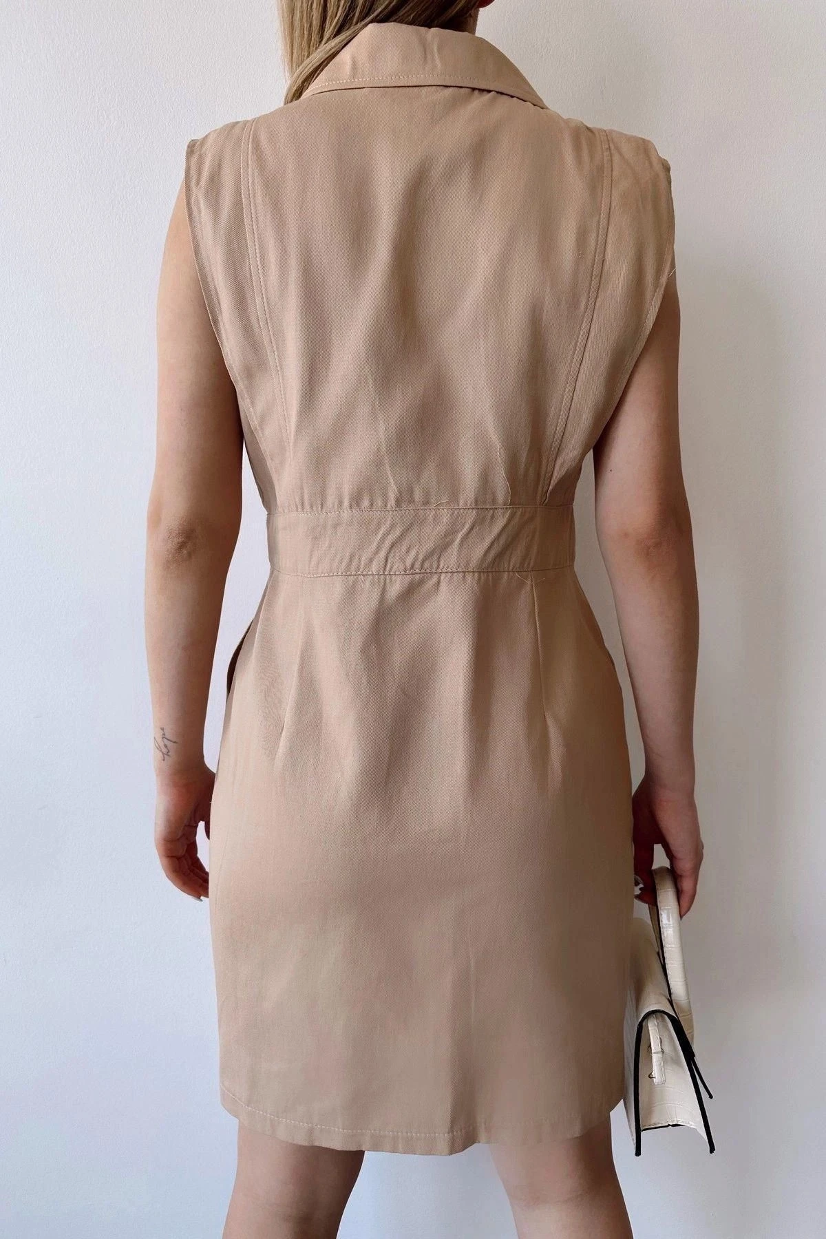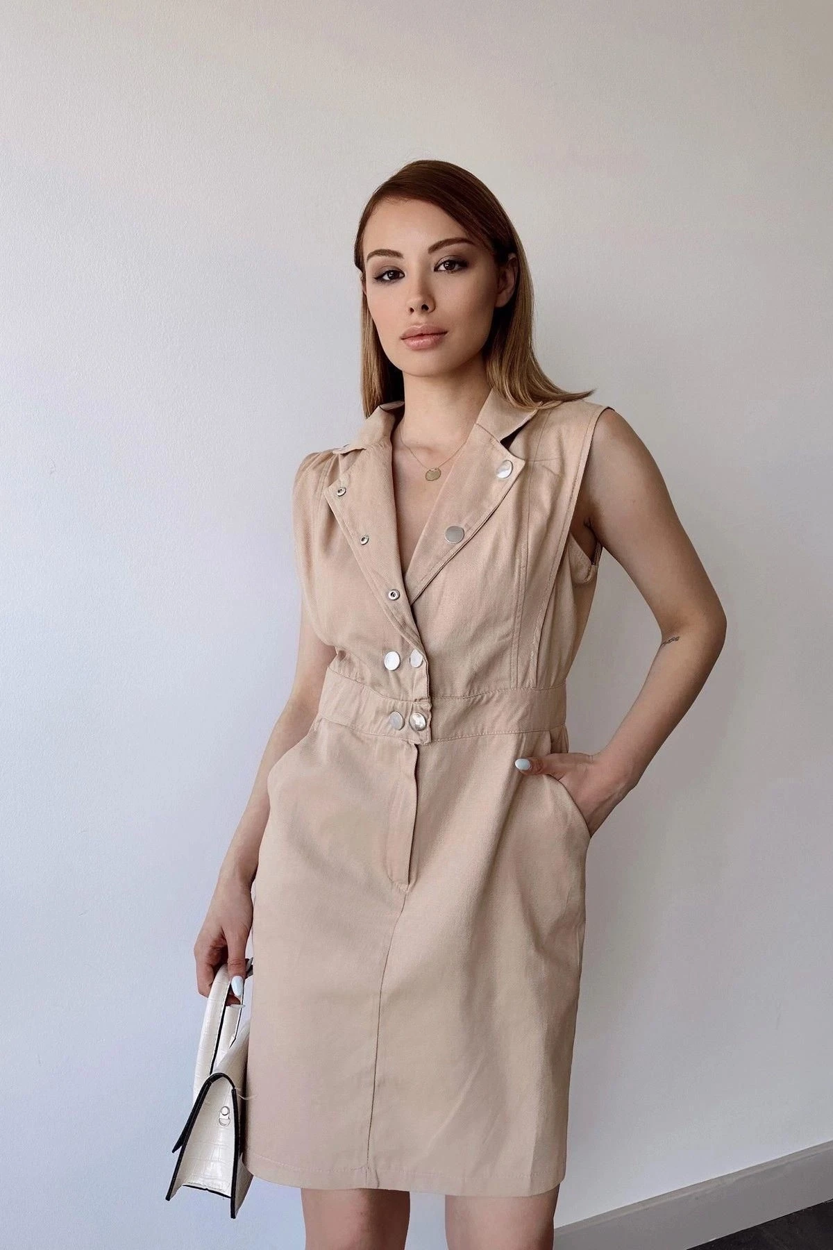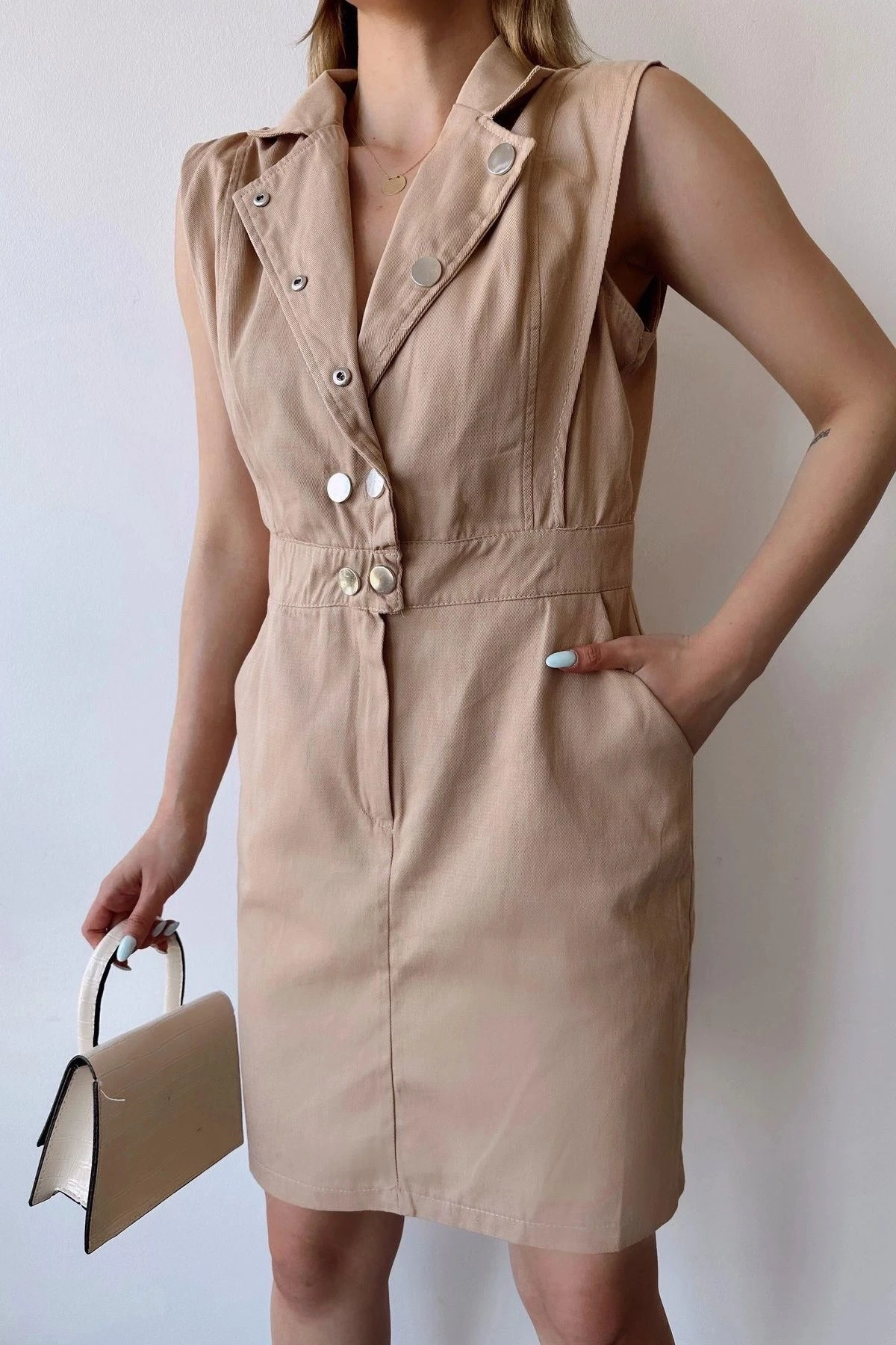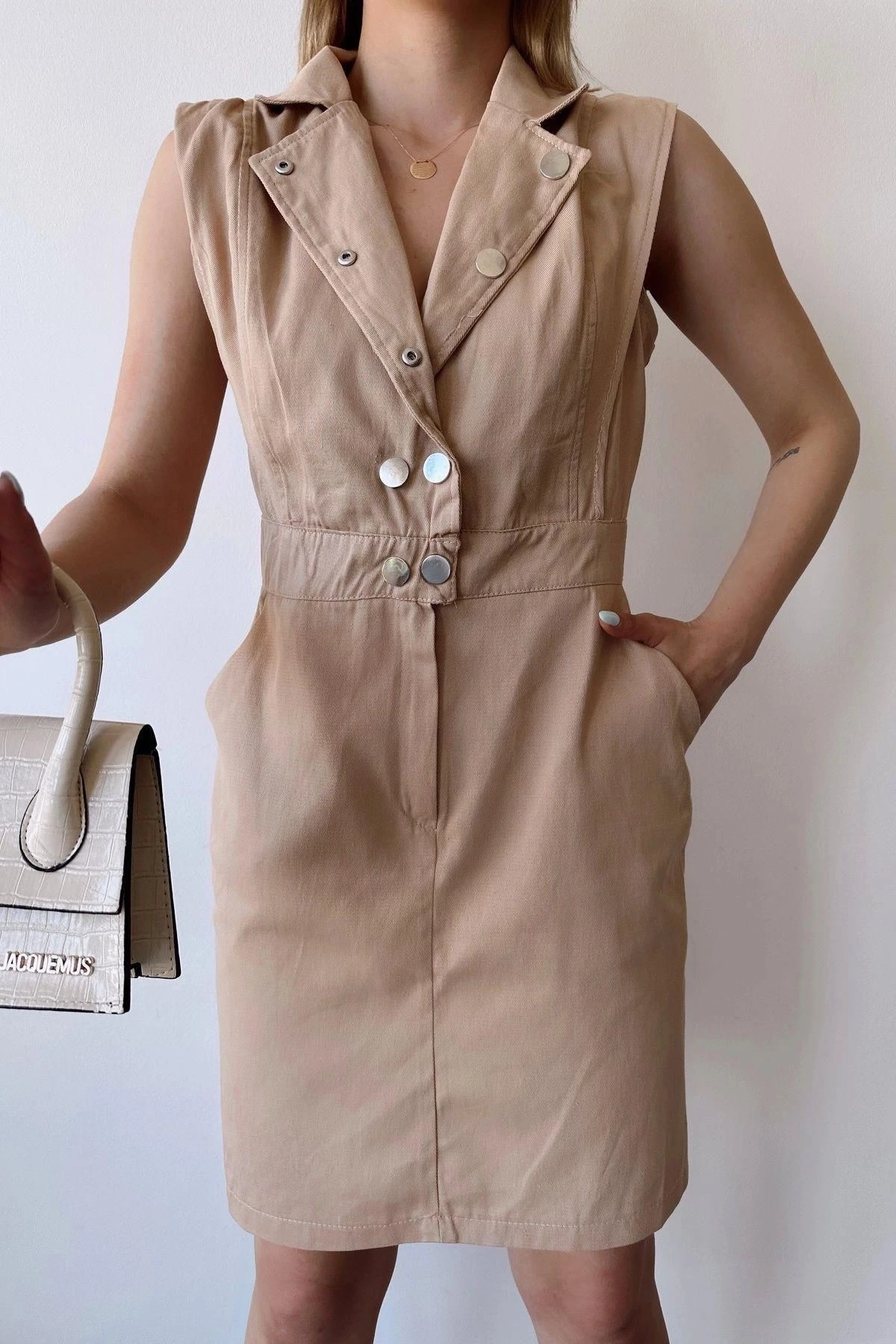Bu kadın bej kalın askılı mini elbise, zarif ve şık bir görünüm için mükemmel bir seçimdir.; İlk olarak, %100 pamuk kumaştan üretilmiştir.; Bu, elbisenin doğal, yumuşak ve nefes alabilen bir his sunmasını sağlar.; Pamuk, cildin rahatlığını ve ferahlığını sağlayarak gün boyu konforlu bir giyim deneyimi sunar.; Elbisenin tasarımında ceket yaka tercih edilmiştir.; Bu detay, elbiseye sofistike bir hava katar ve şıklığını vurgular.; Aynı zamanda düz renk desenine sahiptir, bu da minimal ve modern bir görünüm sunar.; Bej rengi ise sakin, zarif ve çok yönlüdür, bu da elbiseyi farklı stillerle rahatlıkla kombinleyebilmenizi sağlar.; Standart kalıp ve kesime sahip olan bu mini elbise, her vücut tipine uyum sağlar ve mükemmel bir oturuş sunar.; Rahat bir şekilde hareket etmenizi sağlarken, vücudunuzun doğal hatlarını ön plana çıkarır.; Düğme detayları, elbisenin şıklığını tamamlar.; Bu detaylar, elbisenin ön kısmında bulunan düğmelerle birlikte, elbiseye hareket ve zarafet katmaktadır.; Aynı zamanda bu düğmeler, elbiseyi kolayca giyip çıkarmanıza olanak tanır.; Bu bej kalın askılı mini elbise, şık bir tarz ve rahatlık arayan kadınlar için mükemmel bir seçenektir.; Gabardin kumaşının doğal dokusu ve %100 pamuk içeriği ile bu elbise, günlük kullanımdan özel davetlere kadar her durumda stilinizi tamamlamak için idealdir.; Şıklığı ve konforu bir araya getiren bu elbise, gardırobunuzun vazgeçilmez parçalarından biri olacak.