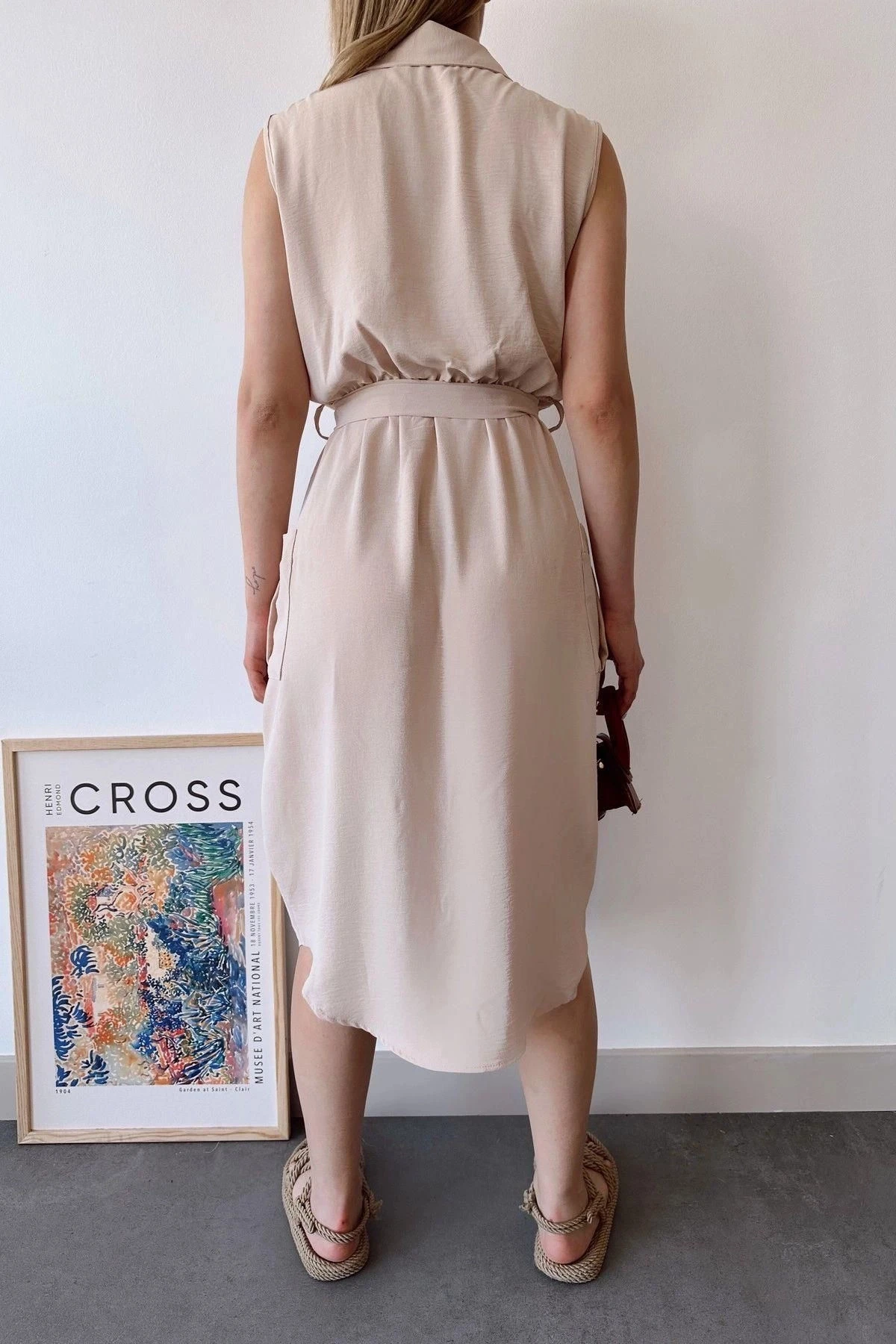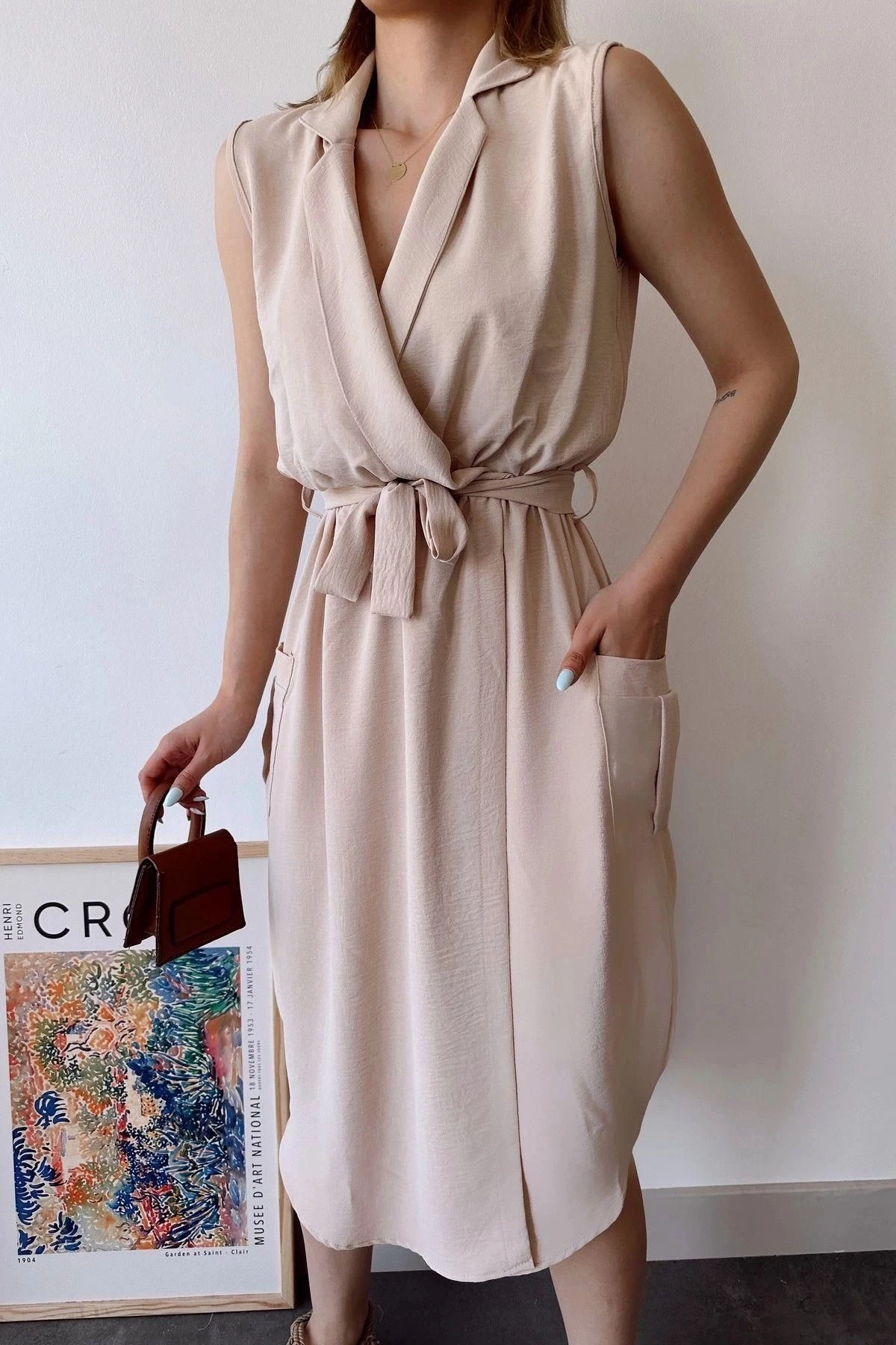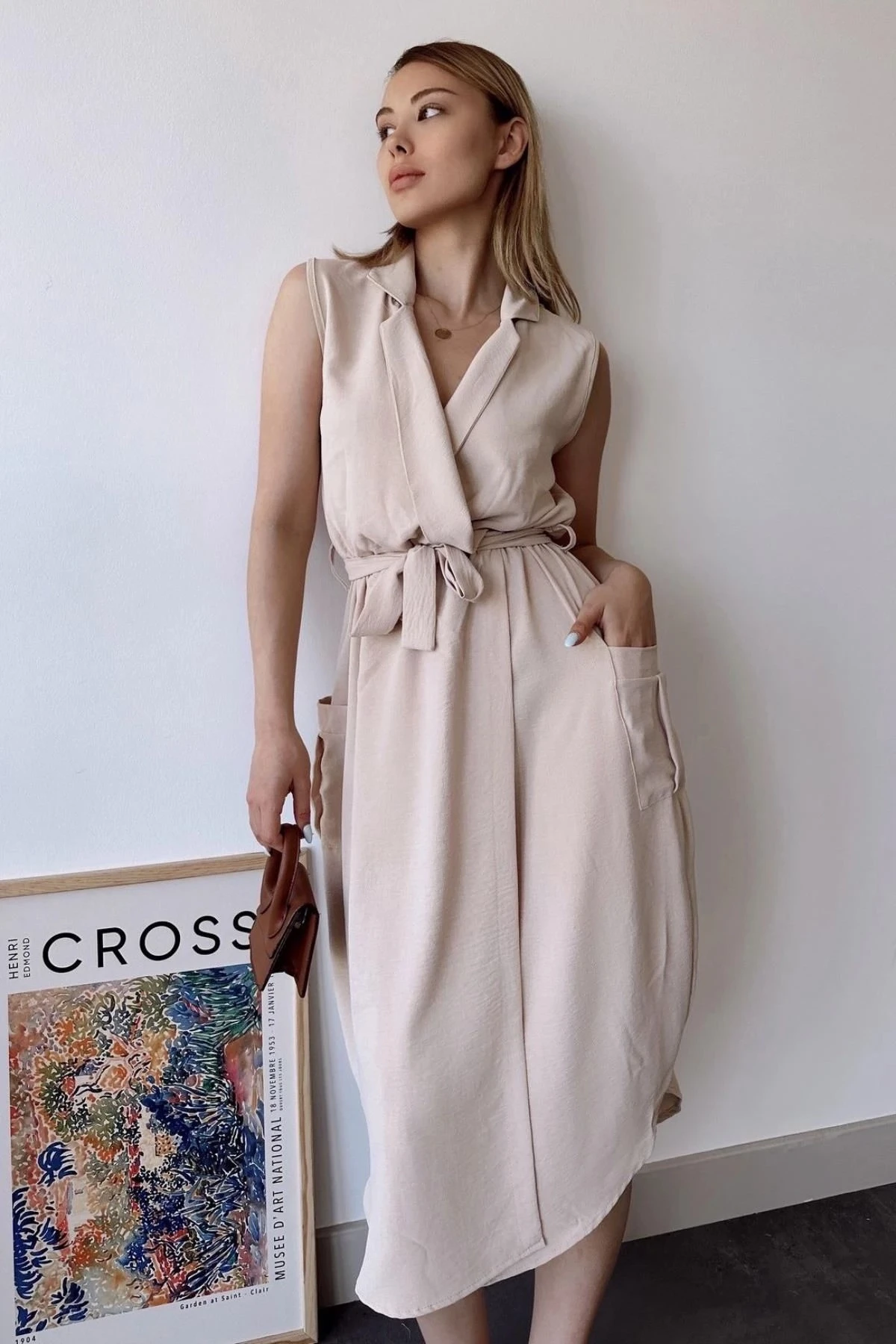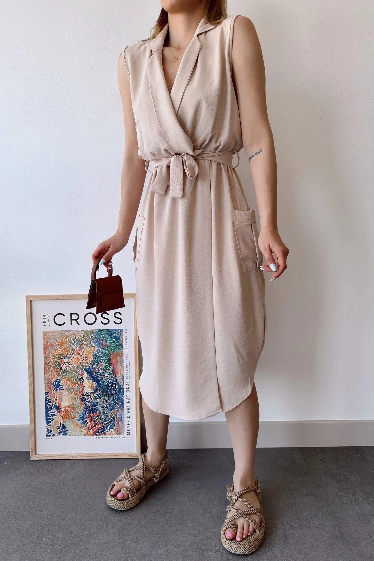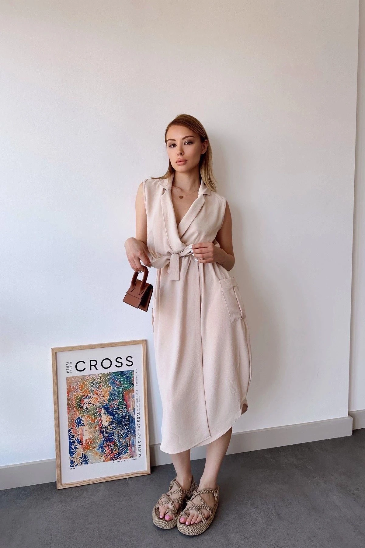 Bu kadın bej kalın askılı midi elbise, rahatlık ve şıklığı bir araya getiren bir tercih sunuyor.; İlk olarak, %60 polyester ve %40 pamuk karışımından oluşan bir kumaş kullanılmıştır.; Bu kombinasyon, elbiseye dayanıklılık ve yumuşaklık sağlarken aynı zamanda nefes alabilen bir yapı sunar.; Polyester, kırışıklıklara karşı dirençli olup kolay bakım sağlarken, pamuk ise doğal bir his ve konfor sunar.; Elbisenin tasarımında kruvaze yaka kullanılmıştır.; Bu detay, elbiseye zarif bir görünüm katar ve vurgulanan dekolte bölgesiyle dikkat çeker.; Düz deseni ise sade ve minimalist bir tarz sunar.; Bej rengi, sıcak ve yumuşak bir ton olup, herhangi bir mevsimde giyilebilir.; Bu renk, elbiseyi farklı aksesuarlar ve ayakkabılarla kolaylıkla tamamlayabileceğiniz çok yönlü bir seçenek haline getirir.; Relaxed kalıp ve kesime sahip olan bu midi elbise, rahat bir oturuş sağlar ve vücudun doğal hatlarını kucaklar.; Giyen kişiye geniş bir hareket özgürlüğü sunar ve gün boyu konforlu bir deneyim yaşatır.; Yırtmaç detayı, elbiseye hareketlilik ve feminen bir dokunuş katarken, aynı zamanda bacağın serbestçe hareket etmesine olanak tanır.; Elbisenin belinde bir kemer detayı bulunur.; Bu kemer, beli vurgular ve elbiseye şekil verir.; Aynı zamanda kişisel tercihinize bağlı olarak kemerin pozisyonunu ayarlayabilirsiniz, böylece farklı stiller yaratabilirsiniz.; Bu bej kalın askılı midi elbise, konfor ve stil arayan kadınlar için mükemmel bir seçenektir.; Aerobin kumaşının hafifliği ve karışım içeriği ile bu elbise, günlük giyimden özel etkinliklere kadar her durumda şık ve rahat bir seçenektir.; Kruvaze yaka, yırtmaç detayı ve kemer ile birleşen tasarımıyla bu elbise, gardırobunuzun favori parçalarından biri olacak.