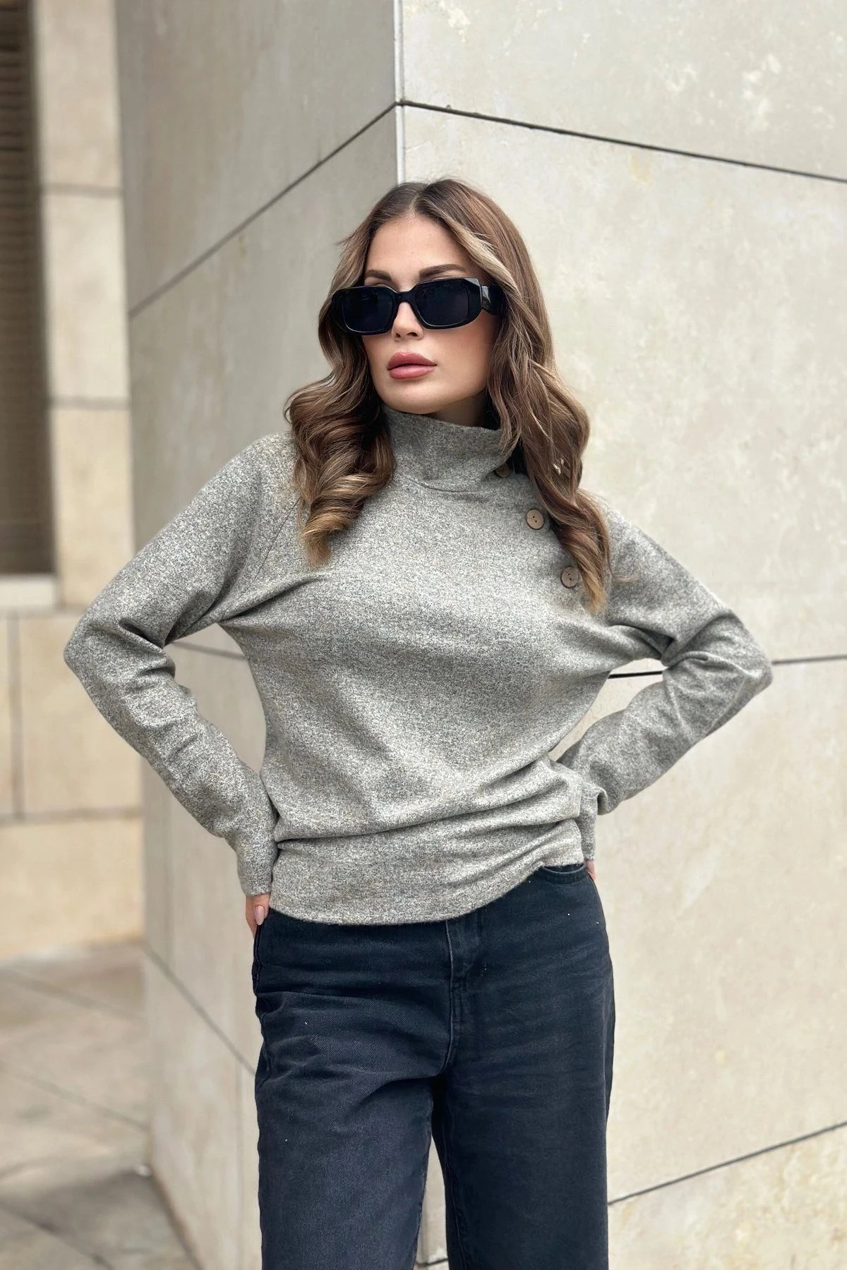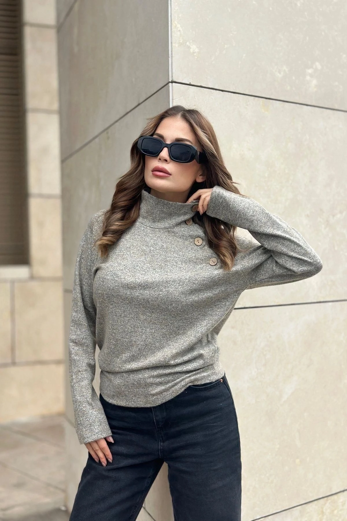 Kadın Bej Kendinden Desenli, Yumoş Kumaş, Uzun Kol, Düğme Detaylı, Boğazlı Bluz