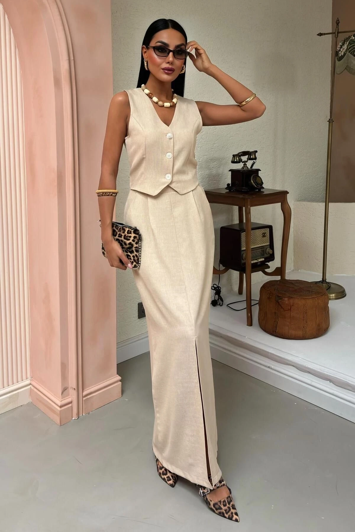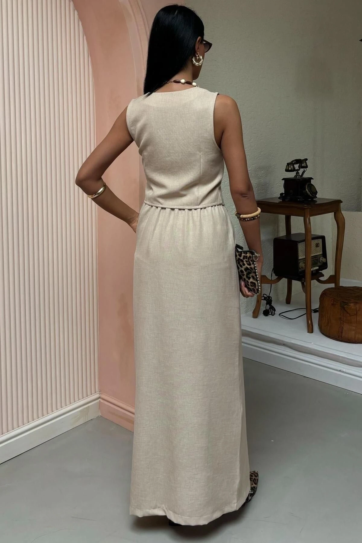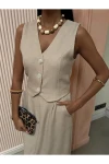 Kadın Bej Keten Düz V Yaka Kolsuz Takım